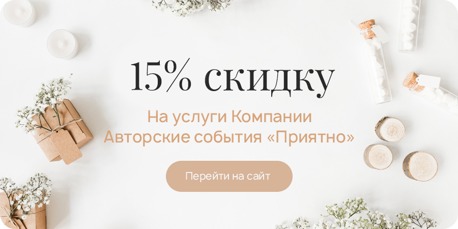 Мы ценим каждого нашего клиента и стремимся сделать сотрудничество максимально выгодным и приятным. Специально для наших постоянных клиентов мы предлагаем уникальные условия — VIP-скидку в размере 15 % на услуги оформления торжества цветами, шарами и декором.