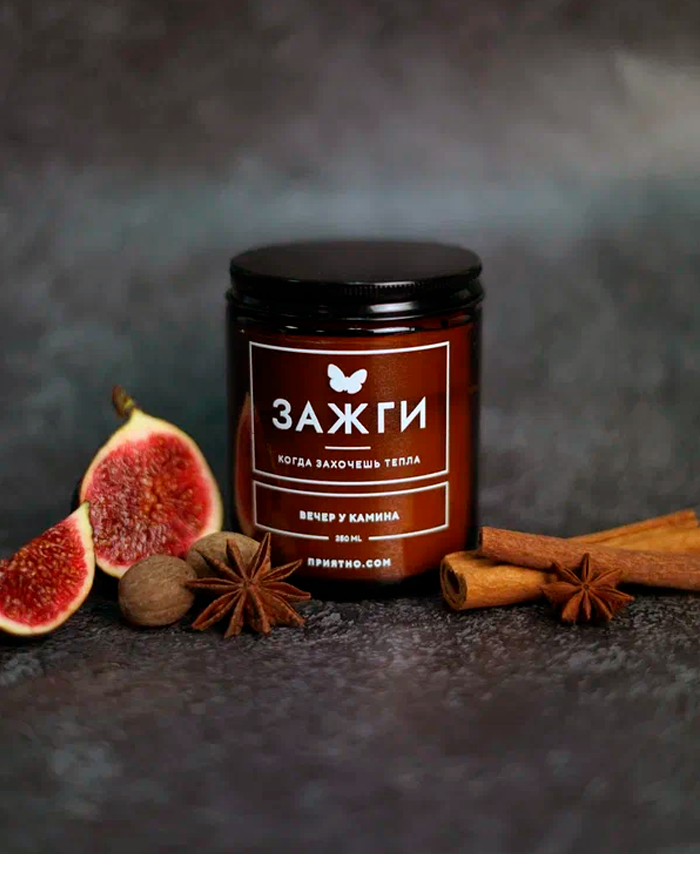 ЗАЖГИ свечу в стекле из 100% соевого воска с ароматом “Вечер у камина”. Представьте, за окном шумит дождь или кружится вьюга, но в своем уютном пледе у камина вы чувствуете себя спокойно. Камин согревает комнату, и в нем потрескивают горящие дрова, отбрасывая искры!