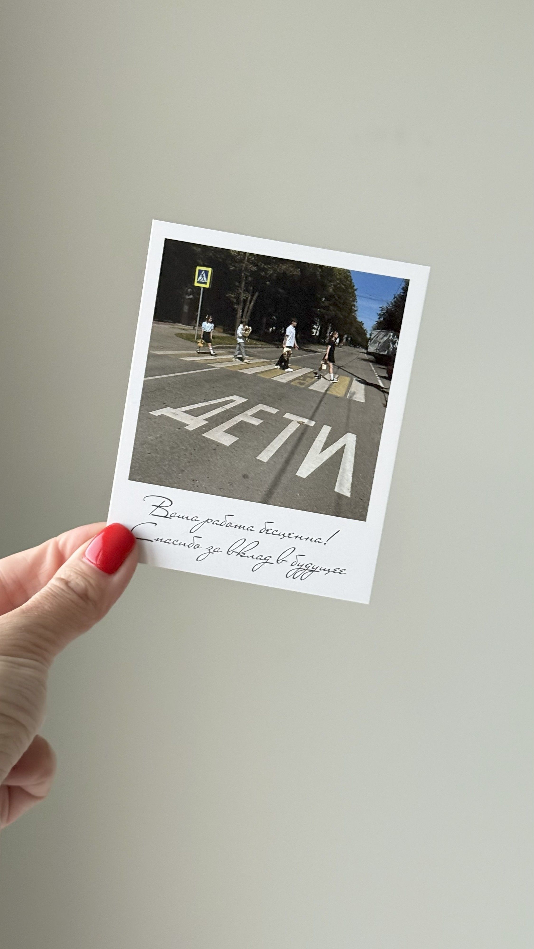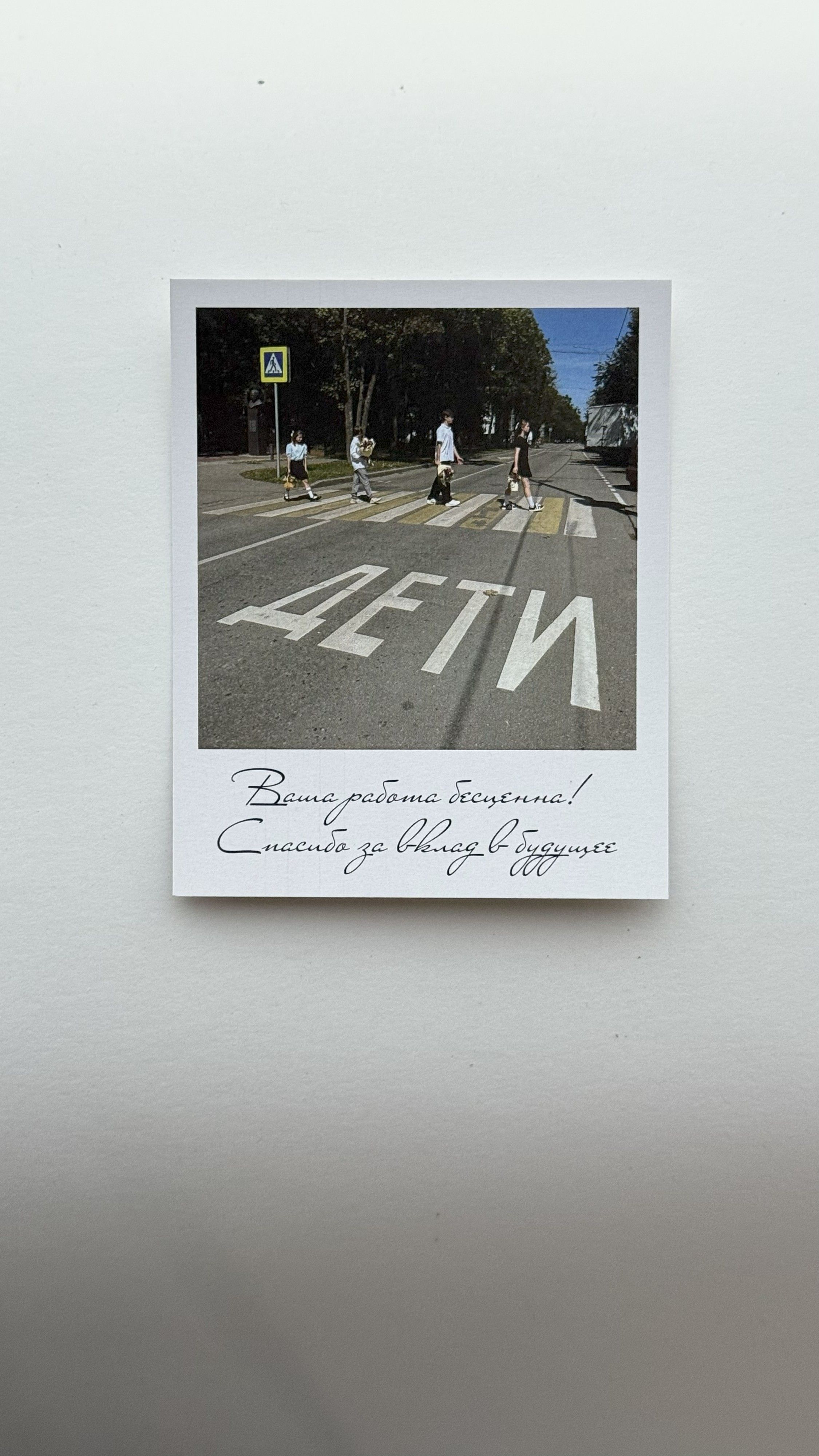 В основе дизайна — культовое изображение, но с важной и трогательной деталью: перед пешеходным переходом крупно написано слово «ДЕТИ». Это сразу расставляет акценты: главная ценность и цель вашего труда — они, будущее, которое вы строите каждый день. Стиль винтажной фотографии и лаконичные слова благодарности создают warm и искреннее послание.