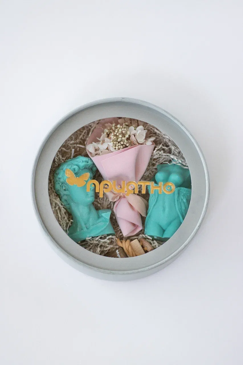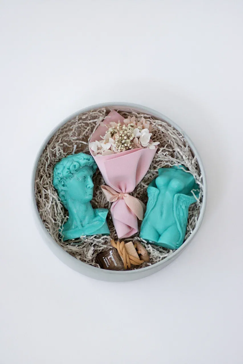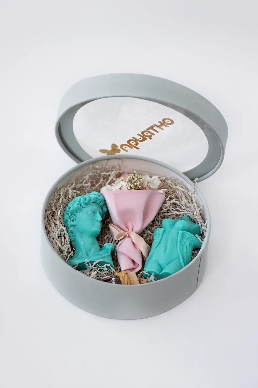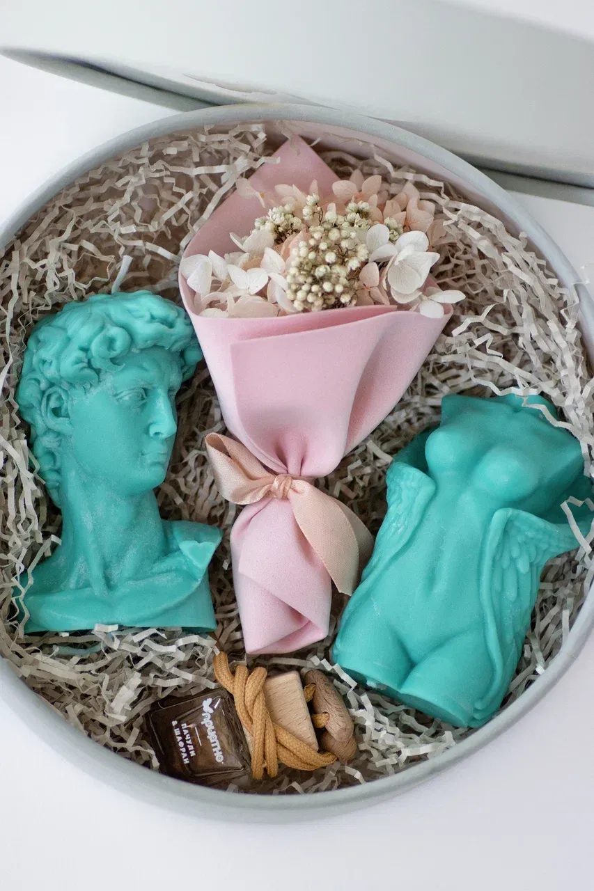 В комплект входят две свечи в виде голов Давида и ангела Эльзы, которые украсят интерьер и создадут атмосферу уюта и тепла. Также в наборе вы найдёте ароматизатор для автомобиля, наполняющий салон неповторимым ароматом, и изысканный мини-букет из стабилизированных цветов.