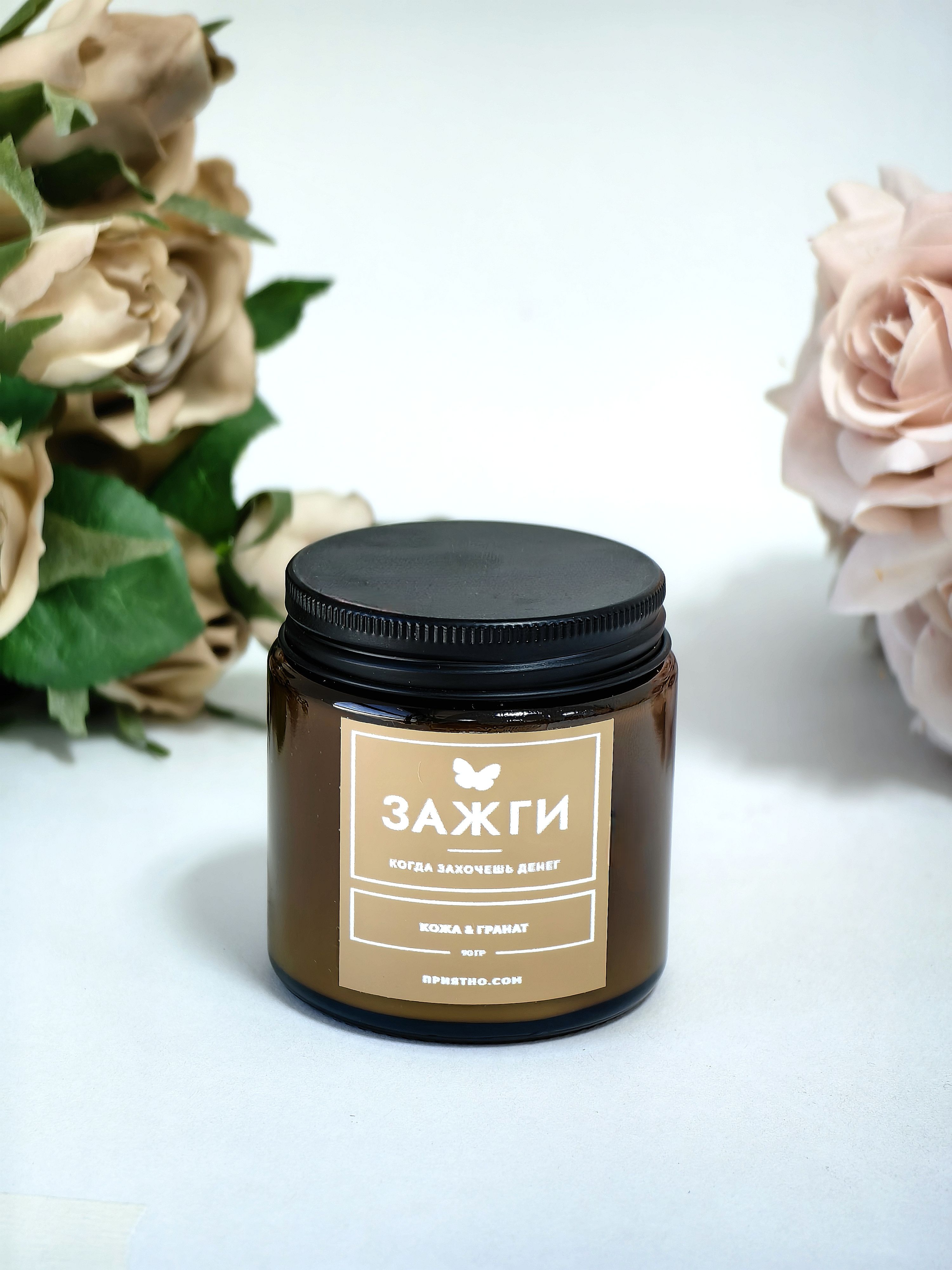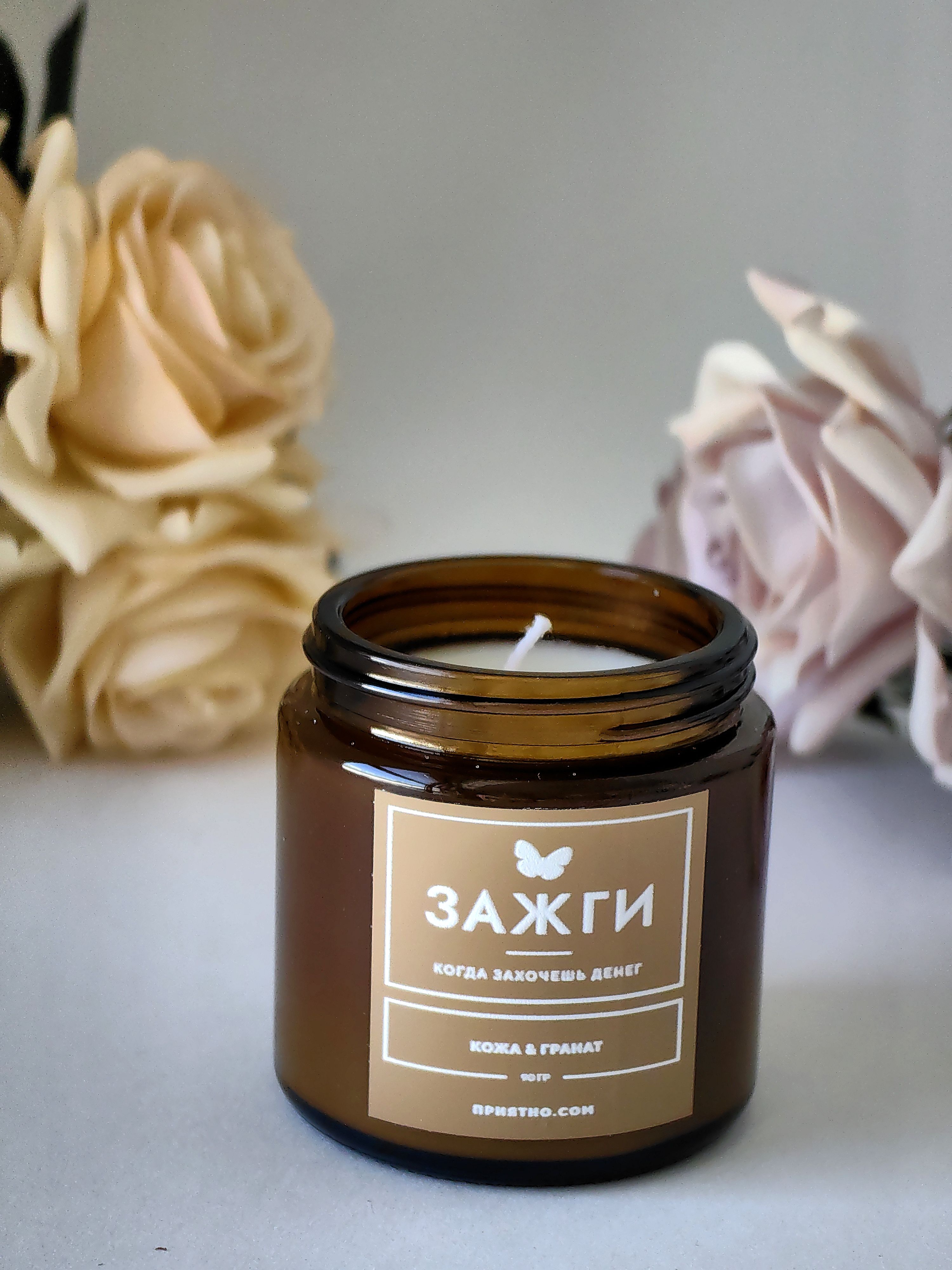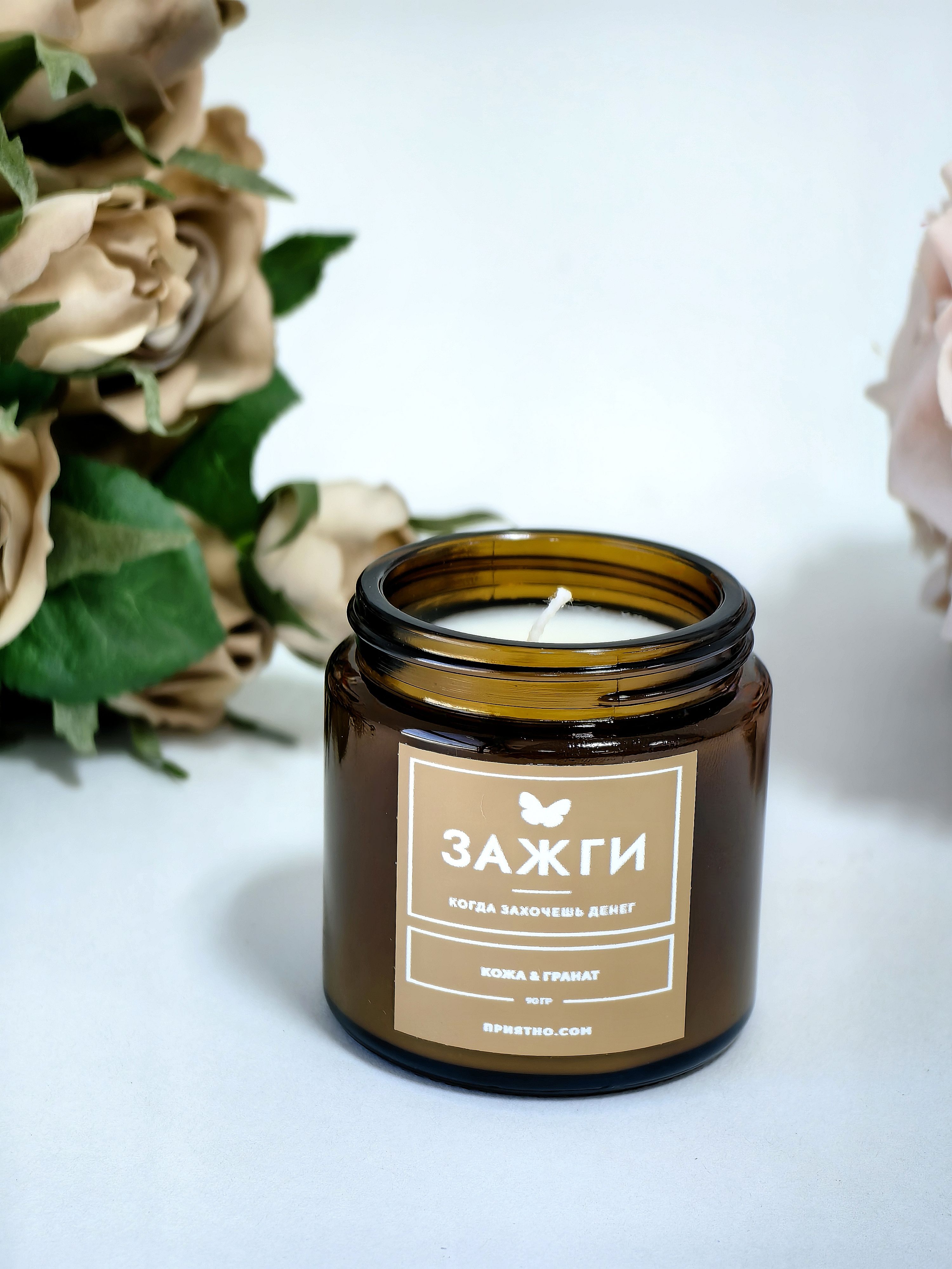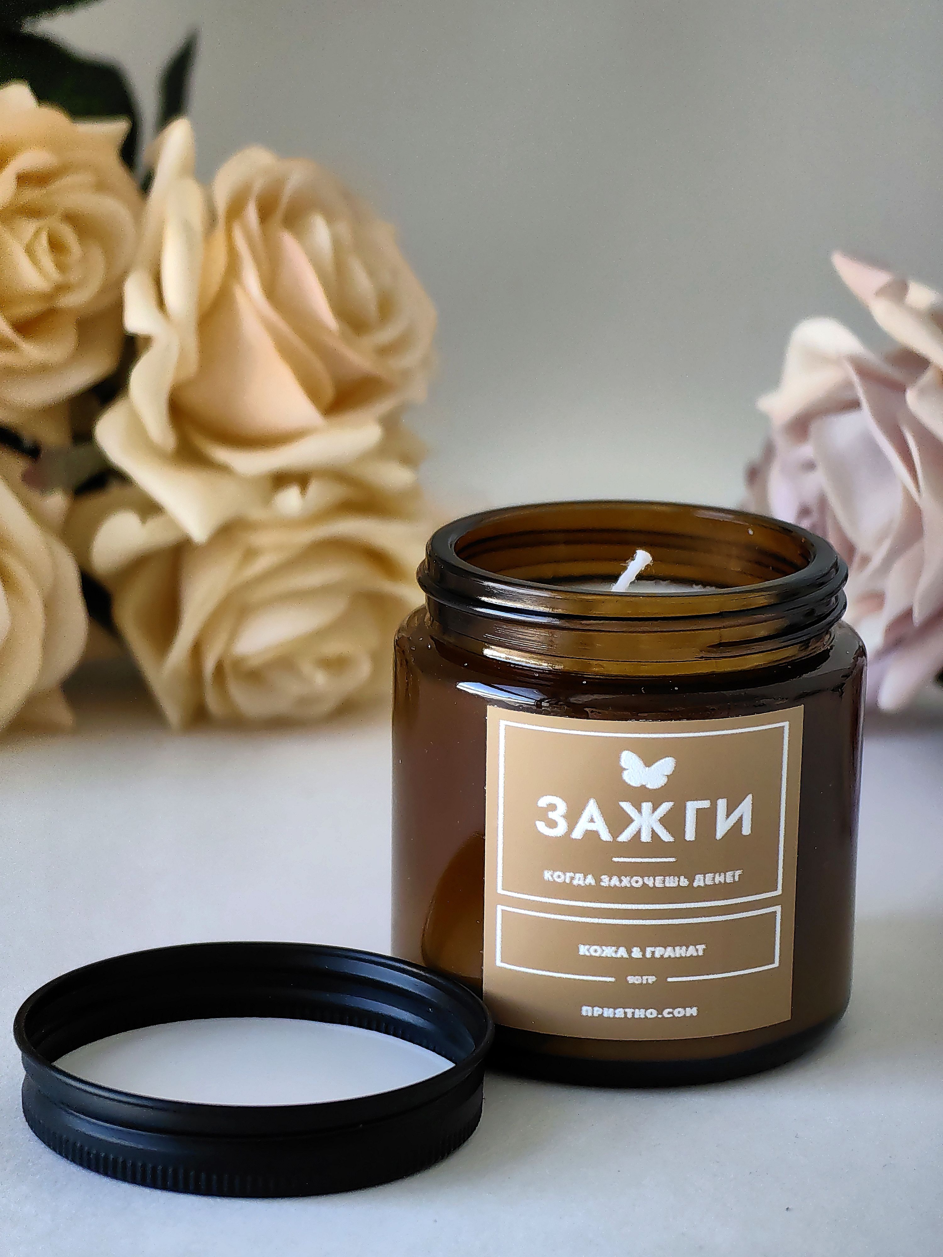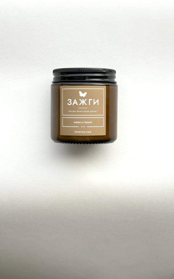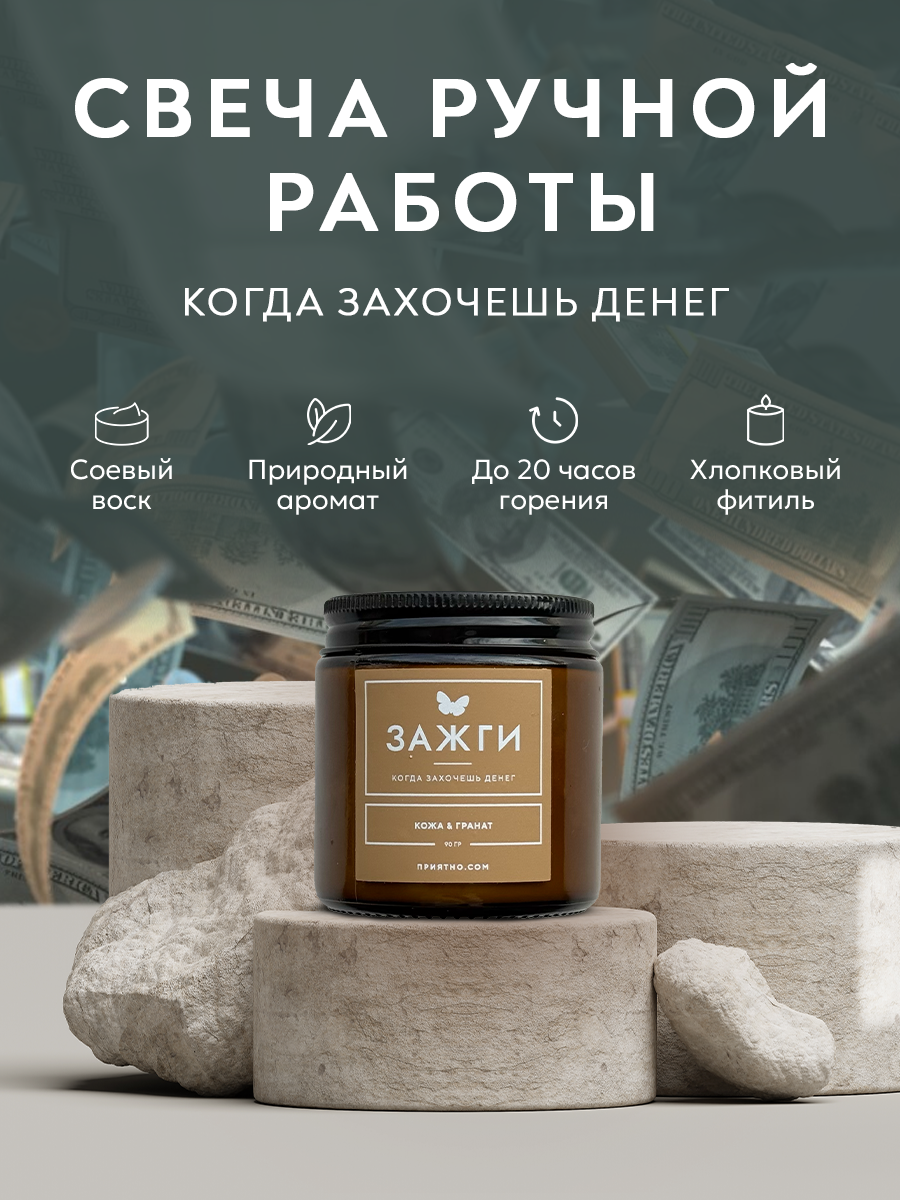Ароматическая свеча - "ЗАЖГИ" | «Когда захочешь денег» | "Кожа & Гранат"