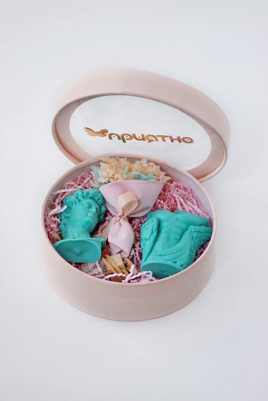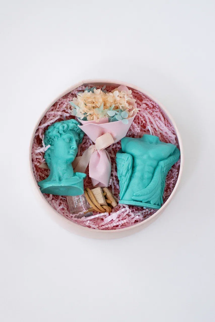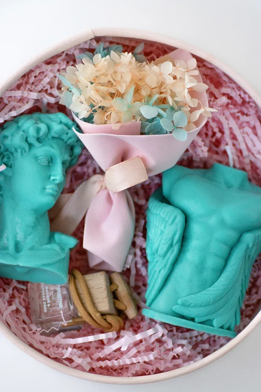 В состав набора входят две свечи в форме головы Давида и ангела Габриэля, которые станут отличным украшением интерьера и создадут атмосферу уюта и тепла. Также в наборе вы найдёте автопарфюм, который наполнит салон автомобиля неповторимым ароматом, и ароматный мини-букет со стабилизированными цветами.