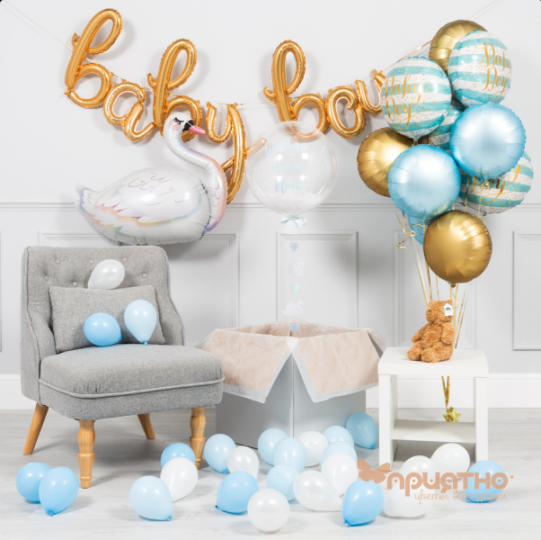 1 x фонтан из фольгированных шаров (6 шаров: 2 шара голубого цвета, 2 шара золотистого цвета, 2 шара в полоску с надписью Baby boy)