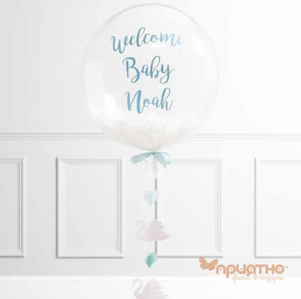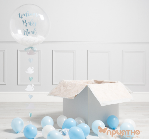 1 х большой шар Баблс с надписью, на атласной ленте, с наполнением голубыми пёрышками