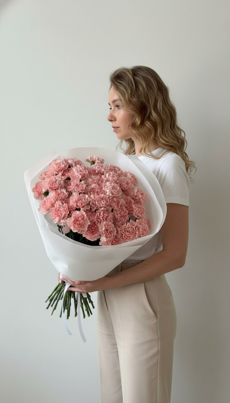 Откройте для себя гвоздику заново. Наш букет «Шёпот Восхищения» — это история о современной романтике, где ценится изящество, стойкость и глубина. Каждый пушистый бутон элитного сорта, окрашенный в нежнейший розовый градиент, излучает тепло, нежность и безмолвное восхищение. Это умный и изысканный выбор для тех, кто дарит эмоции, которые останутся надолго.