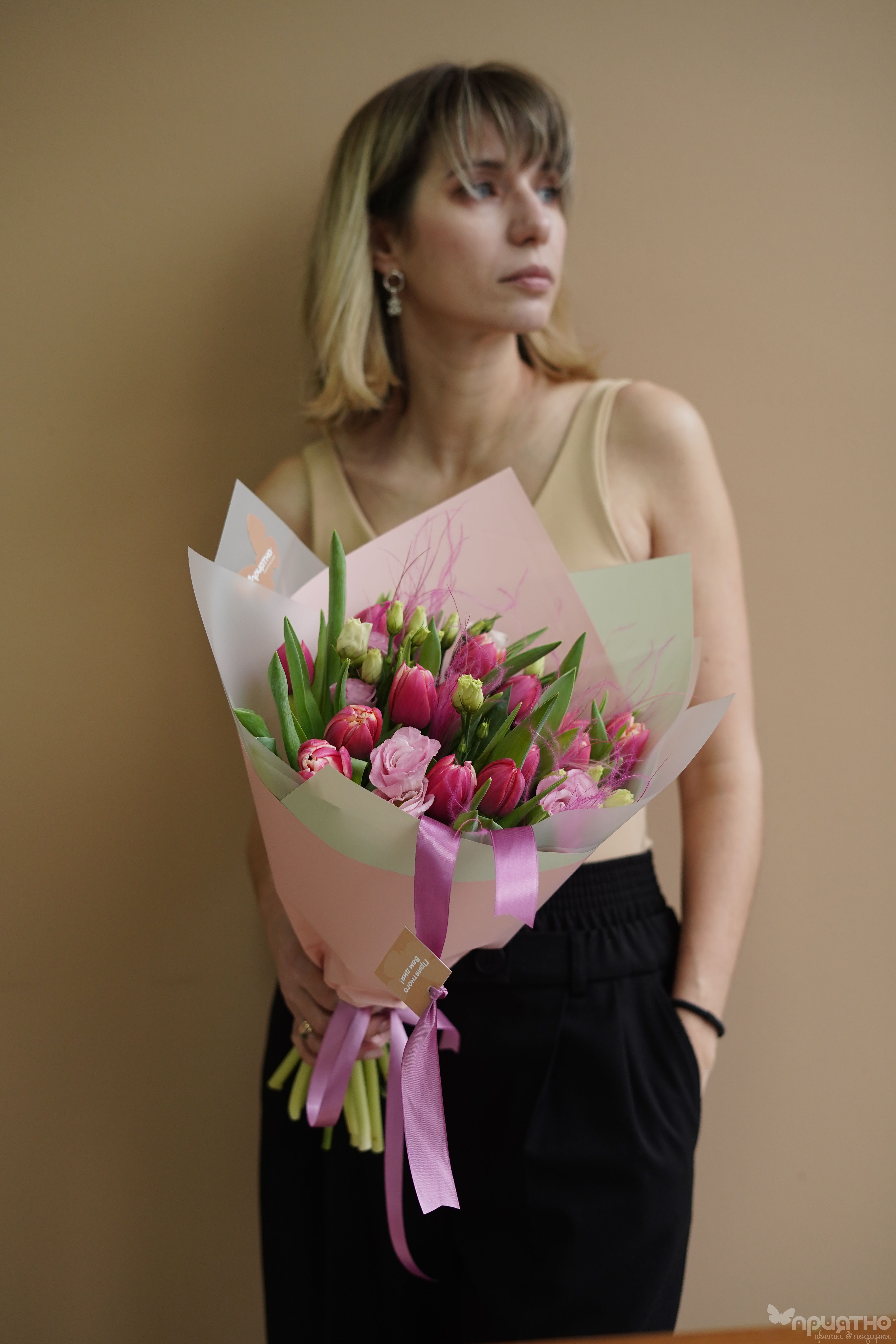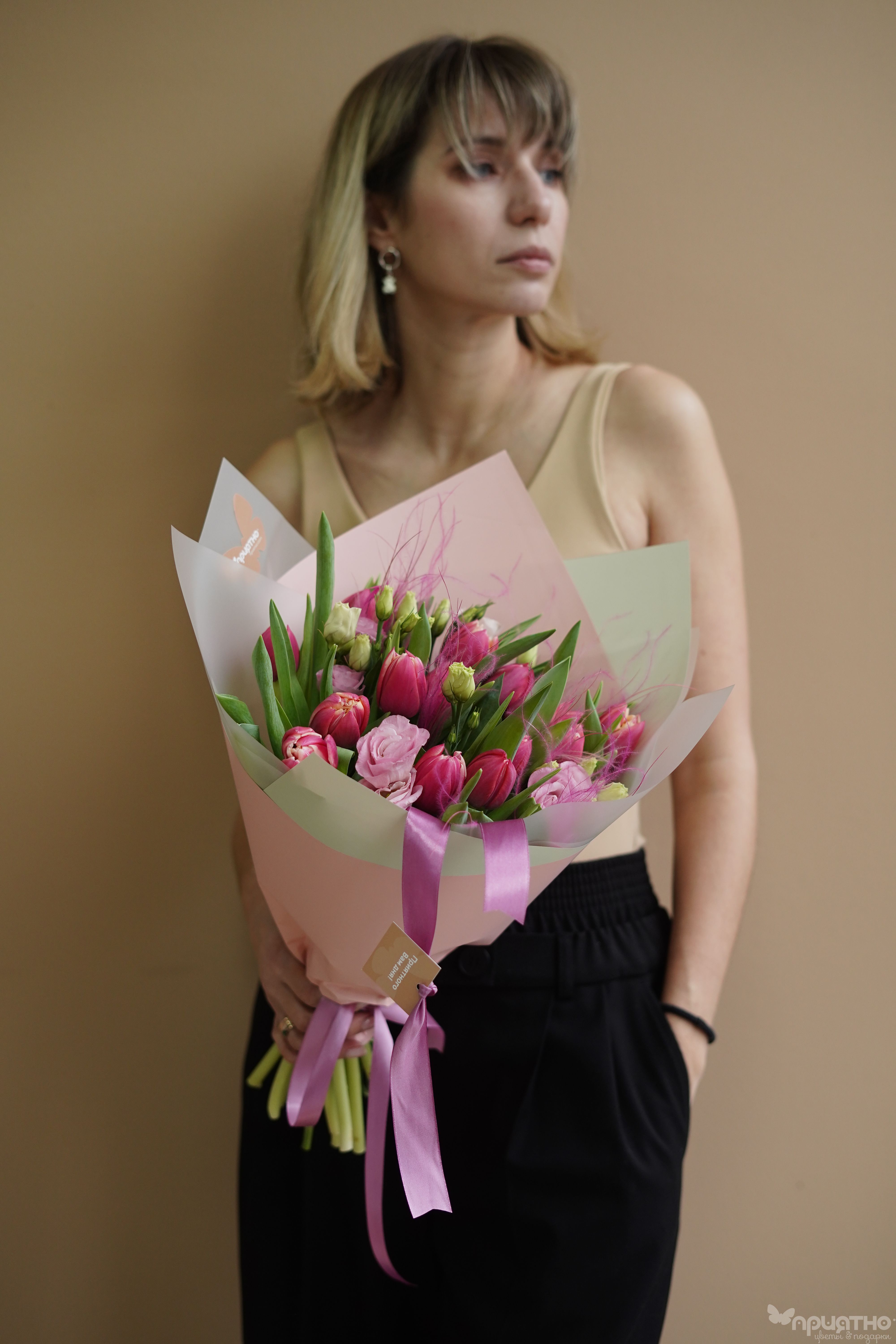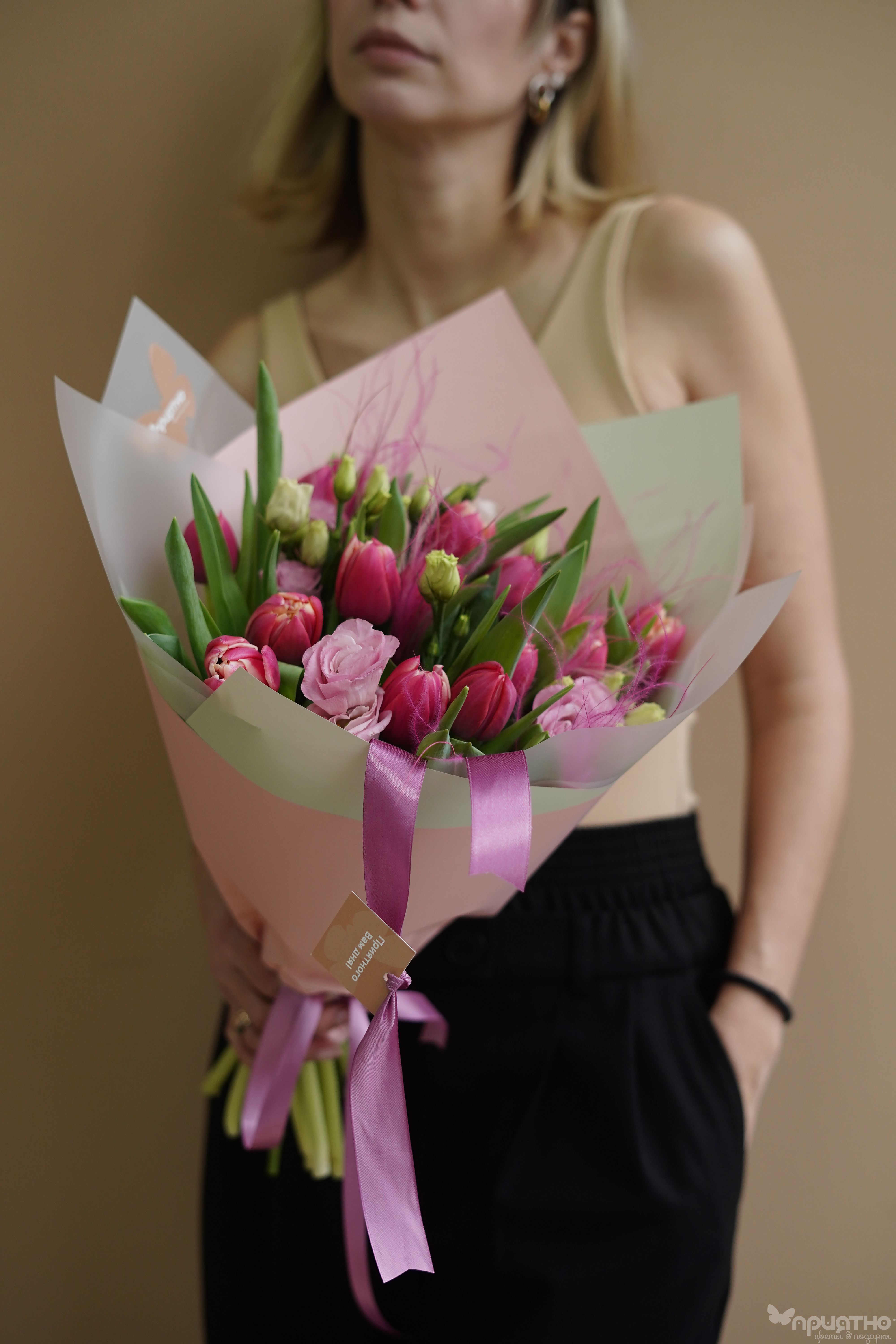 Тип букетаМногосоставный букетСезон❄ ЗимаЦветРозовыйМини открытка в ПОДАРОКестьФотоотчёт - БЕСПЛАТНОестьДоставка💸 ПлатнаяОсновной цветокТюльпанРазмер букетаСреднийУпаковкаКорейская плёнка