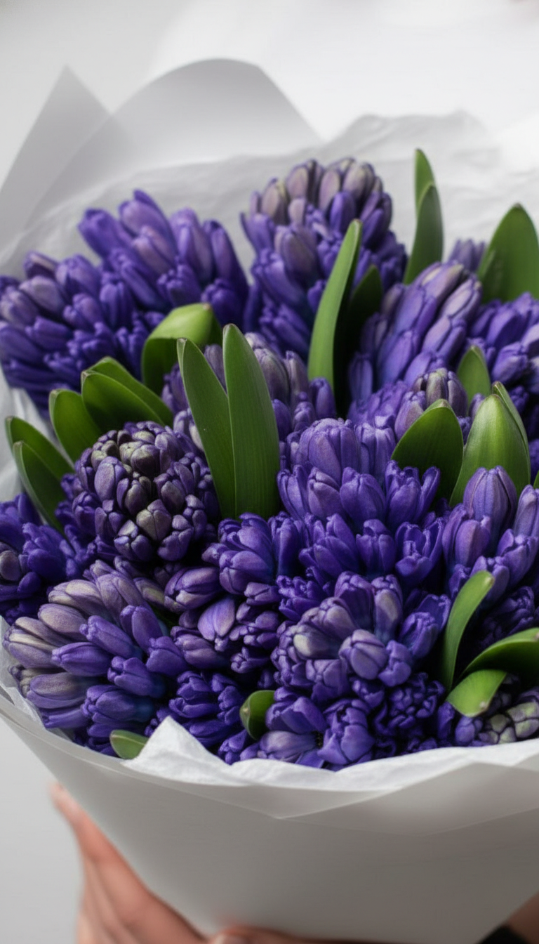 Для тех, кто ценит глубину и изысканность! Наш букет «Лазурная Верность» составлен из редких синих гиацинтов — символа спокойствия, верности и вечной гармонии. Интенсивный оттенок и пленительный весенний аромат создадут атмосферу доверительной близости и романтики. Это смелый и невероятно стильный выбор для особенного признания. Выразите самые сокровенные чувства без единого слова.