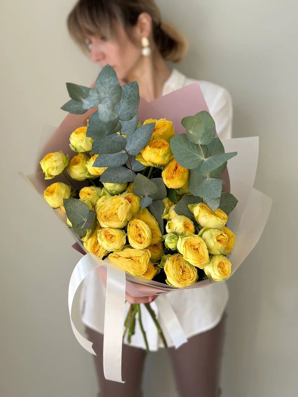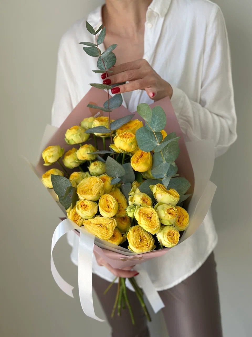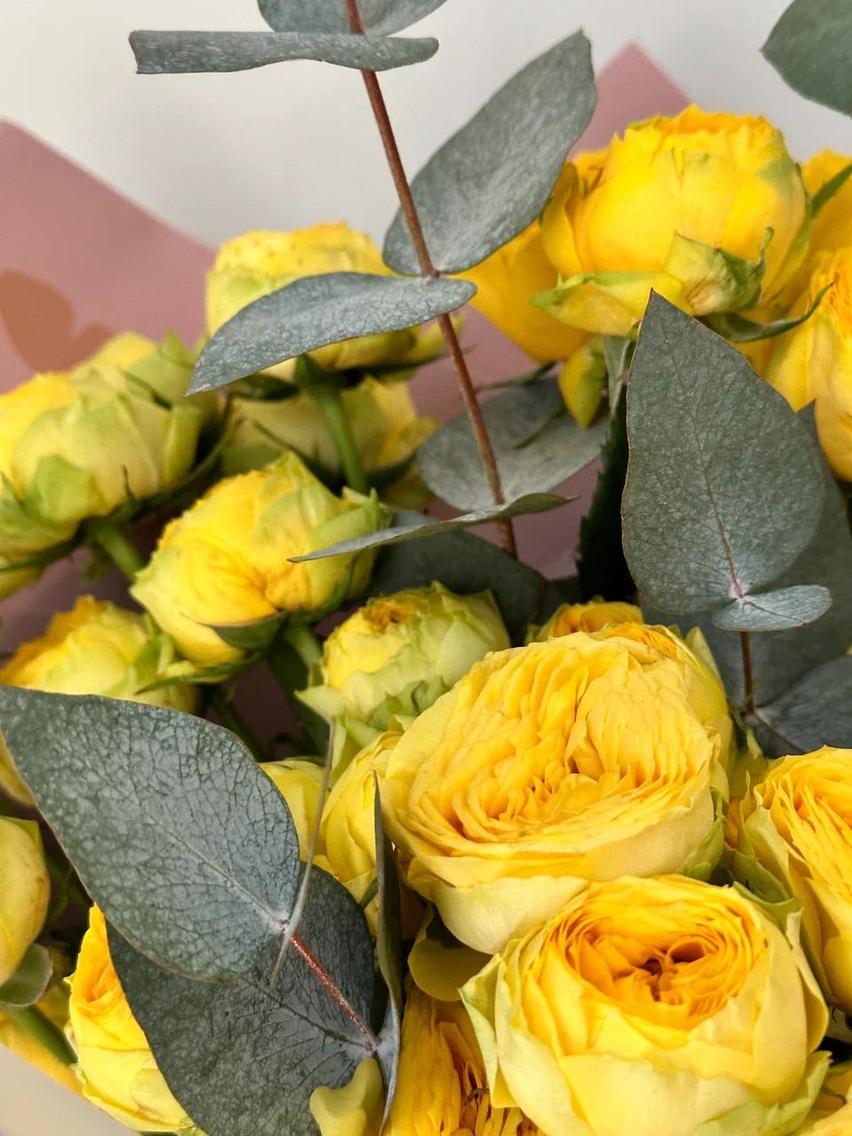 Букет из кустовых пионовидных жёлтых роз премиального сорта — это универсальный подарок, который поможет выразить самые тёплые чувства.