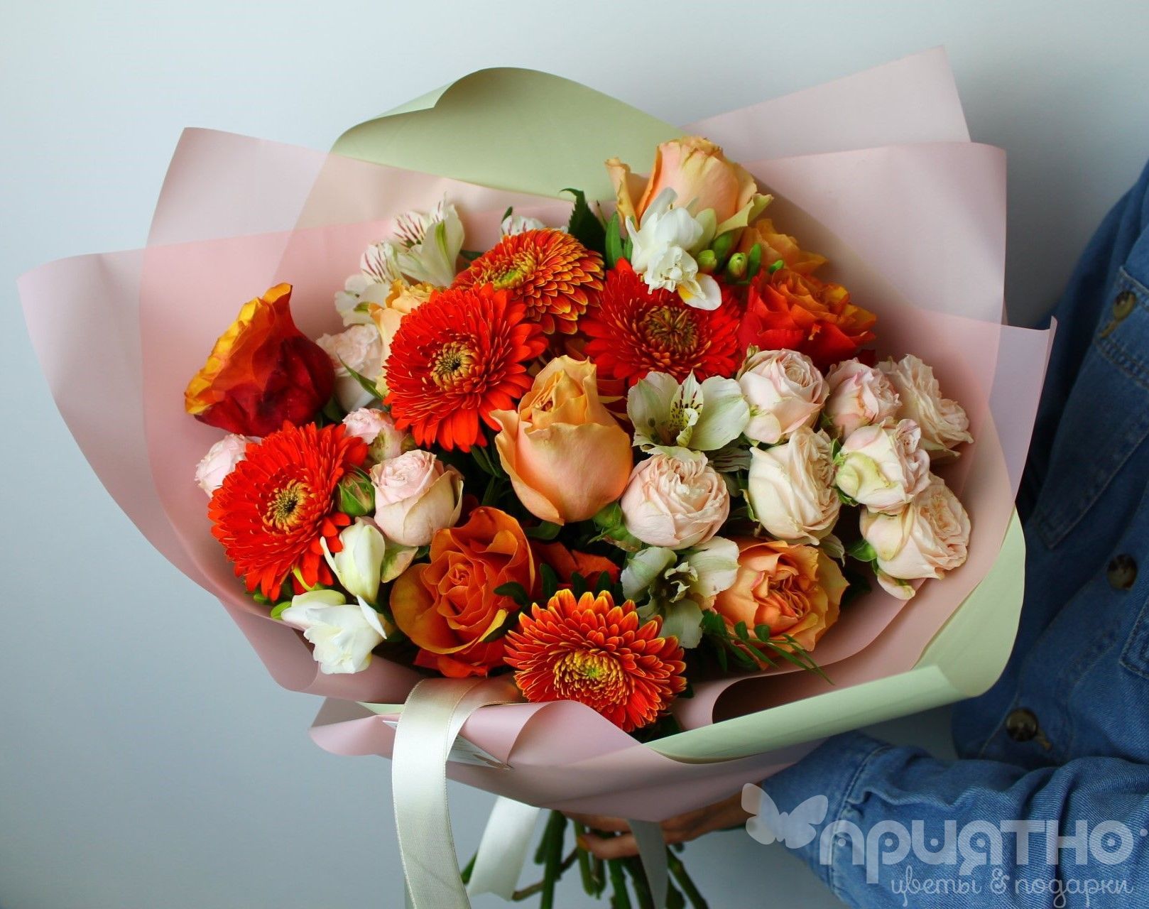 Очаровательный букет в оранжево-кремовых тонах — идеальное сочетание утончённых гербер, белых фрезий и пышных пионовидных роз. Этот яркий подарок никого не оставит равнодушным! Он прекрасно подойдёт для романтических событий, таких как свадьбы, дни рождения и юбилеи. Также этот букет будет отличным выбором для любого торжества: дня рождения, юбилея, свадьбы, годовщины, благодарности коллеге и так далее. Яркий букет в оранжево-кремовых оттенках из утонченных гербер, белых фрезий и пышных пионовидных роз. Такой цветочный подарок точно не останется незамеченным!