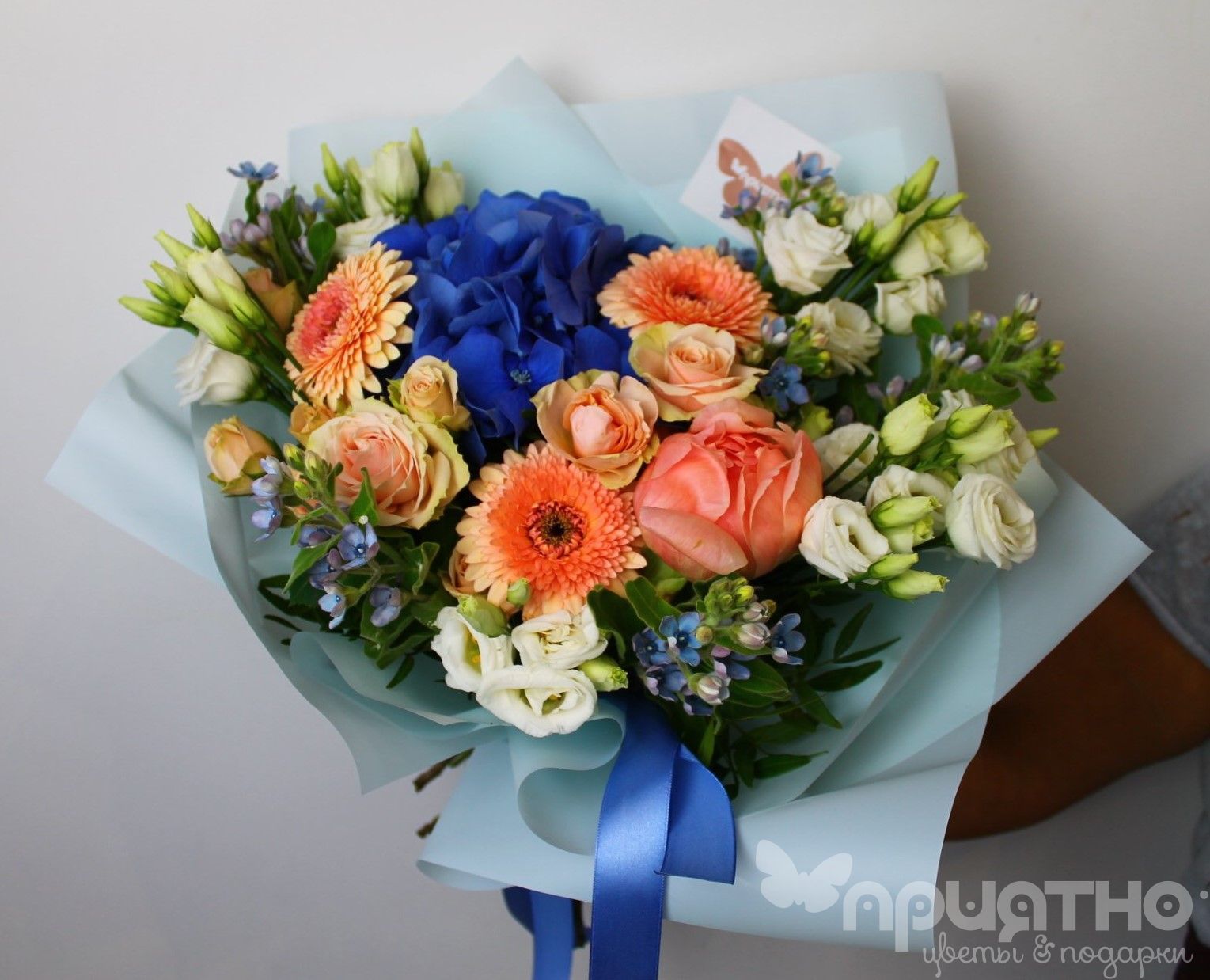 Этот букет, исполненный в нежнейших оттенках розового с акцентом на темно-синюю гортензию, с первого взгляда покоряет сердце той, кому предназначается подарок. Пышные розы с крупными бутонами сочетаются с элегантным пионом, игривой незабудкой (оксипеталум) и эустомой, создавая вместе неповторимую и чувственную гармонию!