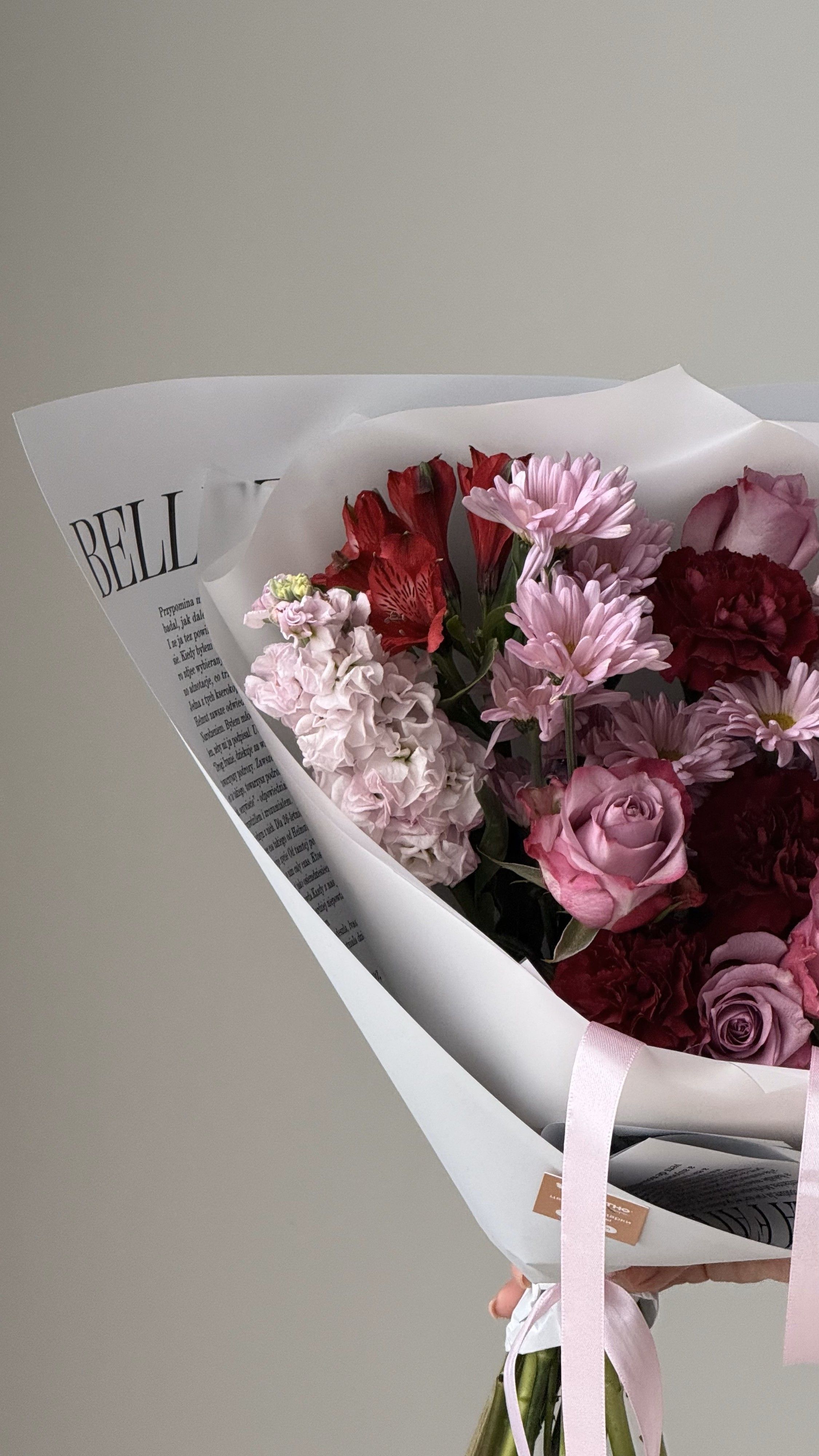 Подарите свежесть летнего вечера в каждом лепестке! Наш воздушный букет в нежных тонах — это гармония изысканности и природного очарования. Ароматная маттиола наполняет композицию волнующим благоуханием, а эквадорские розы премиум-класса добавляют ноту роскоши. Пышные кустовые хризантемы и нежные альстромерии создают объем и динамику, а деликатный декор завершает образ