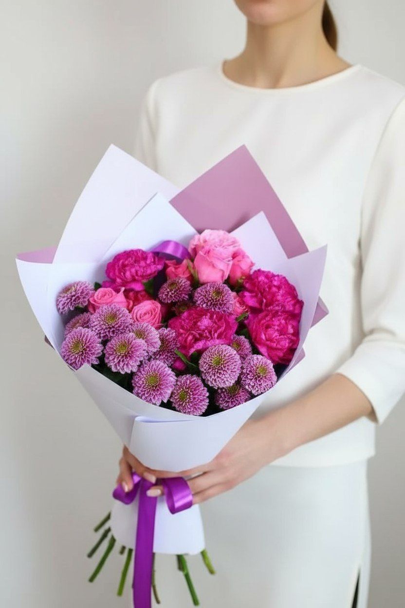 Великолепный букет из кустовых роз и хризантем, розовых гвоздик — настоящий водопад нежных оттенков, воплощающих женственность, радость и юность. С помощью этого подарка легко сделать приятный комплимент и признаться в трепетных чувствах избраннице.