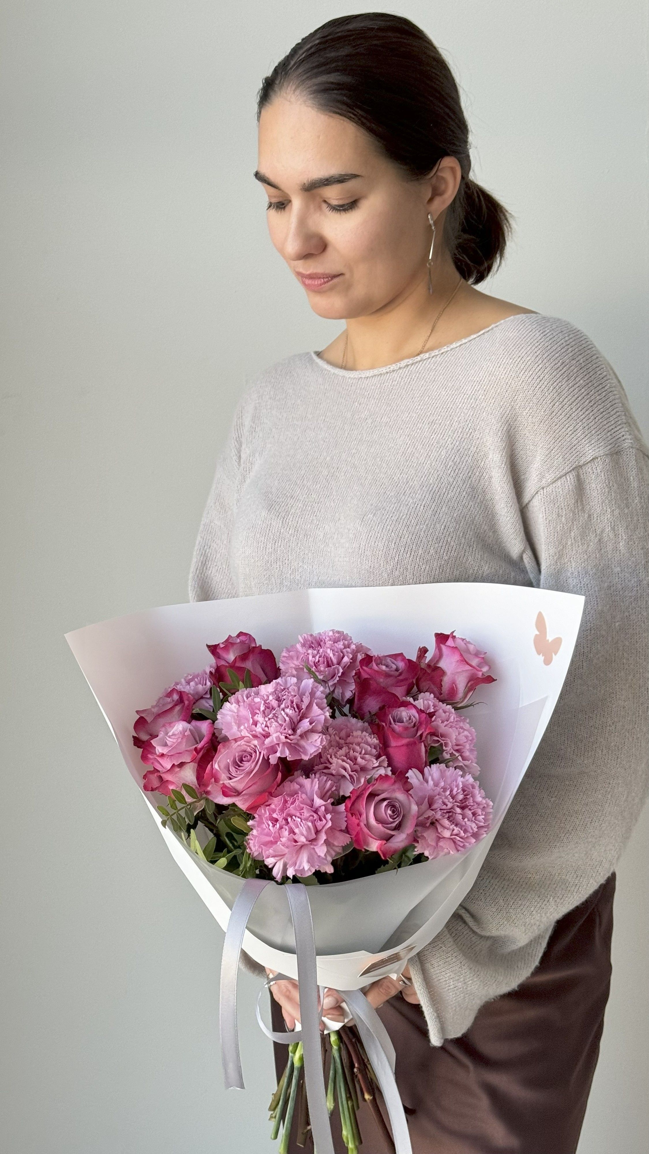 Этот малиново-сиреневый букет — воплощение безупречного вкуса. В его основе — цветы премиум-класса: величественные эквадорские розы с их безупречной формой и насыщенным цветом, и утонченная сортовая гвоздика (диантус), чьи кружевные соцветия добавляют сложность и изысканность.