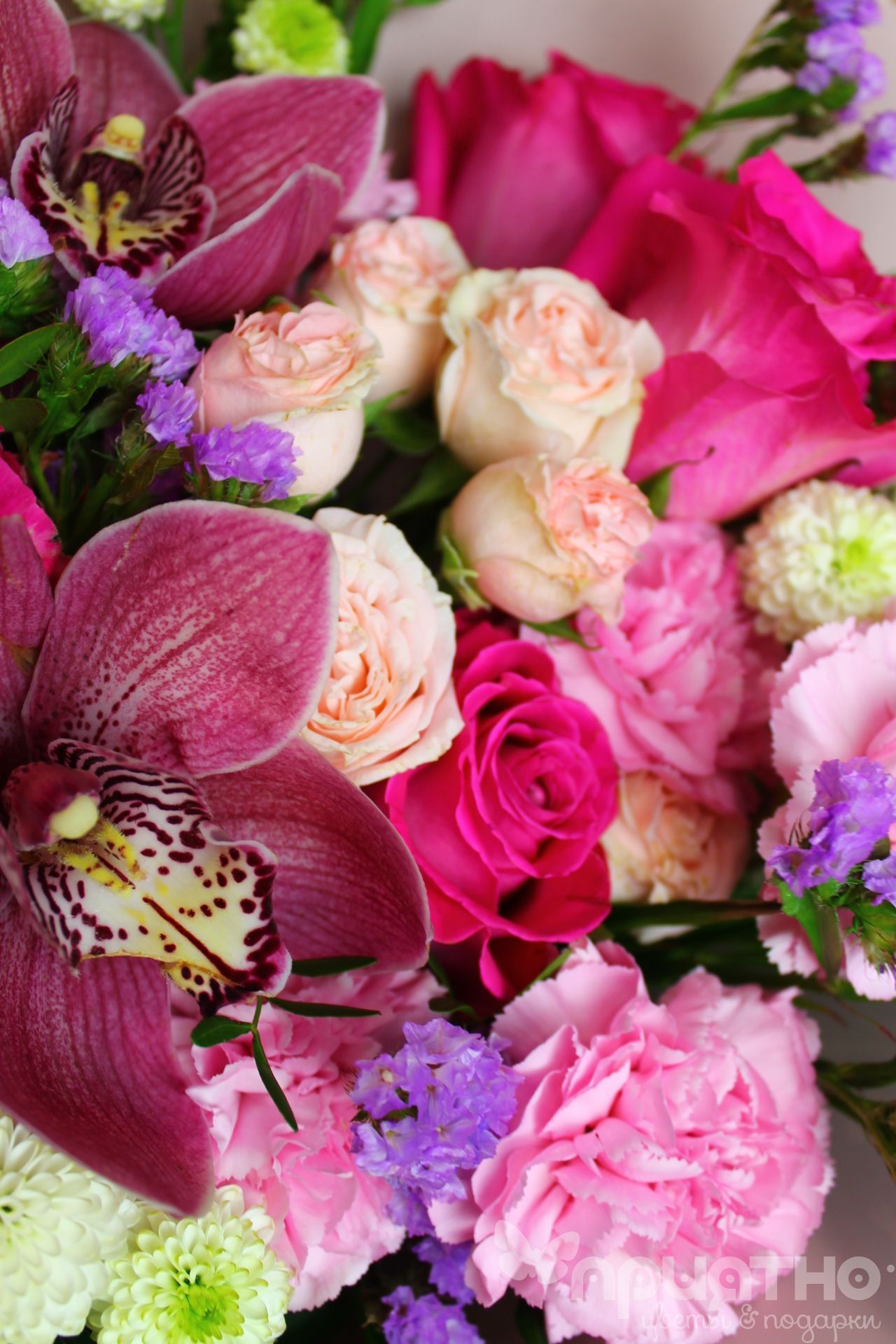Это розово-фиолетовый цветочный бум! Тут и розовые кустовые розы, и пушистые пионовидные розы такого же румяного оттенка, и белоснежная сантини, и статица цвета грозовых облаков, а также нежно-розовая гвоздика, подбитая пышной юбкой из зелени.