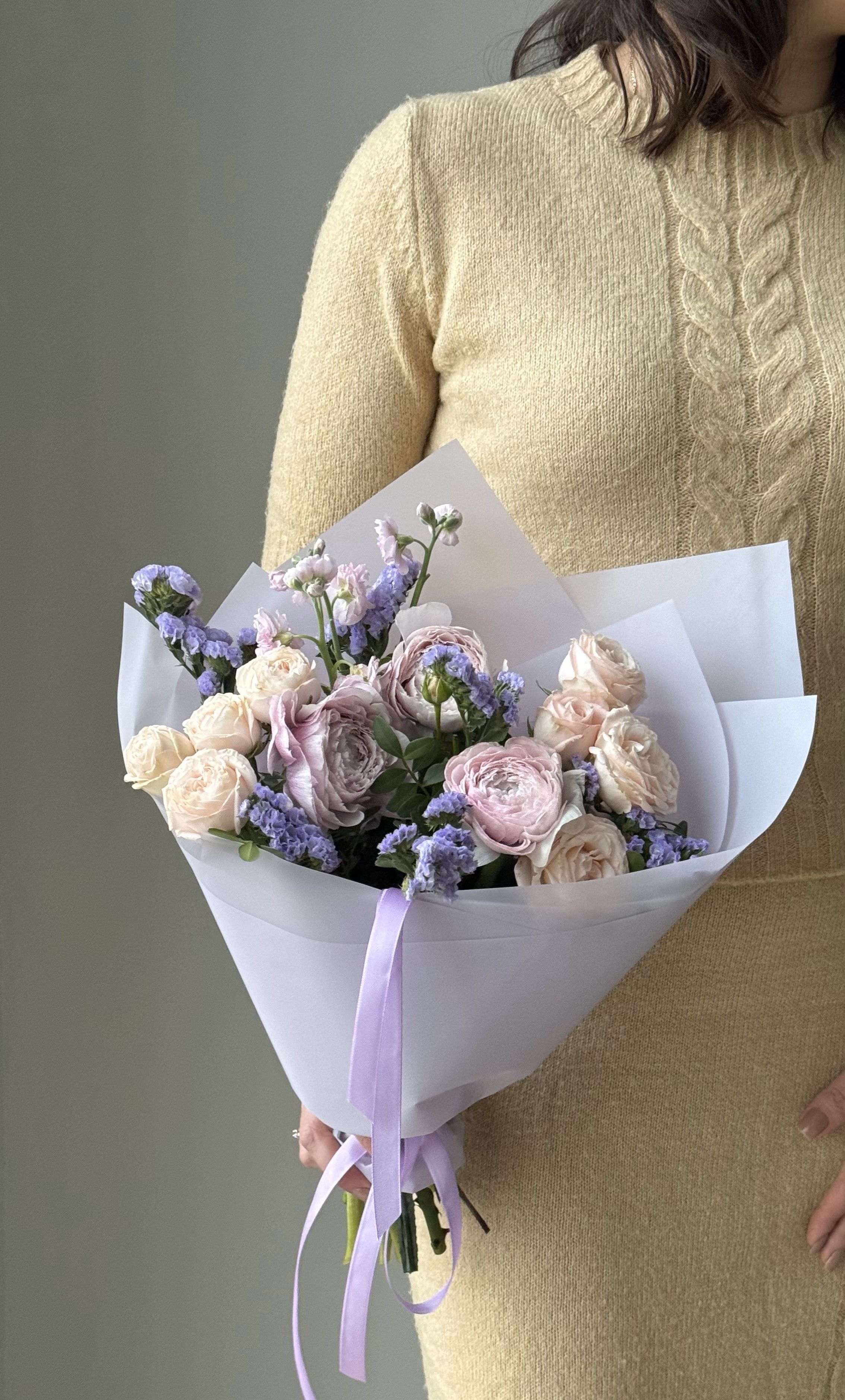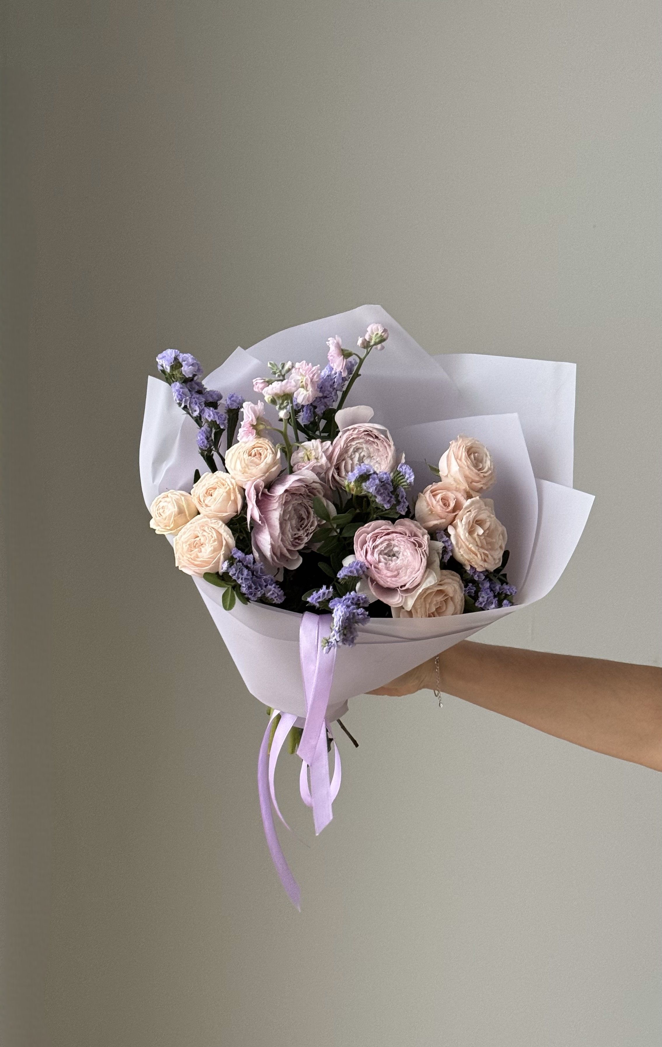 Представляем вашему вниманию эксклюзивный букет «Сиреневый закат», созданный специально для доставки в ваш район. Этот изящный ансамбль объединяет в себе изысканные ранункулюсы, элегантную статицу и нежные кустовые пионовидные розы, собранные в гармоничном сочетании сиреневых оттенков.