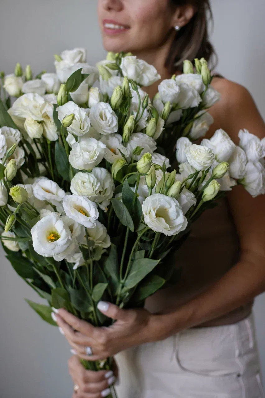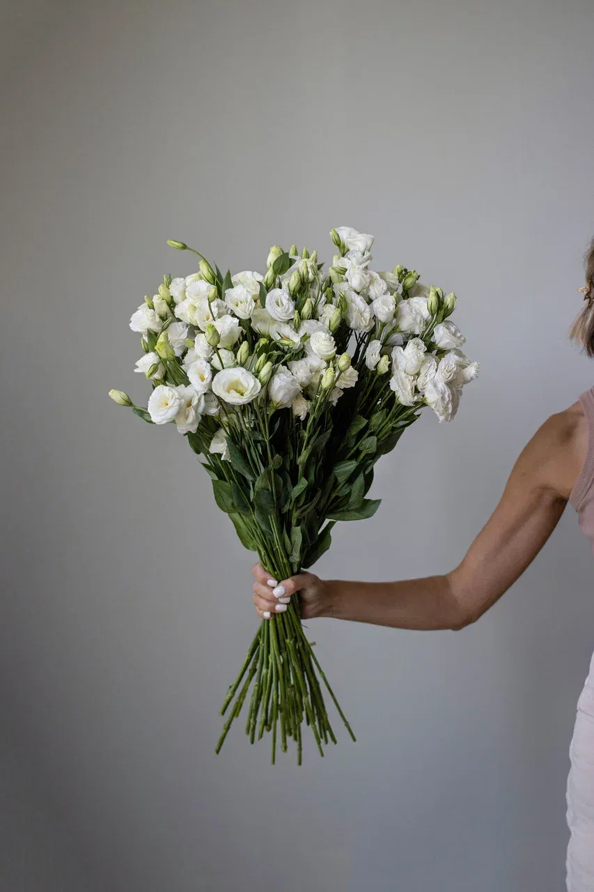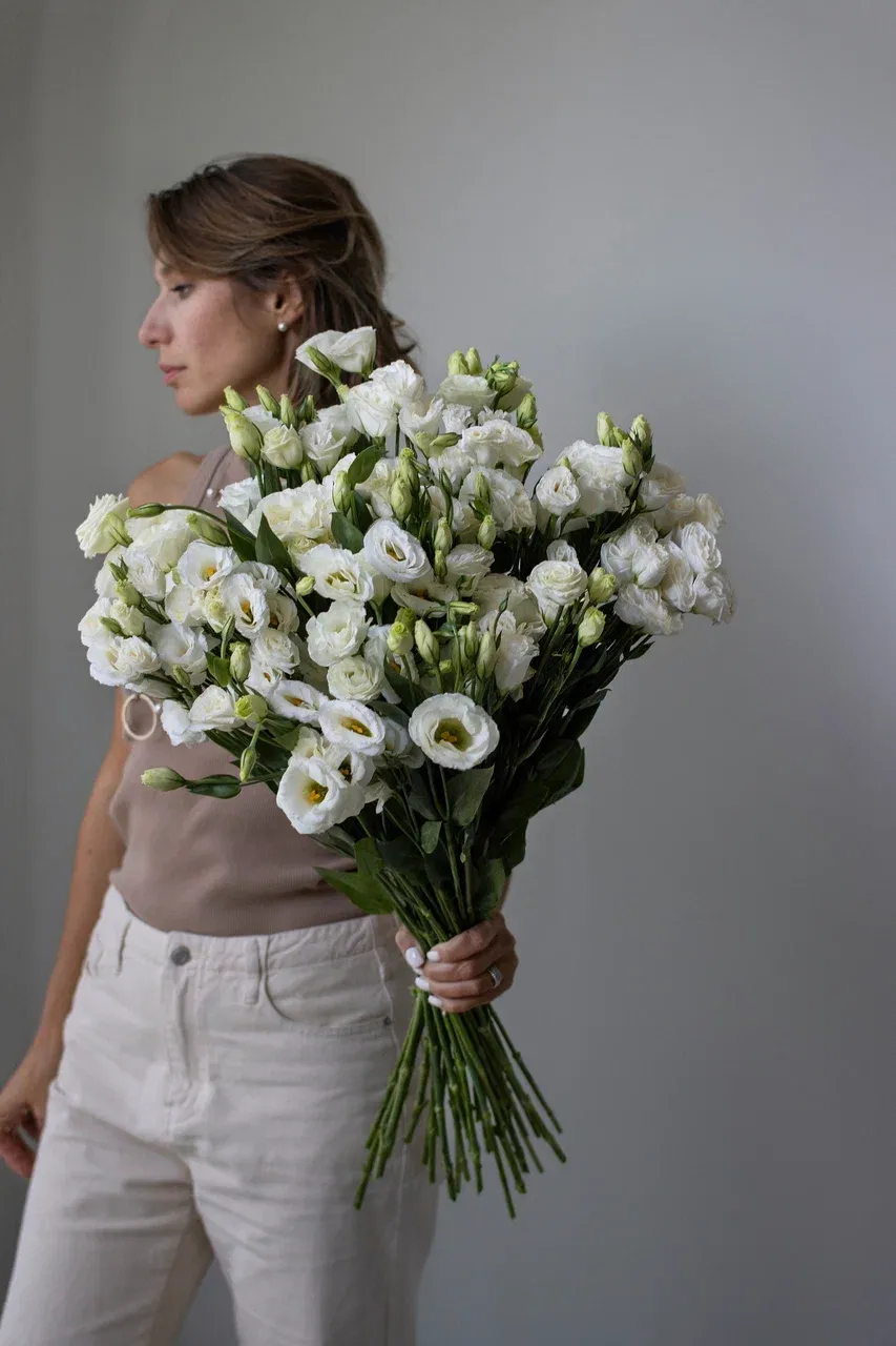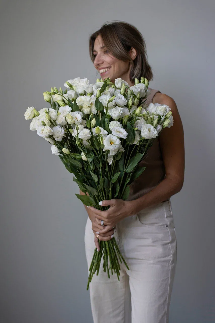 Это охапка эустом светлых белых оттенков. Такой букет станет прекрасным подарком на день рождения, юбилей, свадьбу или просто так, чтобы порадовать близкого человека.