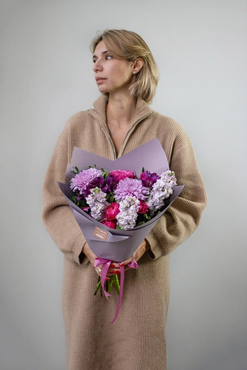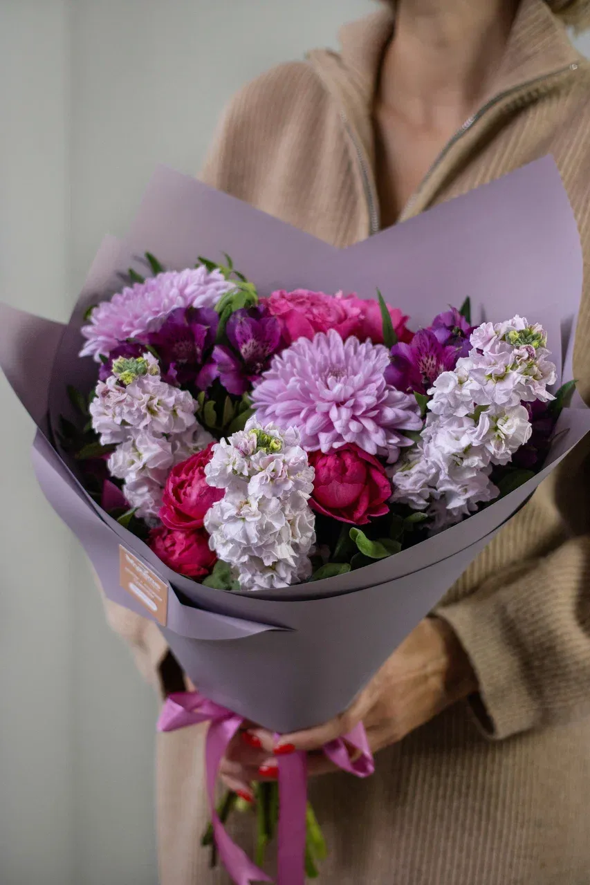 Букет «Малиновый Эдем». Откройте мир ярких красок с нашим неповторимым букетом! Малиново-розовые оттенки аромата маттиолы, элегантной альстромерии и необычных хризантем гармонично сочетаются с кустовой розой премиальных сортов. Этот уникальный ансамбль станет прекрасным подарком для ваших близких и друзей.