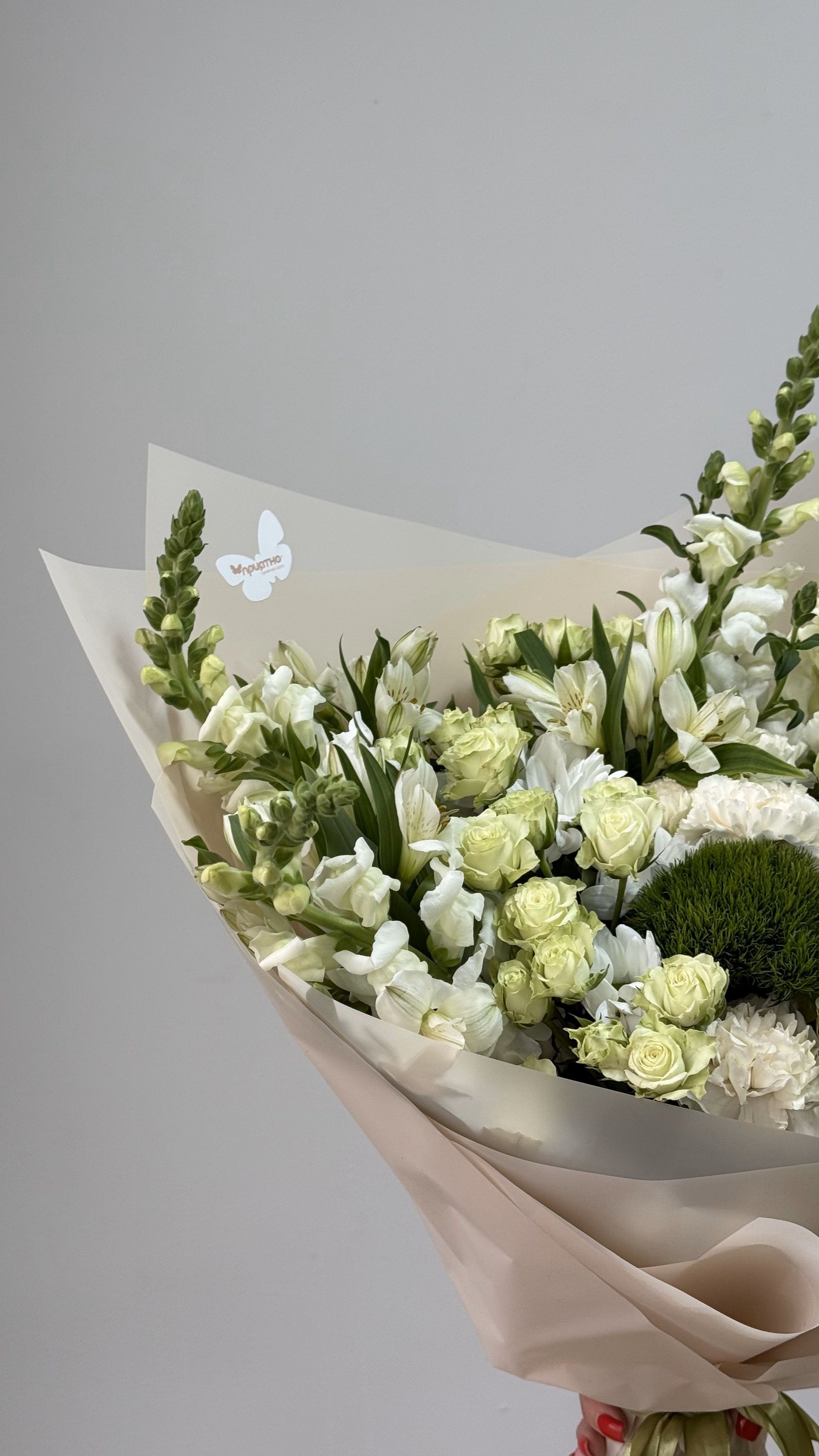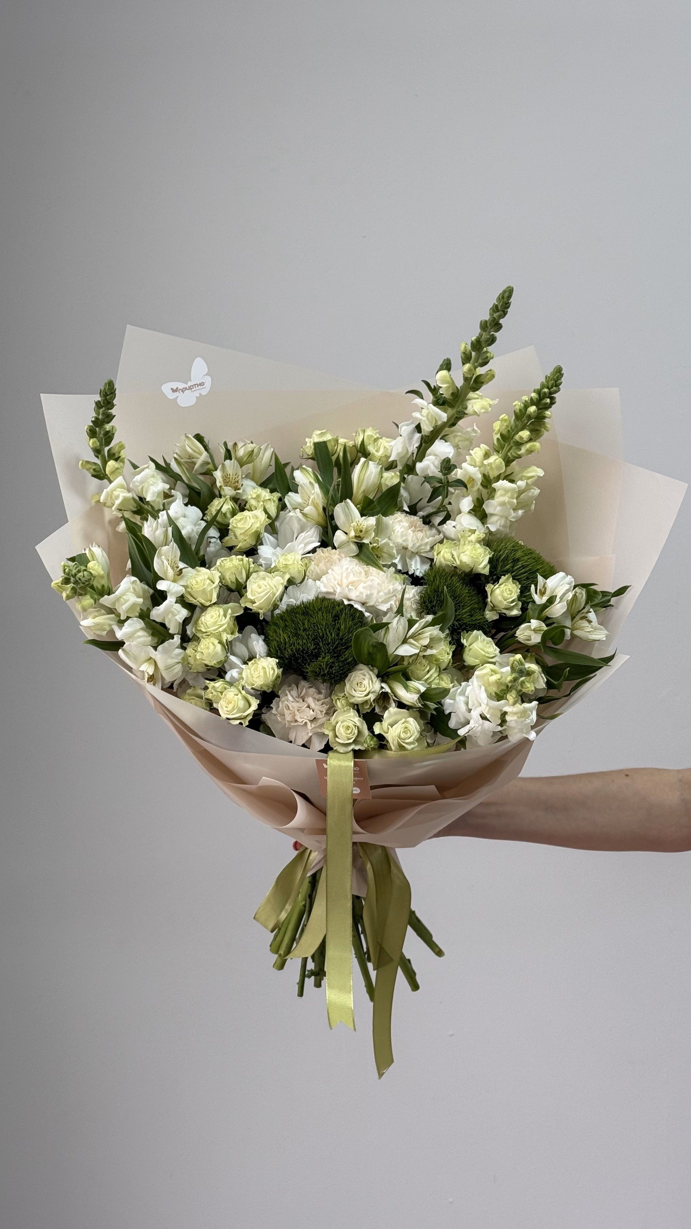 Подарите чистоту природы и элегантность в каждом лепестке! Бело-зелёный букет, где нежность сочетается с сочной свежестью, — идеальный выбор для тех, кто ценит гармонию и стиль.