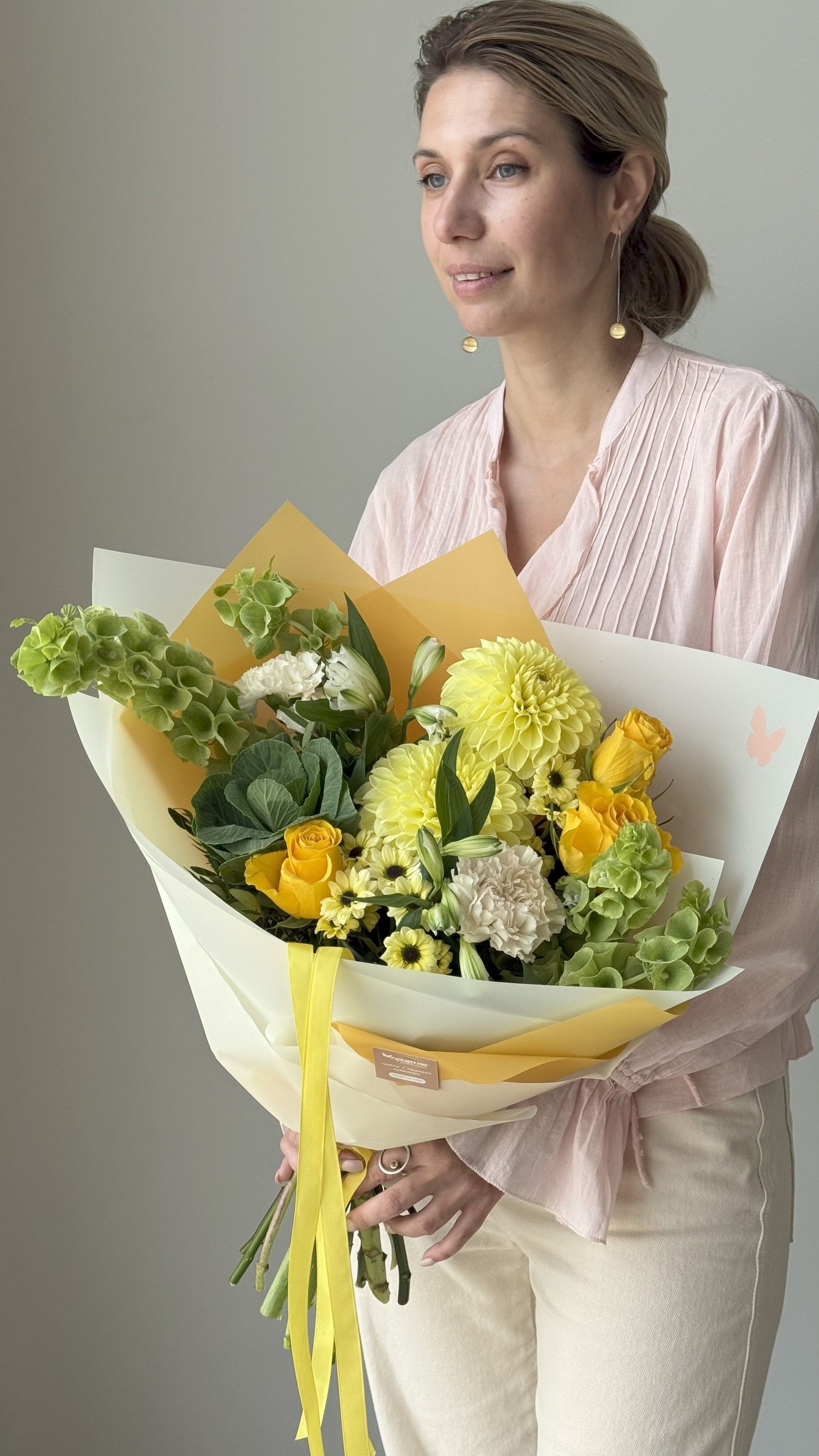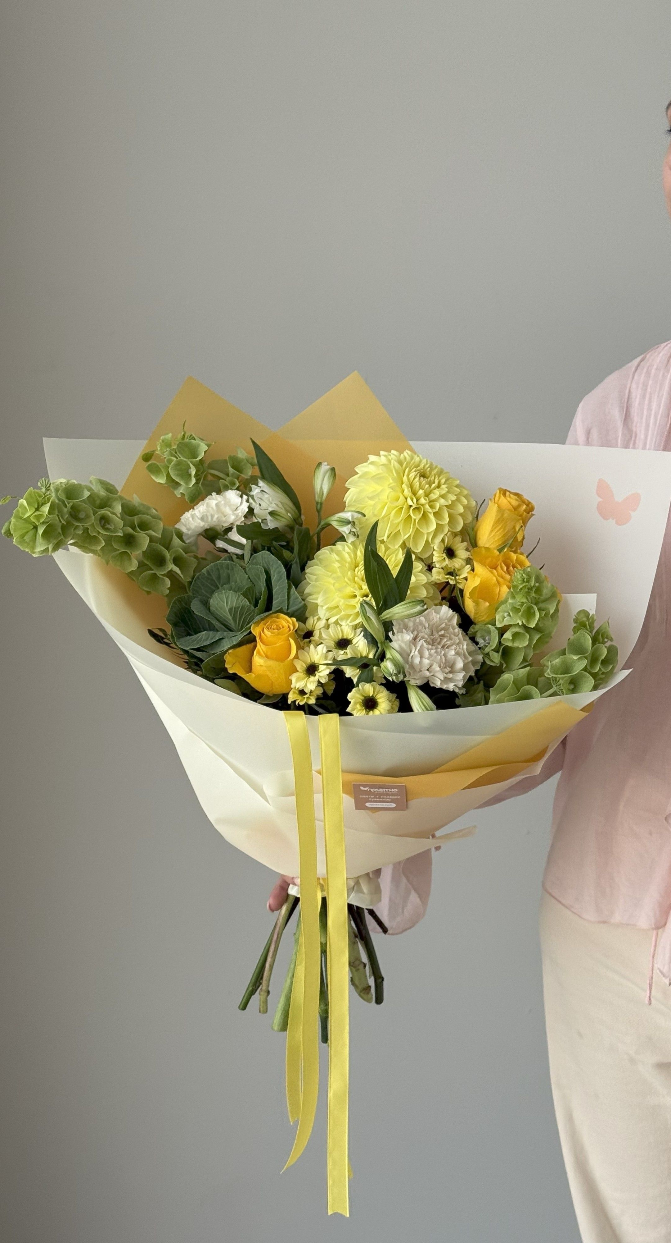 Хрустальные чашечки молюцеллы создают изумрудную «пену» и необычную фактуру. Пышные жёлтые георгины добавляют бархатный объем. Ромашковидные кустовые хризантемы в лимонных тонах дарят теплое сияние. Розы премиальных сортов с нежно-зелёными бутонами вносят элегантность. Декоративная брасика с гофрированными соцветиями играет текстурными акцентами. Альстромерии с тигровым узором завершают гармонию.