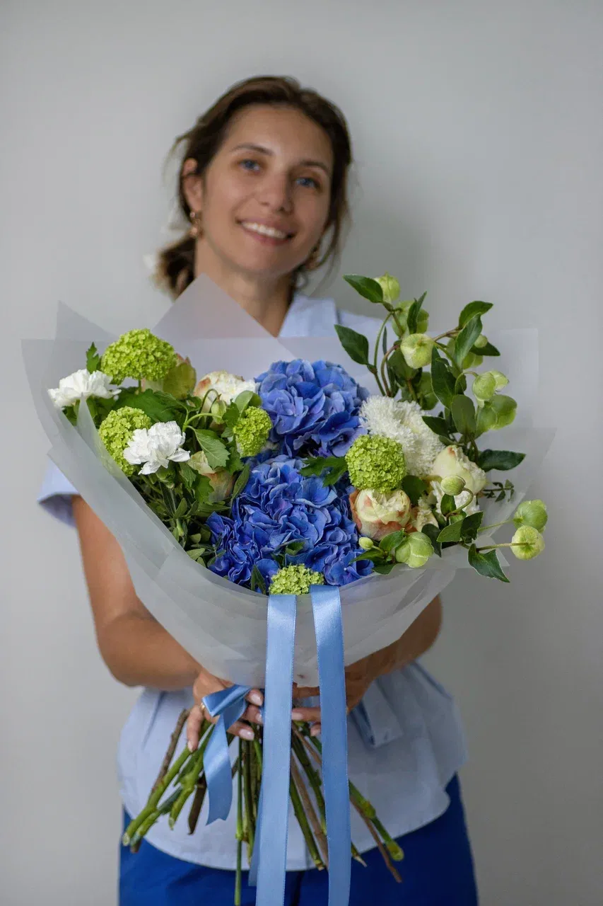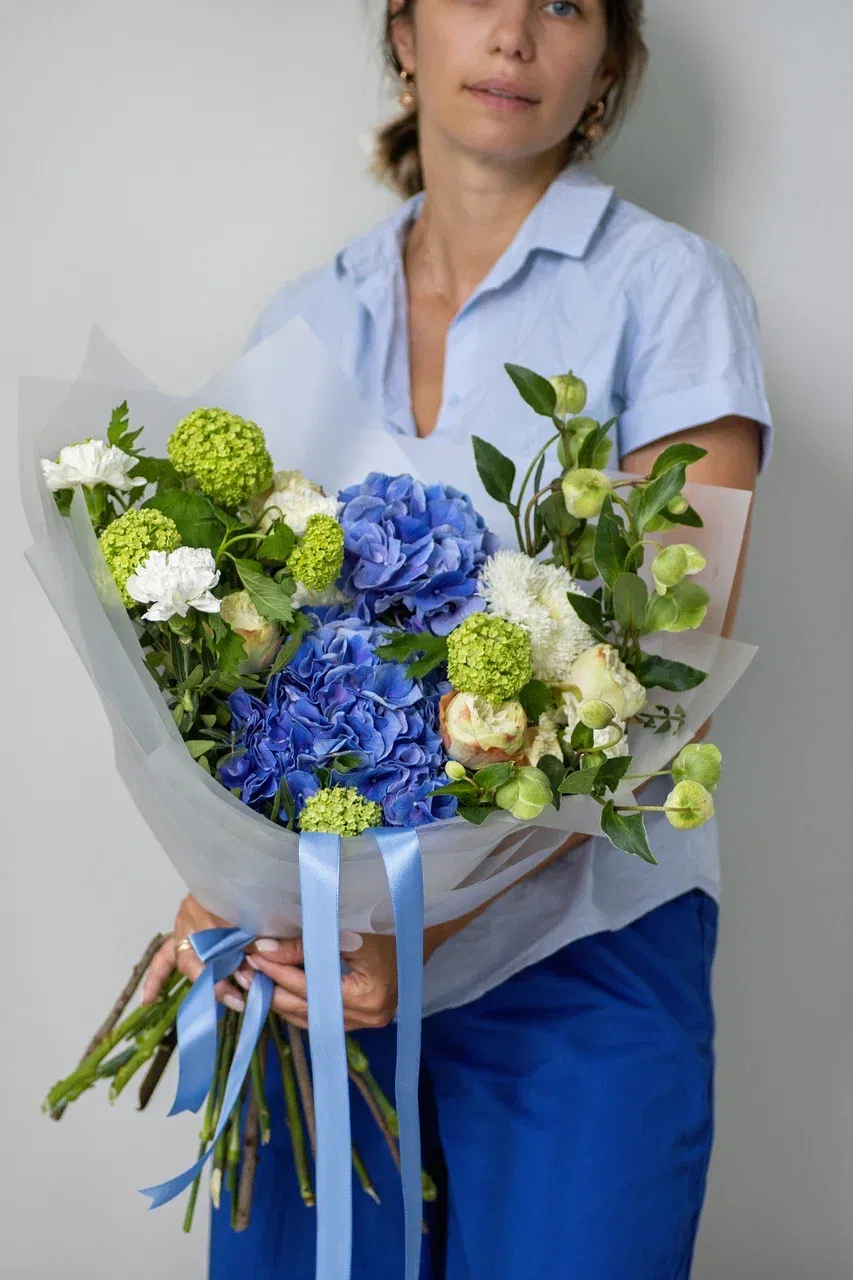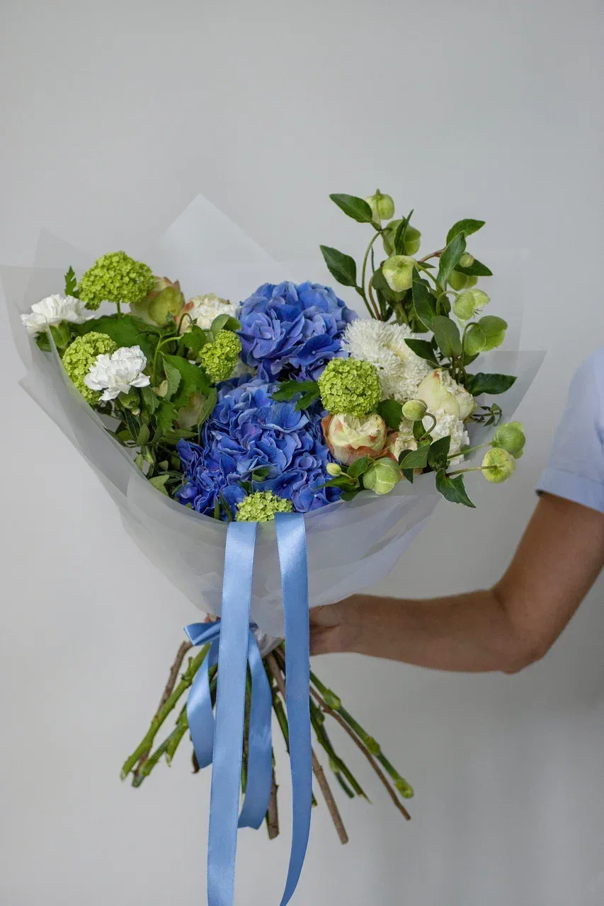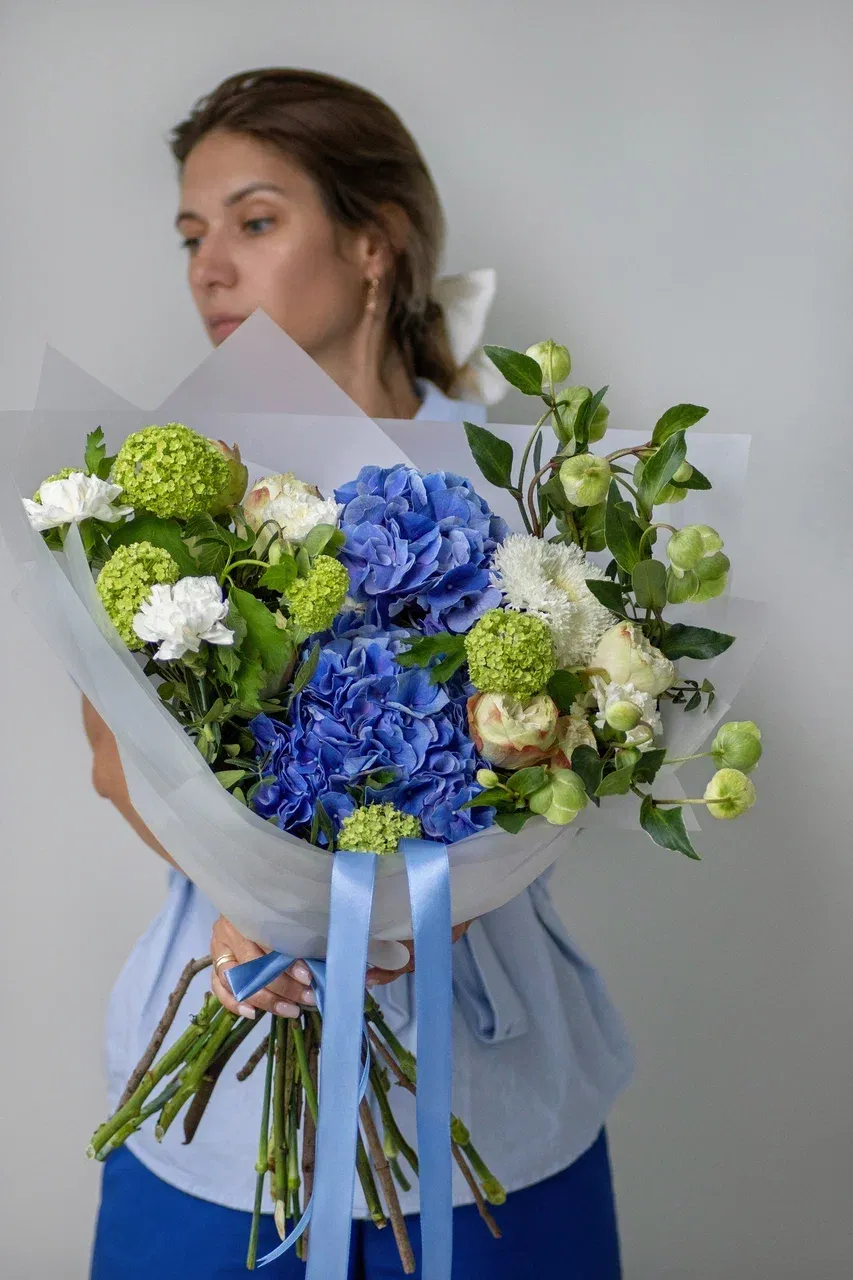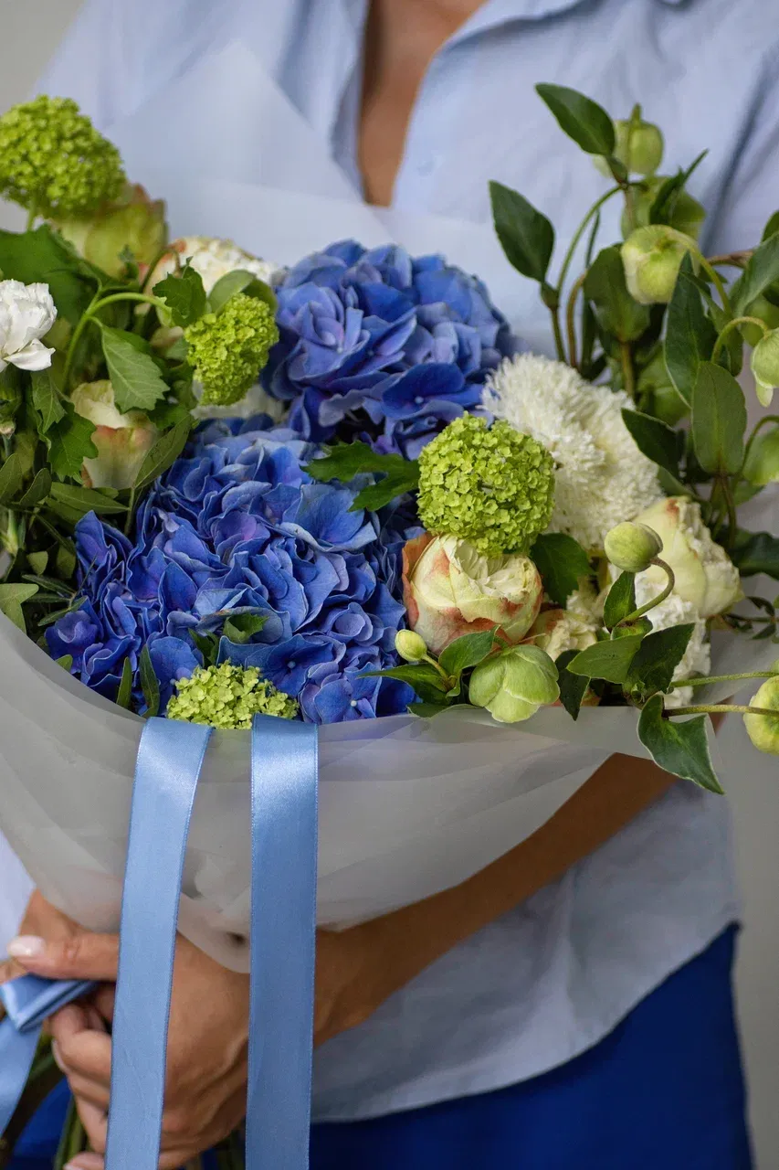 Букет «Светлый» состоит из гортензий глубокого синего цвета, воздушного вибурнубума и хелоборуса. Эти цветы прекрасно сочетаются друг с другом, создавая неповторимую композицию.