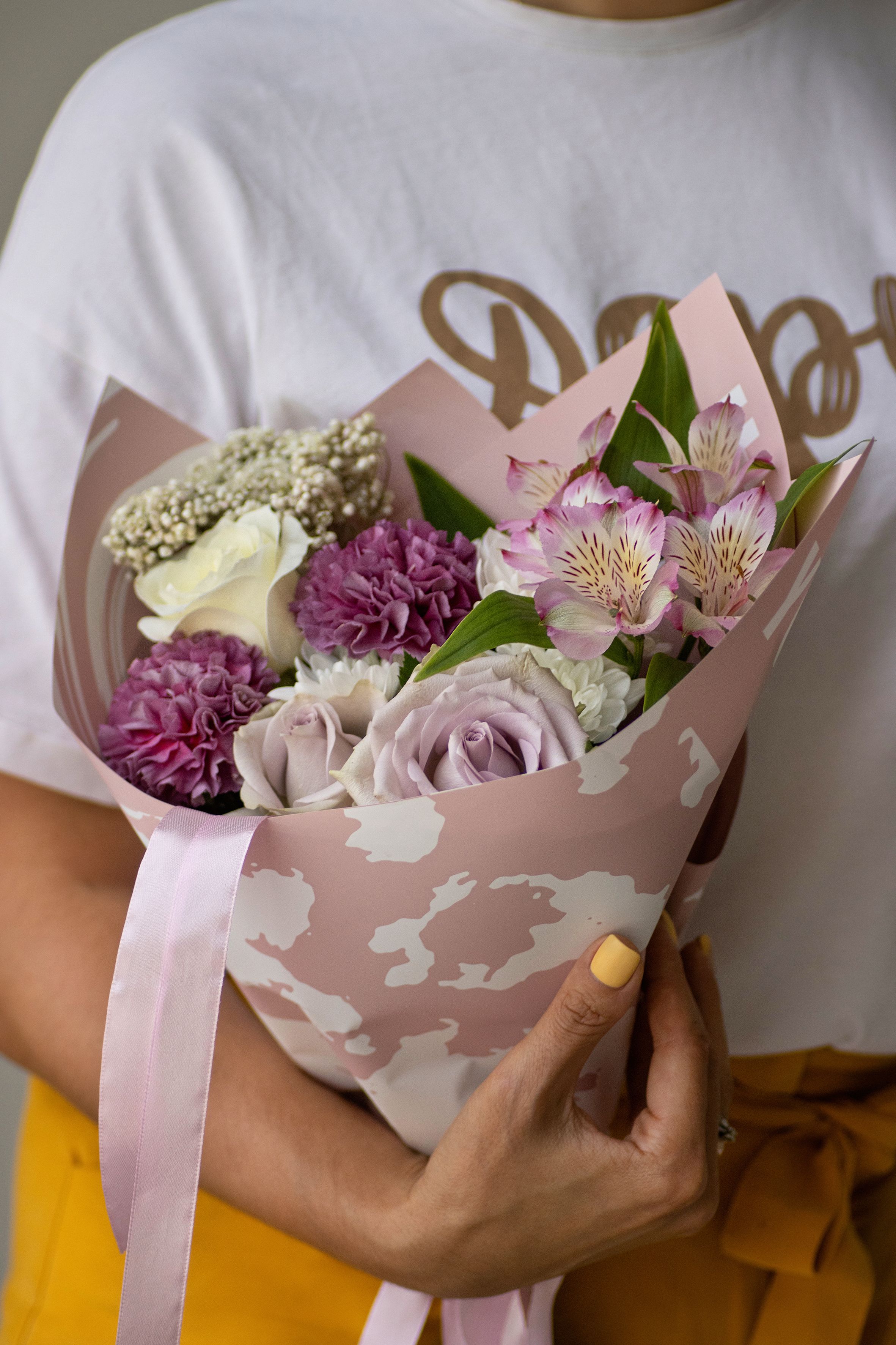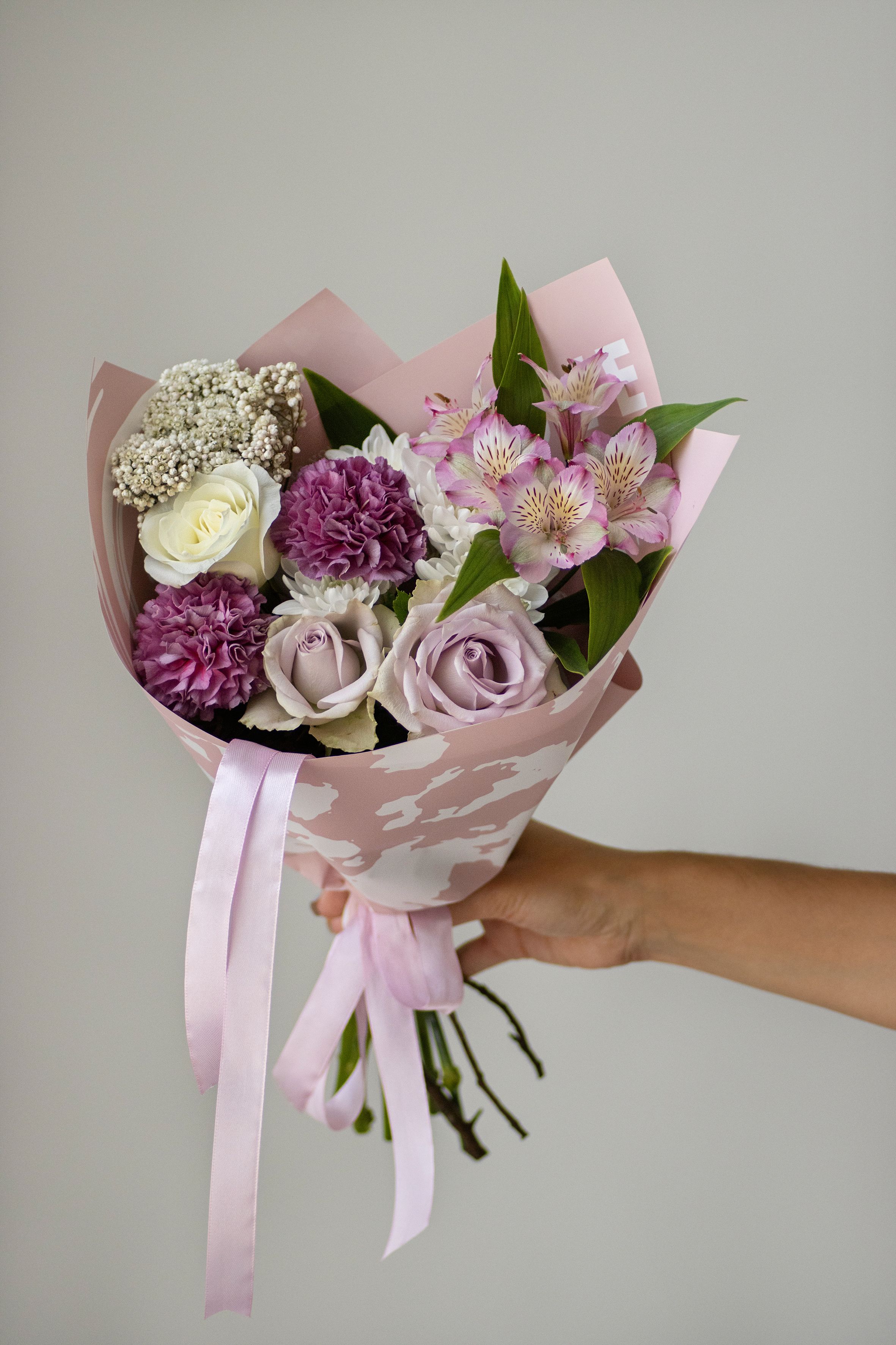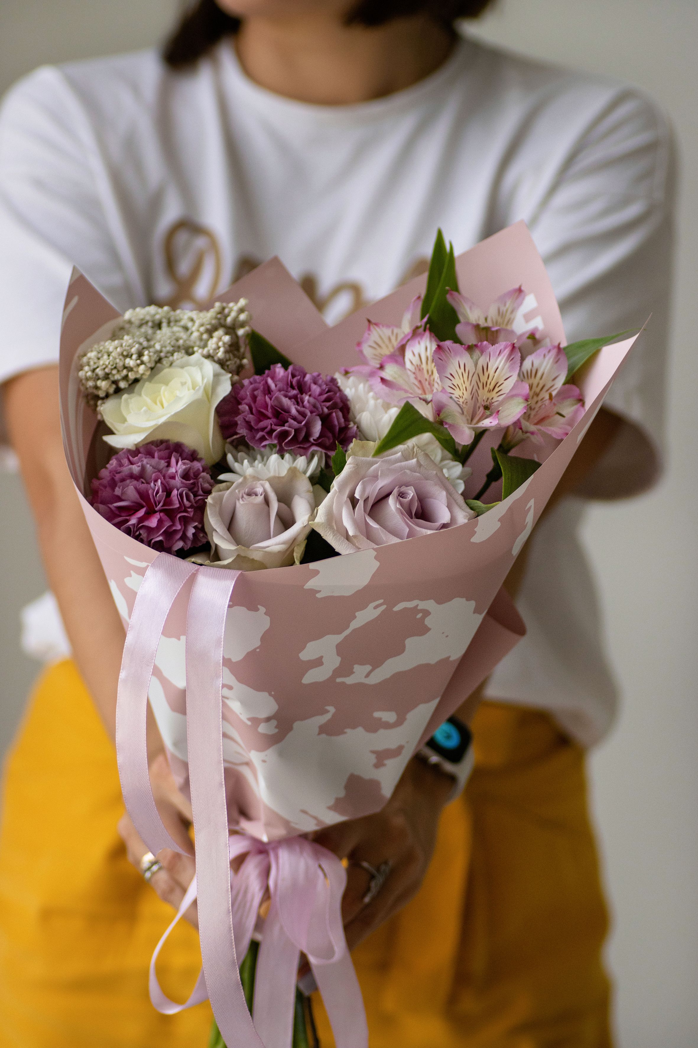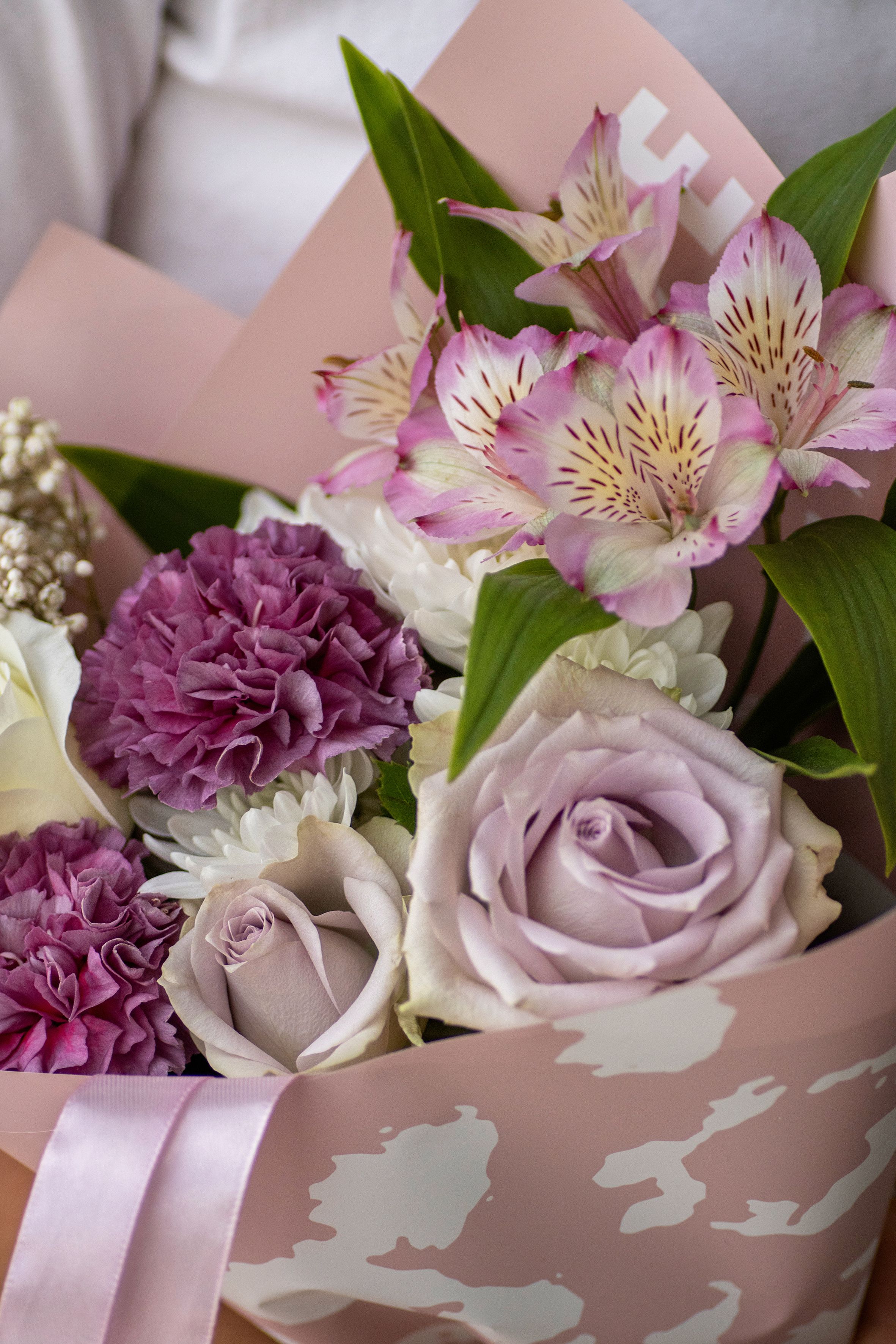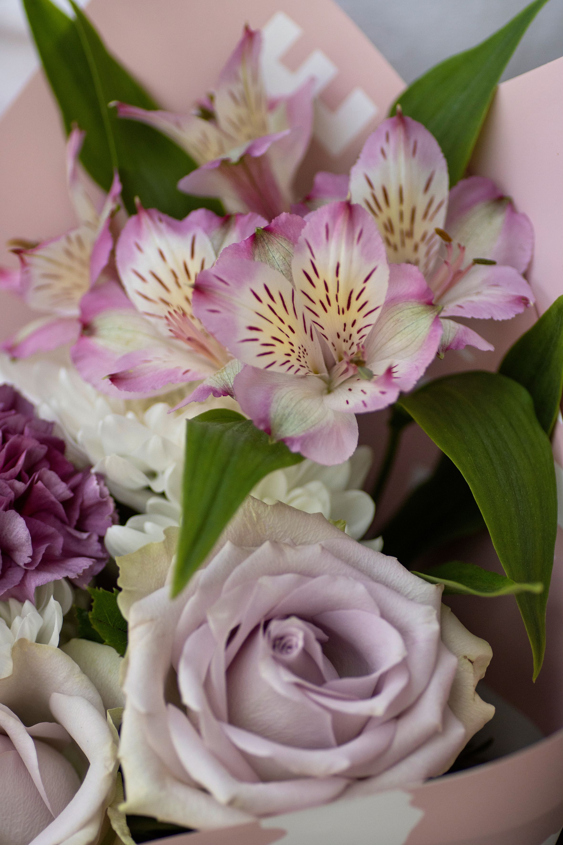 Сортовая гвоздика добавляет букету яркости и свежести, роза — нежности и изящества, ароматная роза — насыщенности и глубины, а альстромерия — экзотики и оригинальности.
