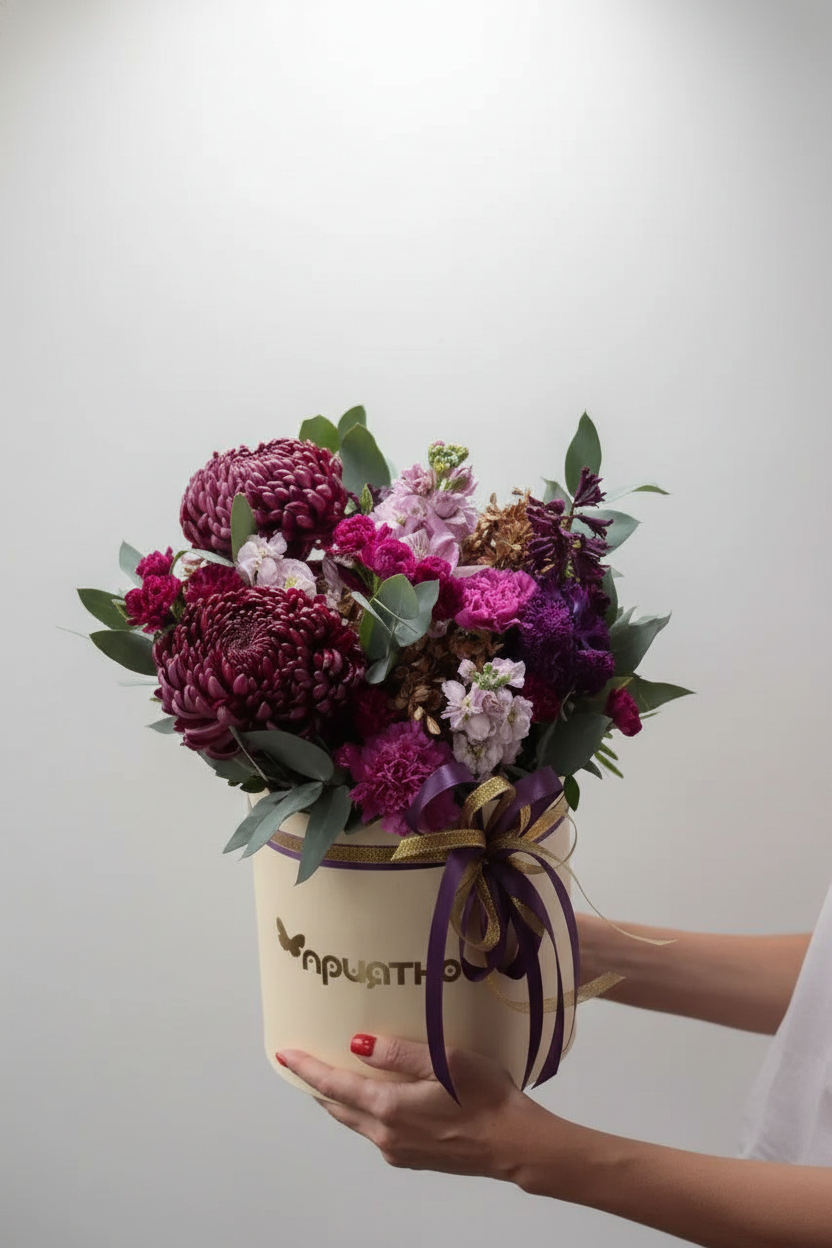 Цветочная композиция «Благородный подарок» состоит из сортовой гвоздики, маттиолы, гиацинта, гортензии и эвкалипта. Этот изысканный букет станет прекрасным подарком для мамы, любимой или близкого человека. Стабилизированная гортензия придаёт композиции особую нежность и долговечность, а эвкалипт добавляет свежести и лёгкости.
