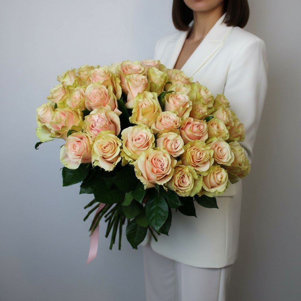 Этот букет — для тех, кто понимает разницу между просто цветами и произведением флористического искусства. Большие, бархатистые бутоны элитных персиковых сортов, собранные в пышную композицию, говорят об утонченном вкусе и глубине чувств.