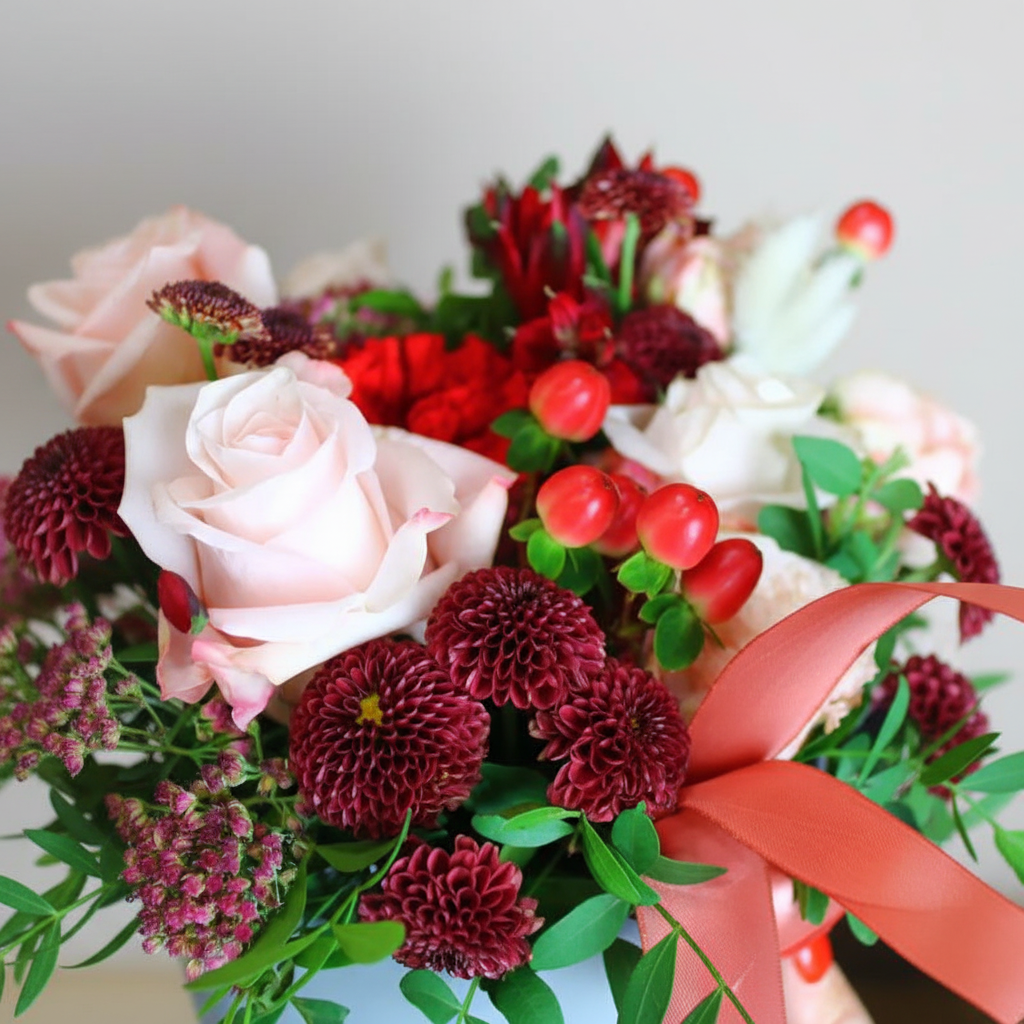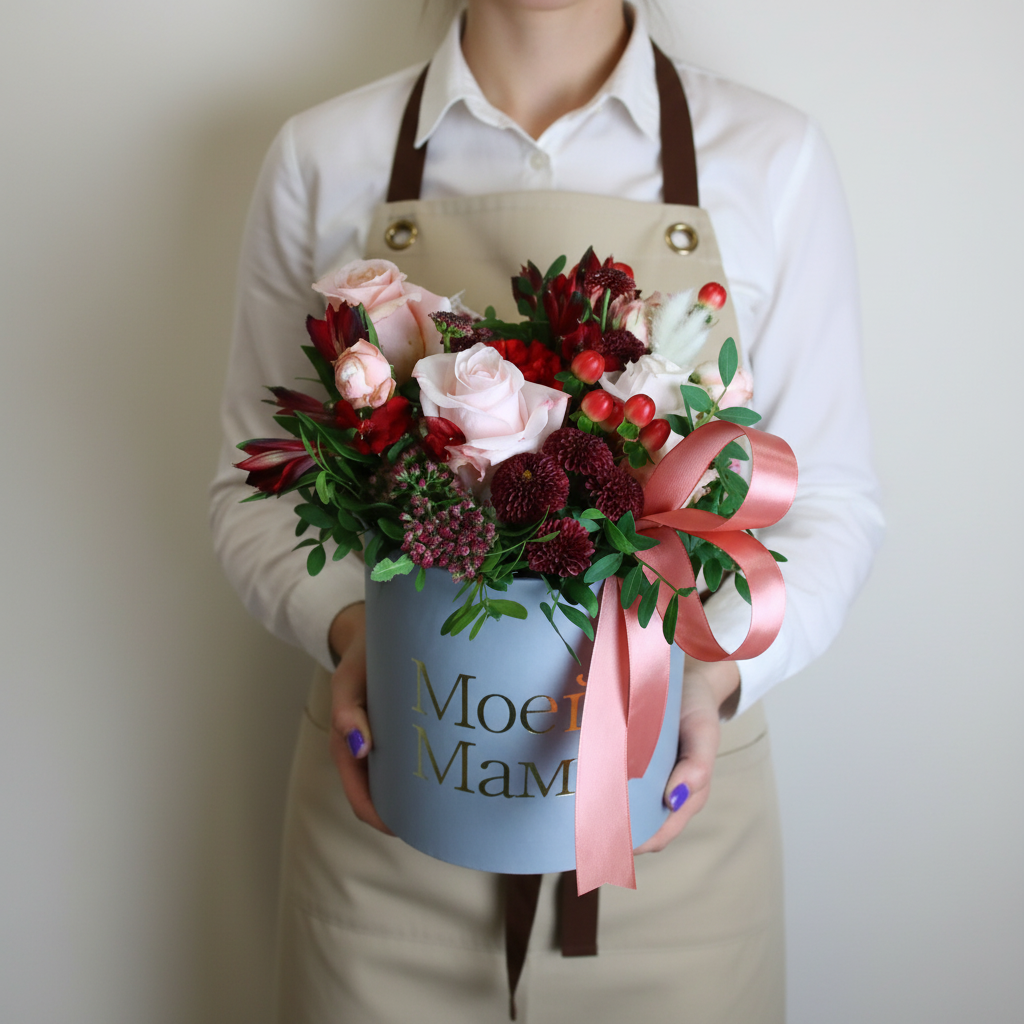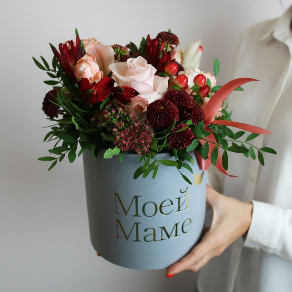 Элегантная цветочная композиция в стильной шляпной коробке благородного бордового оттенка с трогательной надписью "Моей маме". Идеальное решение для тех, кто хочет преподнести готовый, продуманный до мелочей подарок.