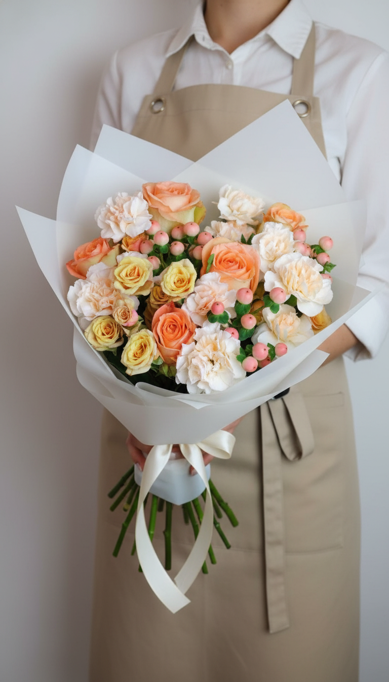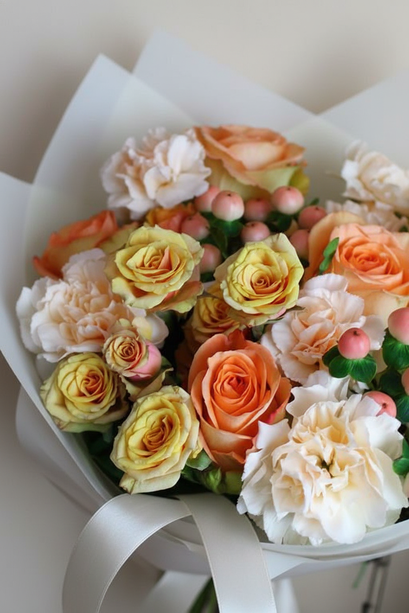 Нежный букет в теплой палитре персиковых и оранжевых тонов, где каждый цветок словно освещен мягким светом утреннего солнца. Этот букет подарит маме ощущение уюта, заботы и бесконечной нежности.