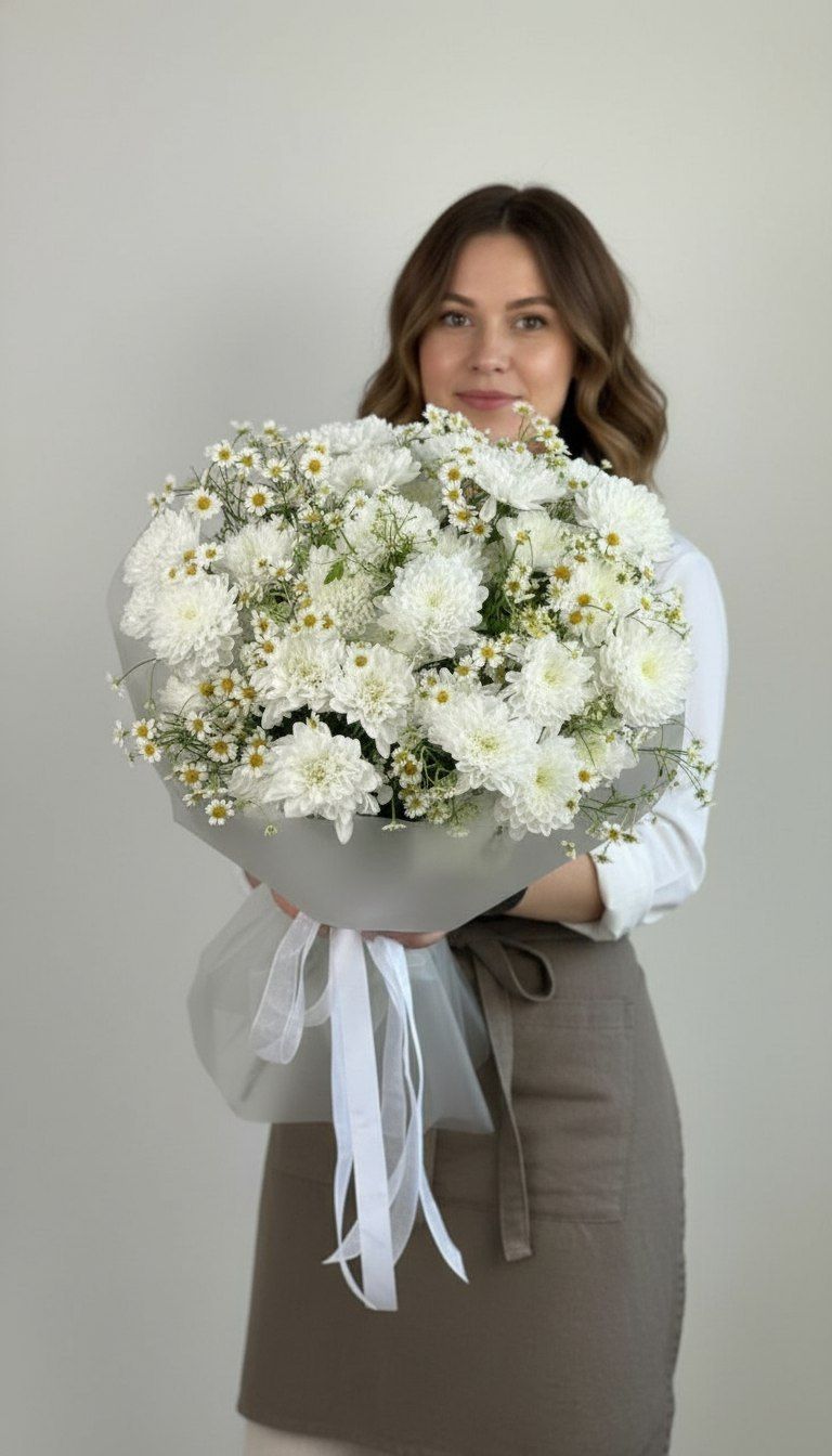 Пышное облако из белоснежной хризантемы в обрамлении нежных ромашек — этот букет словно вобрал в себя всю свежесть летнего утра. Настоящий гимн чистоте, простоте и естественной красоте, который подарит ощущение света и гармонии.