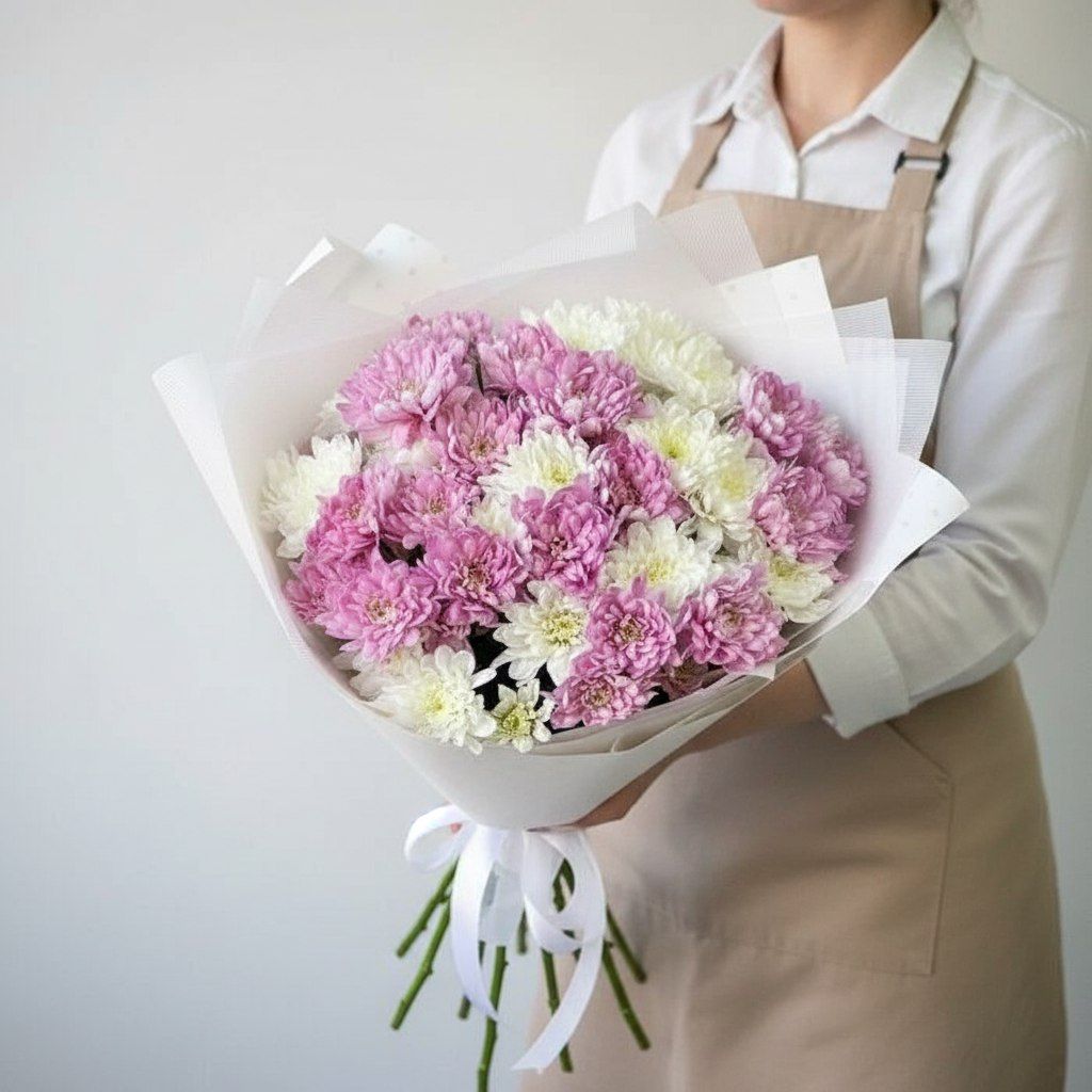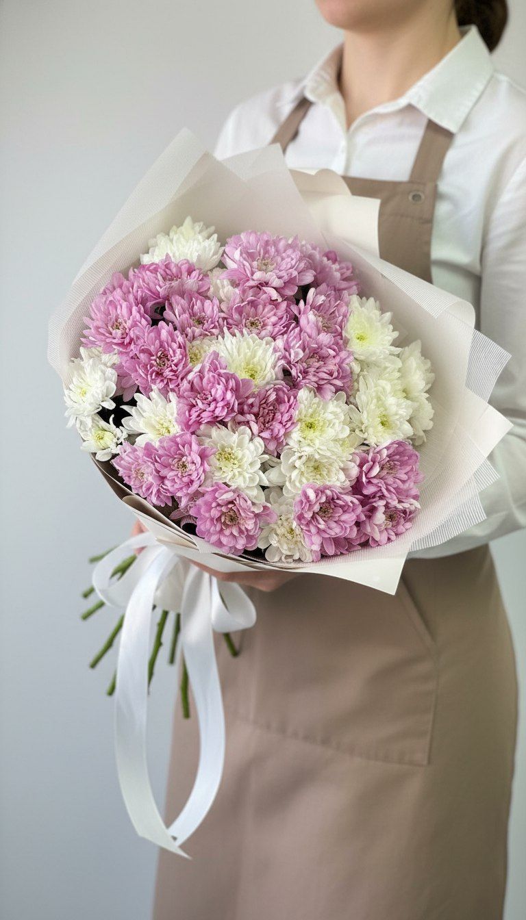 Изысканная композиция ко Дню Матери, созданная из кустовых хризантем премиальных сортов в пастельной гамме. Нежные переходы от персикового к кремовому и лавандовому подчеркивают многогранность маминой любви — тёплой, чистой и бесконечно нежной.