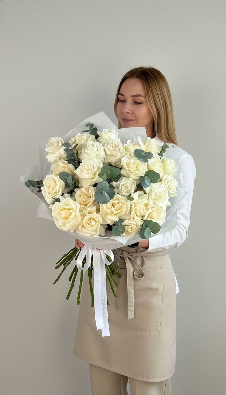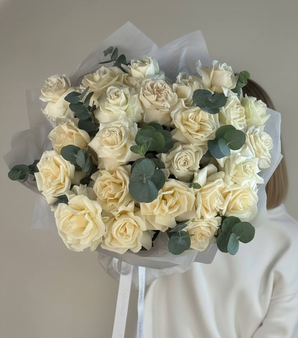 Изысканный букет ко Дню Матери, сочетающий элегантность французских роз в нежных пастельных тонах и ажурную зелень эвкалипта. Каждый бутон — как признание в любви, наполненное светом и нежностью.