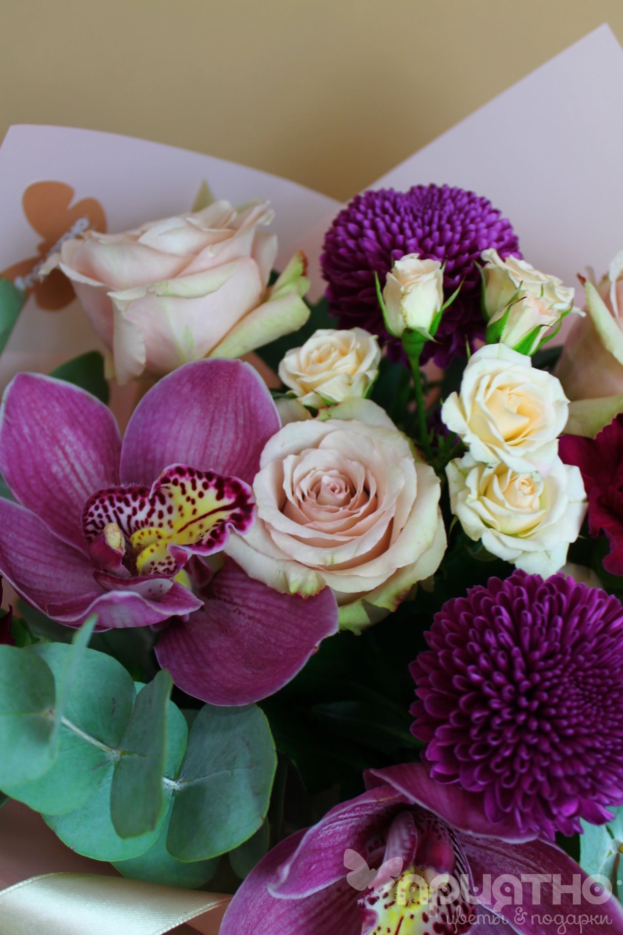 Роскошный букет из белых одноголовых и кустовых роз, фиолетовых одноголовых хризантем и гвоздик, нежных орхидей и листьев эвкалипта идеально подойдёт для торжественного поздравления, помолвки или признания в любви. Идеальный цветочный подарок на 8 Марта!