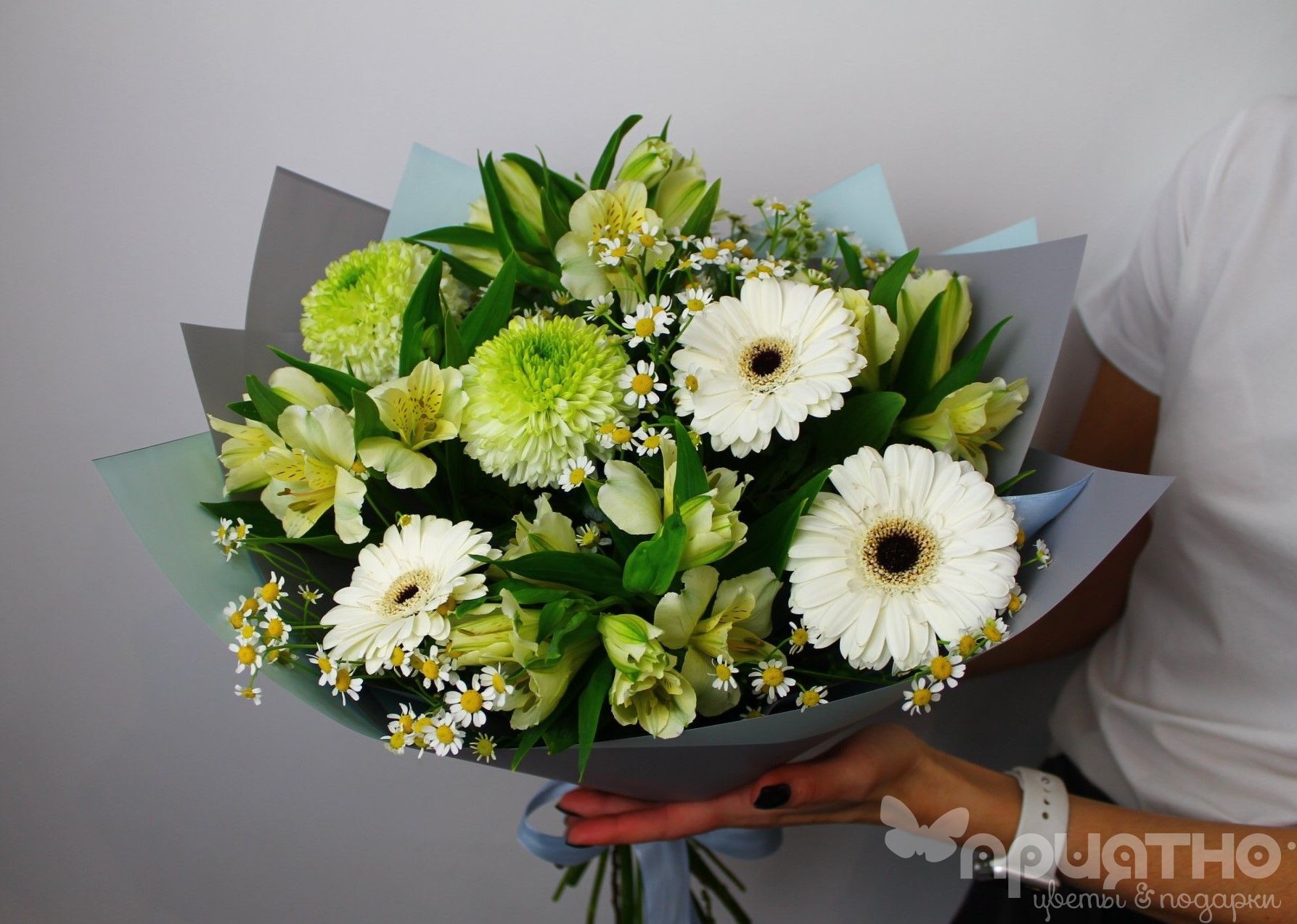 Этот невероятно красивый букет в бело-зеленых оттенках из светлых гербер, салатовых альстромерий и романтичных ромашек удивит и восхитит своим видом, послужит отличным поздравлением с праздником 14 Февраля, 8 Марта или Дня Рождения и поможет выразить самые нежные чувства!