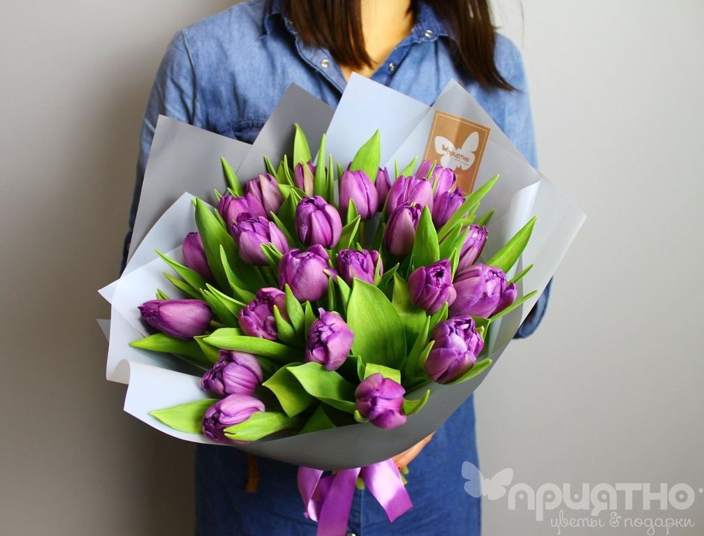 Такой букет из тюльпанов сиреневого цвета точнее всего передаст ваше почтение и преданность получателю.