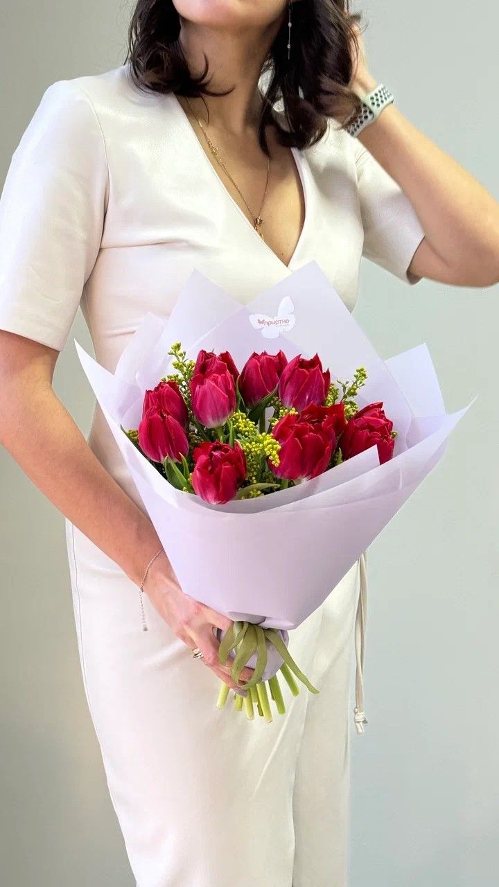 Букет "Малиновая Нежность": Идеальный Подарок на 8 Марта. Представьте себе сочетание утонченной элегантности и яркого весеннего настроения — именно так выглядит наш эксклюзивный букет "Малиновая Нежность". В его основе — роскошные малиновые пионовидные тюльпаны, которые словно воплощают нежность и страсть, дополняясь солнечными оттенками жёлтого солидаго. Такой букет станет идеальным подарком на 8 марта, символизируя начало весны, любовь и заботу.