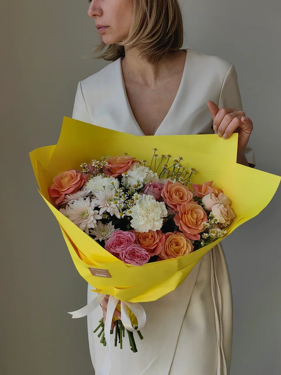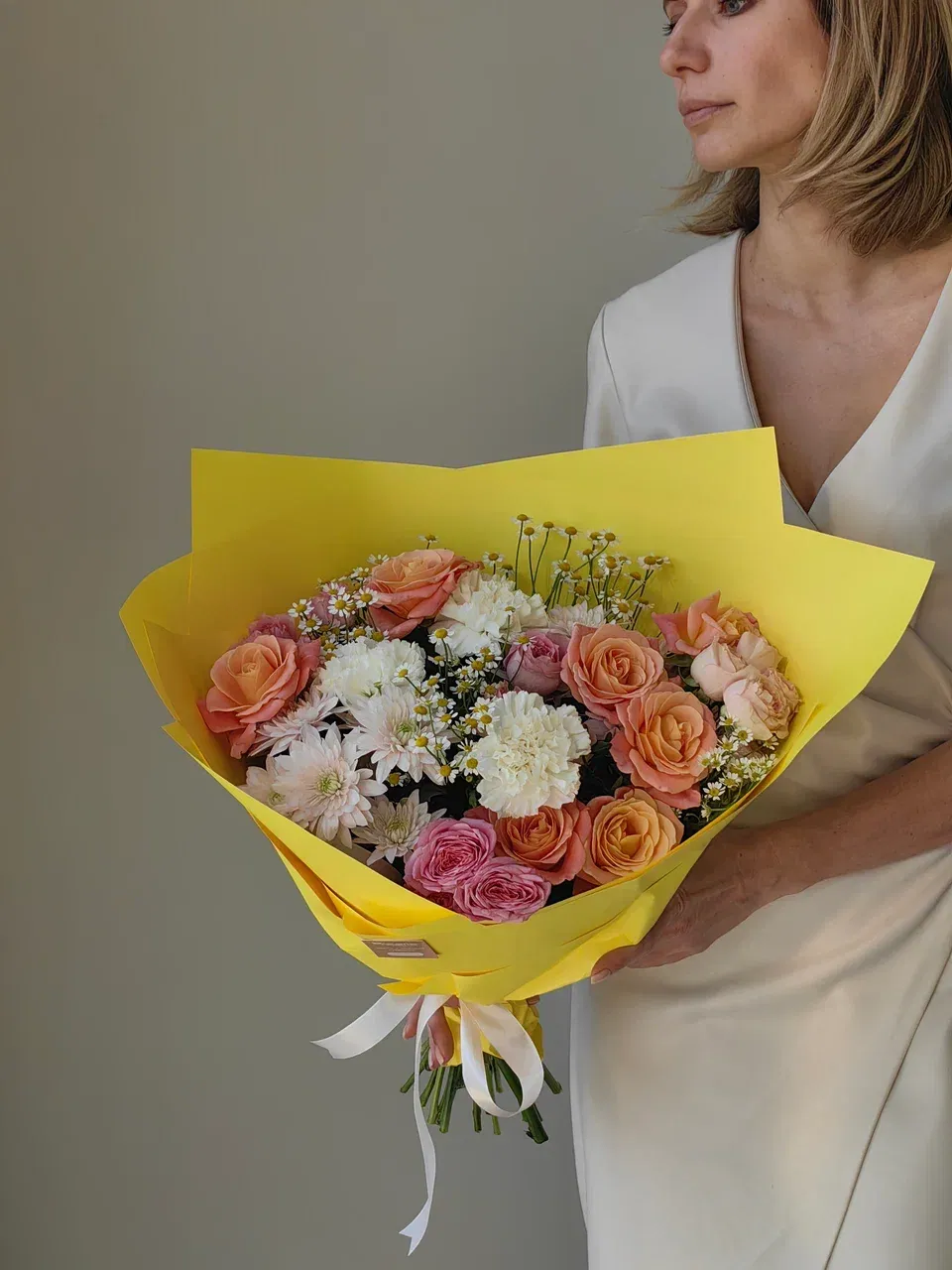 Погрузитесь в атмосферу солнечного изобилия с букетом "Солнечное Изобилие"! Этот яркий и ароматный букет сочетает в себе лучшие представители цветочного мира: ароматные розы, яркие гвоздики, элегантные диадемы и пышные кустовые пионовидные розы. Всё это собрано в тёплых жёлтых и рыжих оттенках, которые напоминают о первых лучах весеннего солнца и наполняют сердце радостью.