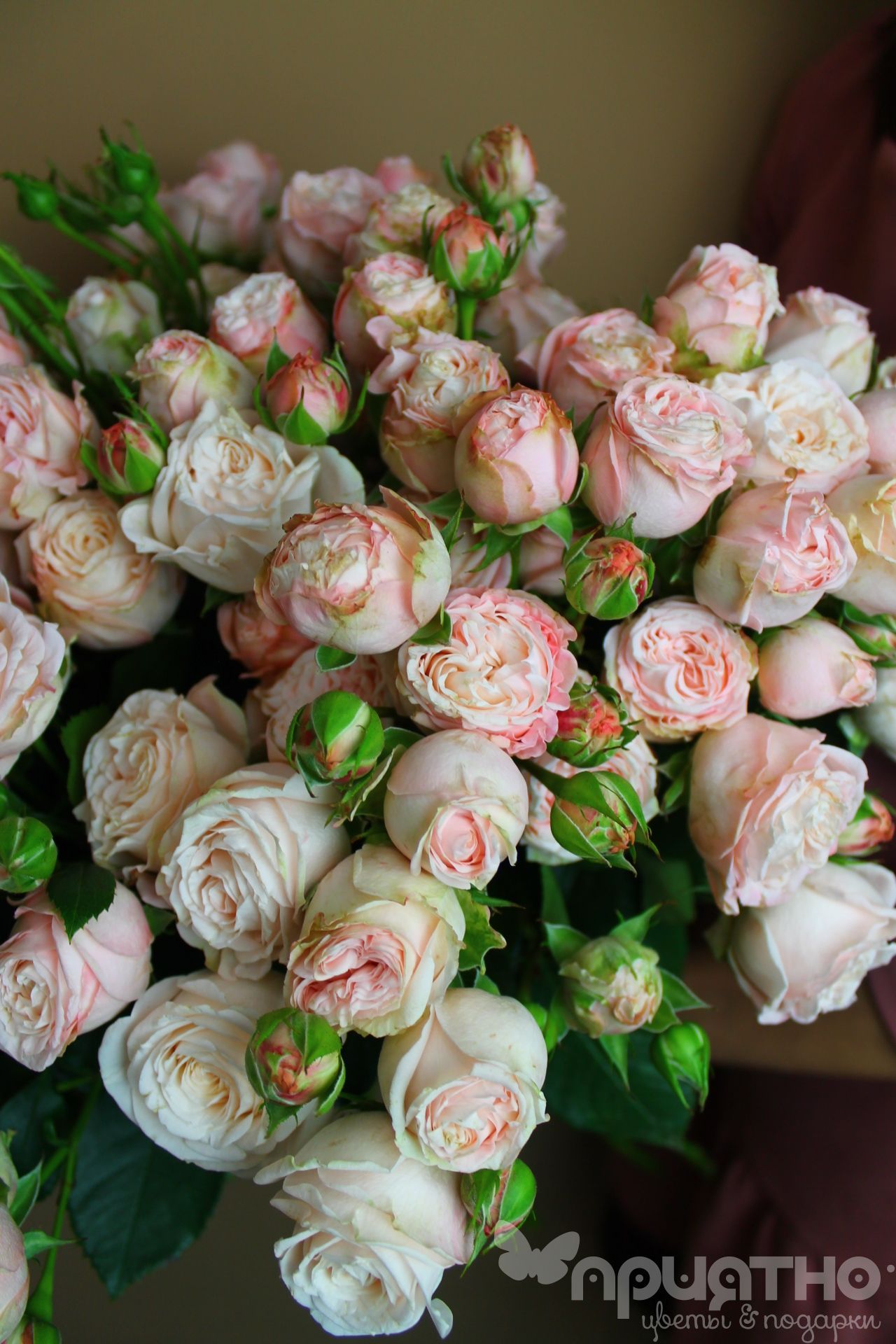 Такой букет из кустовых пионовиных роз нежного цвета, точнее всего передаст ваше почтение и преданность получателю.