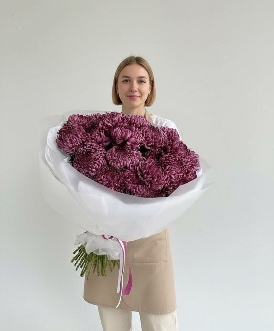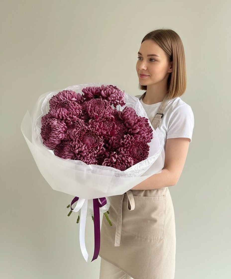 Хризантема Бигуди — это не просто цветок, а настоящий малиновый взрыв эмоций! Её причудливые, кудрявые лепестки и сочный, глубокий оттенок говорят сами за себя. Такой букет не нуждается в сопровождении. Он — самодостаточный подарок, который кричит о ваших чувствах без слов.