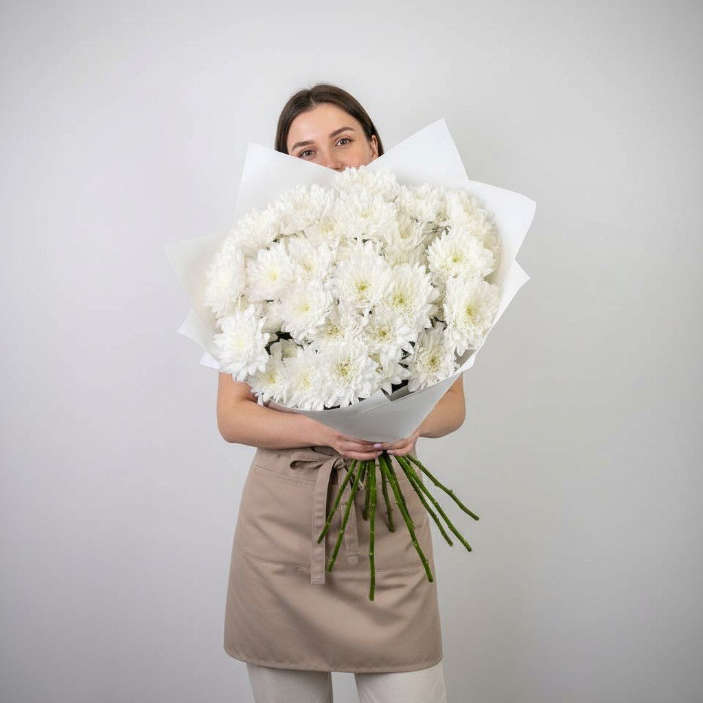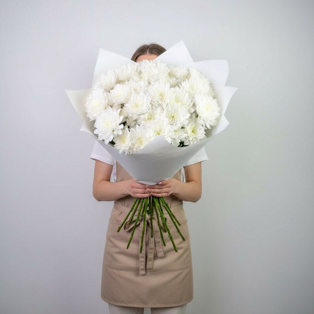 Моно букет «Белое Облако» — это воплощение безупречного вкуса и чистой элегантности. Наша белая кустовая хризантема премиального сорта с изысканно уложенными лепестками и идеальной формой бутона создает ощущение невесомой роскоши.