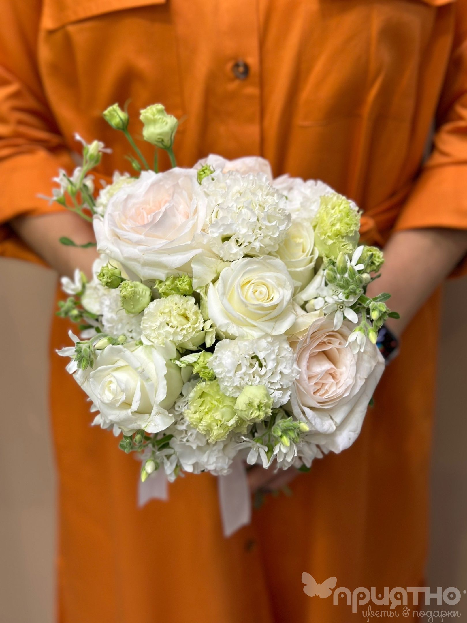 Представьте пробуждение в провансальском саду, где капли росы переливаются на лепестках... Ваш свадебный букет — идеализированная поэма в светлых тонах, созданная для невесты с безупречным европейским вкусом. В основе композиции:
