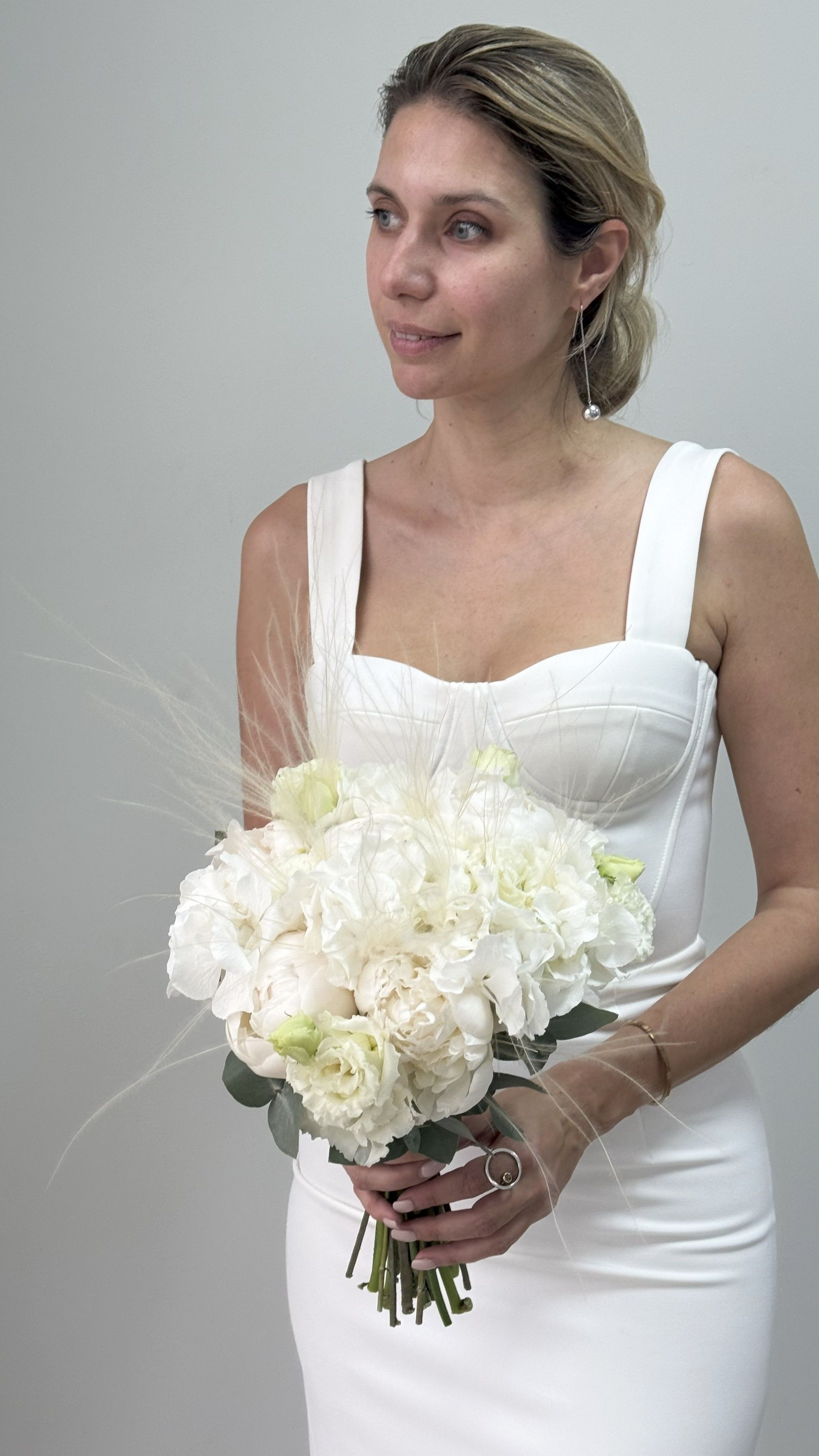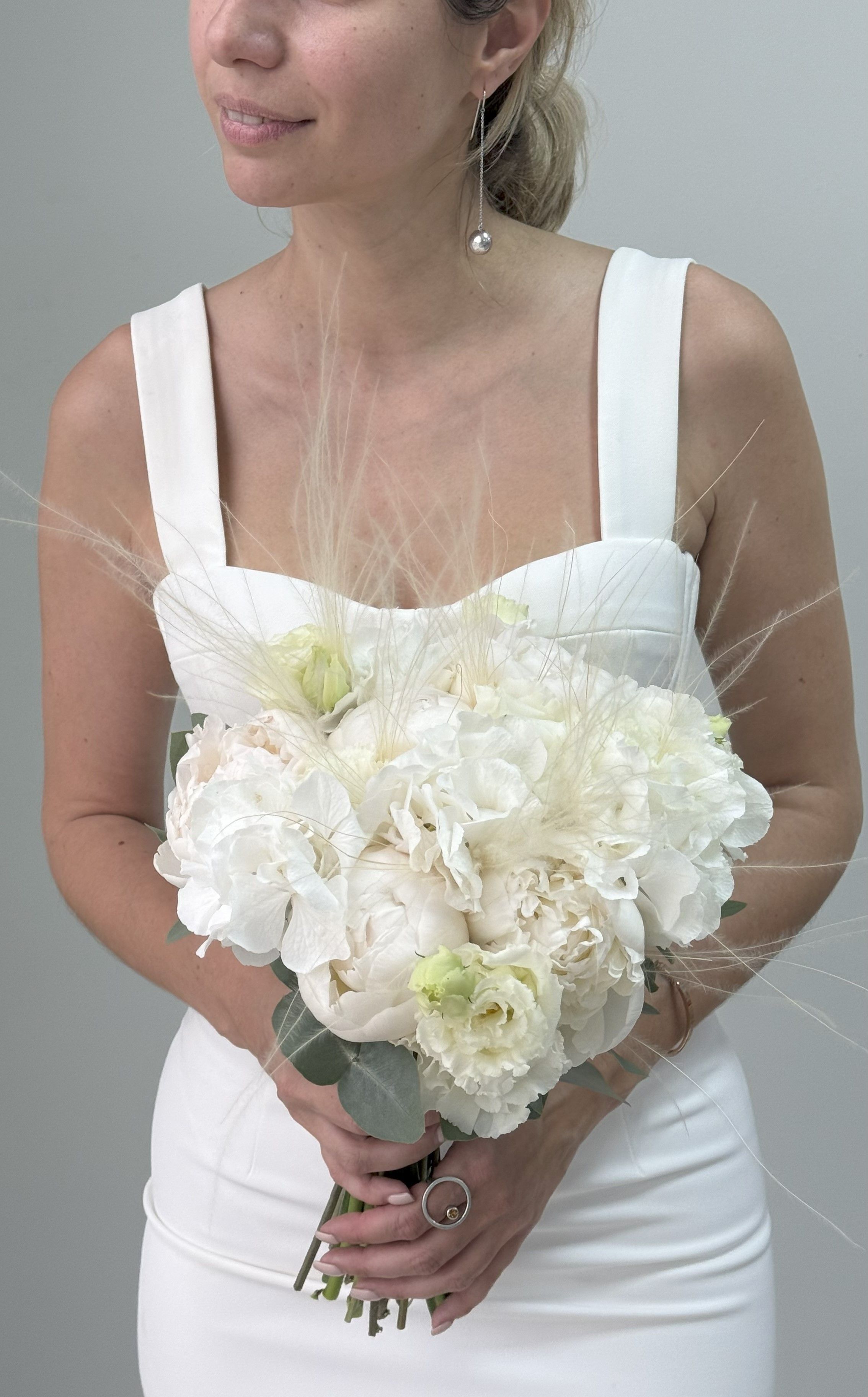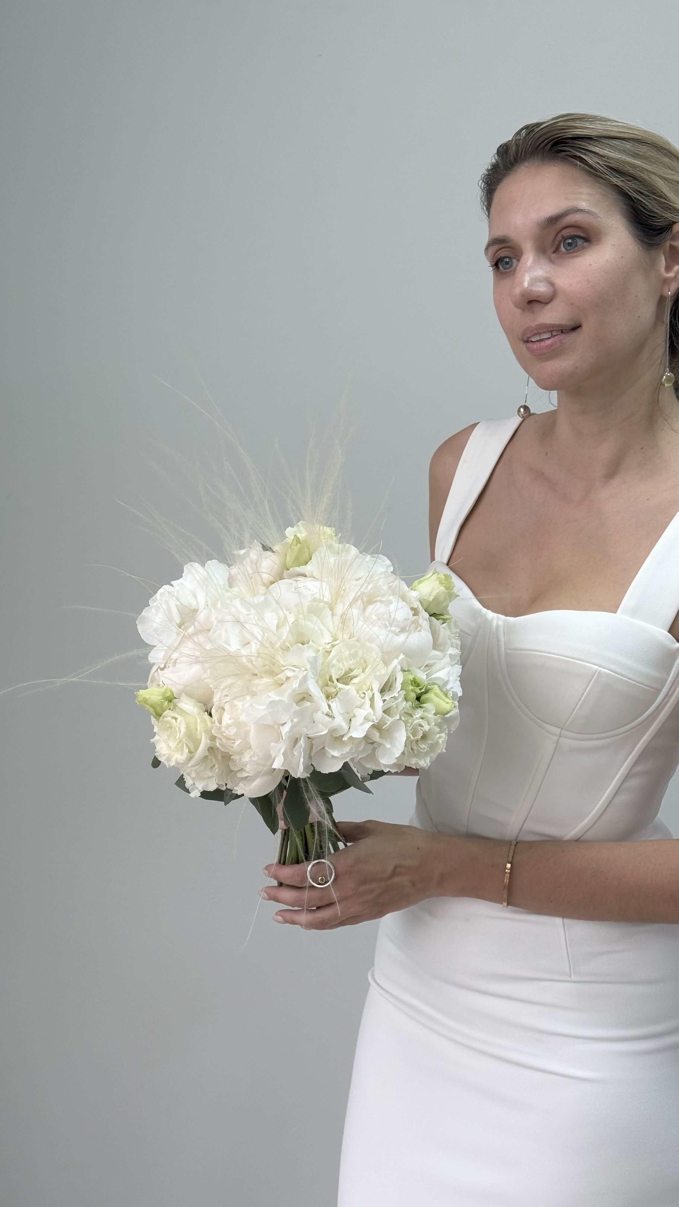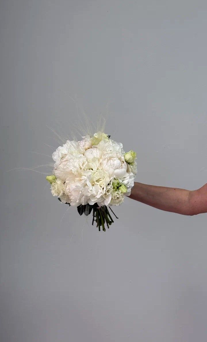 Вечная романтика в белоснежном исполнении! Роскошный букет "Снежная королева": бархатные пионы сорта 'Duchesse de Nemours', нежная эустома 'Мариачи Бланко' и золотистые сухоцветы лагуруса. Изысканное сочетание свежести и винтажного шарма. Ваш идеальный аксессуар для классической и боХо свадьбы!