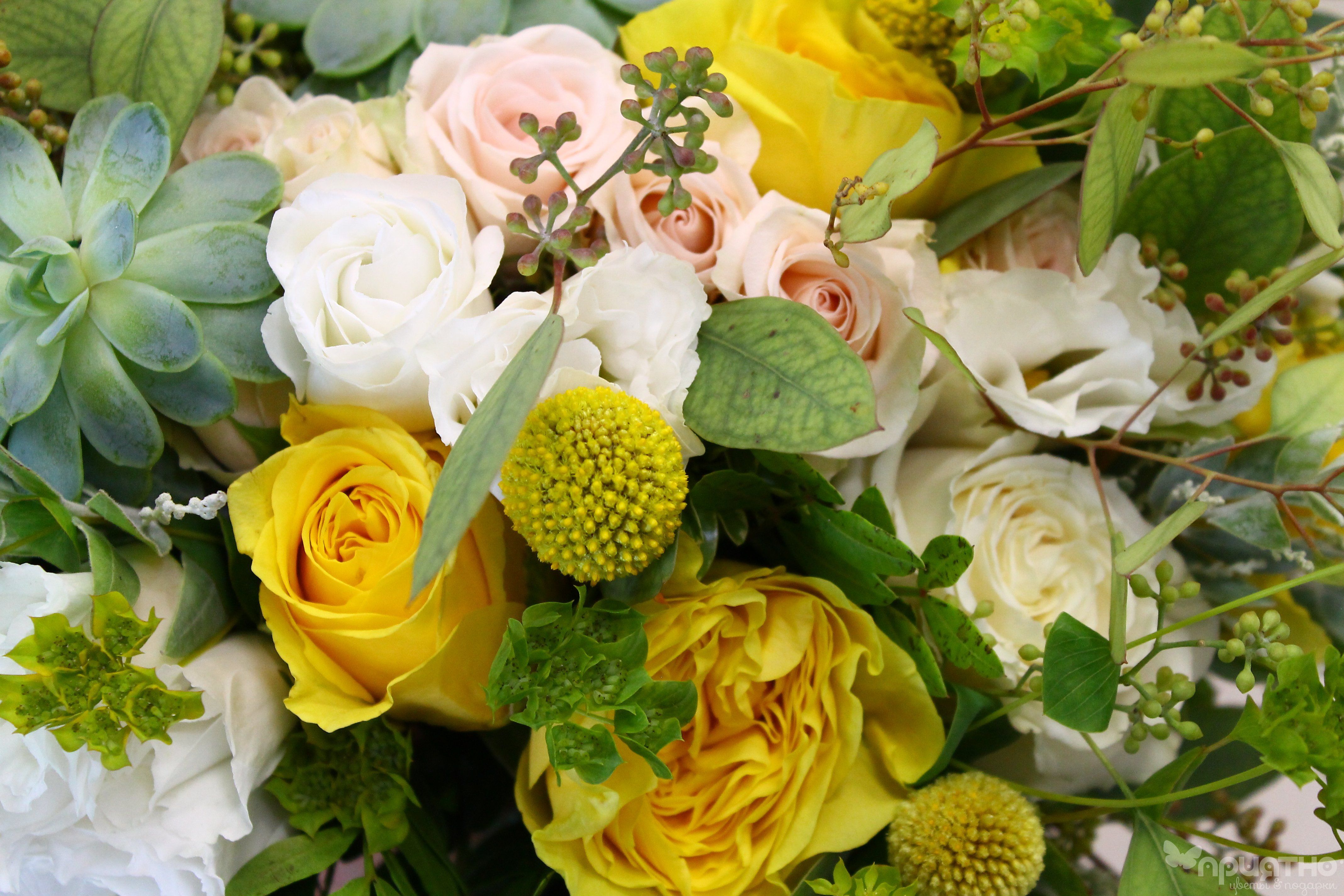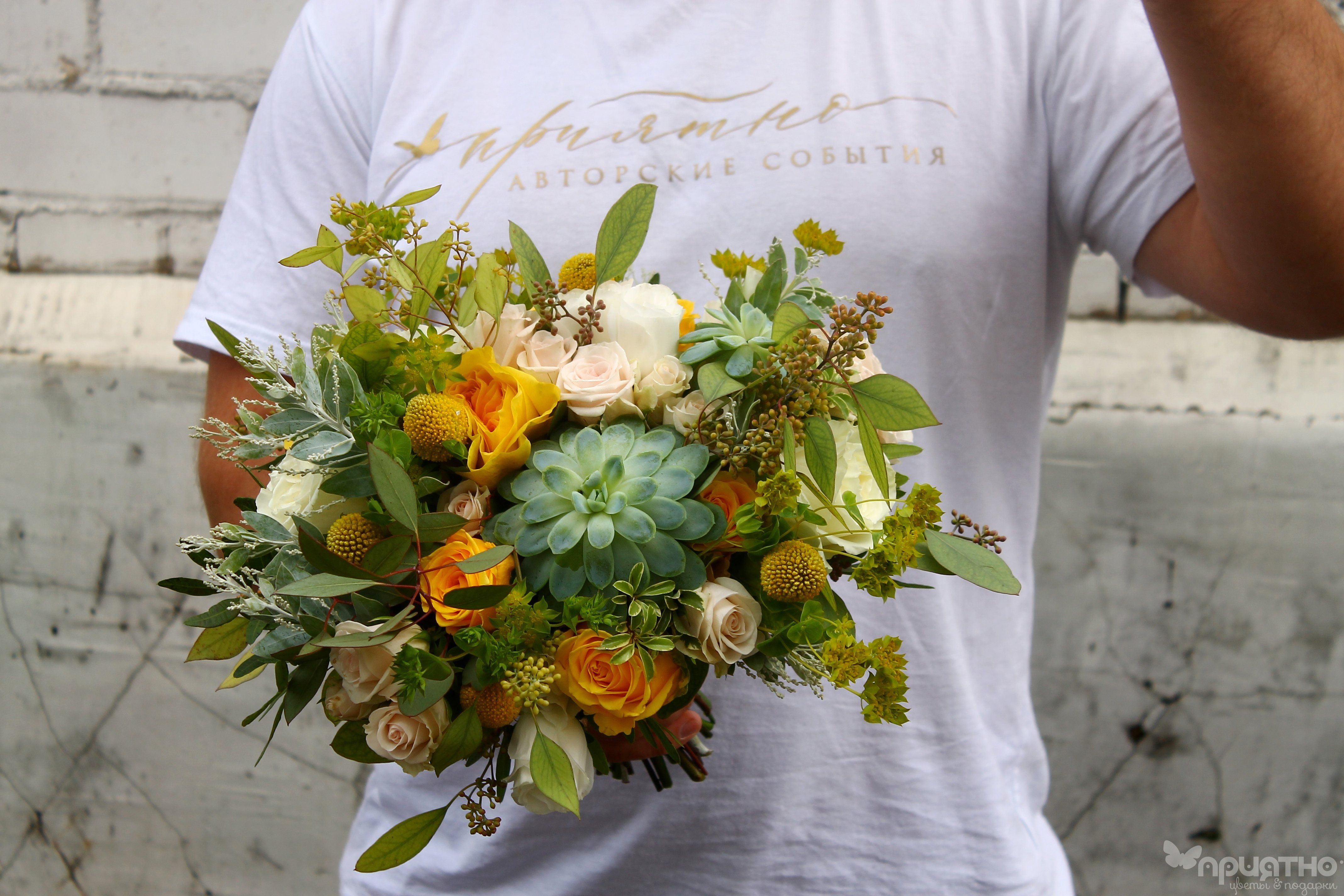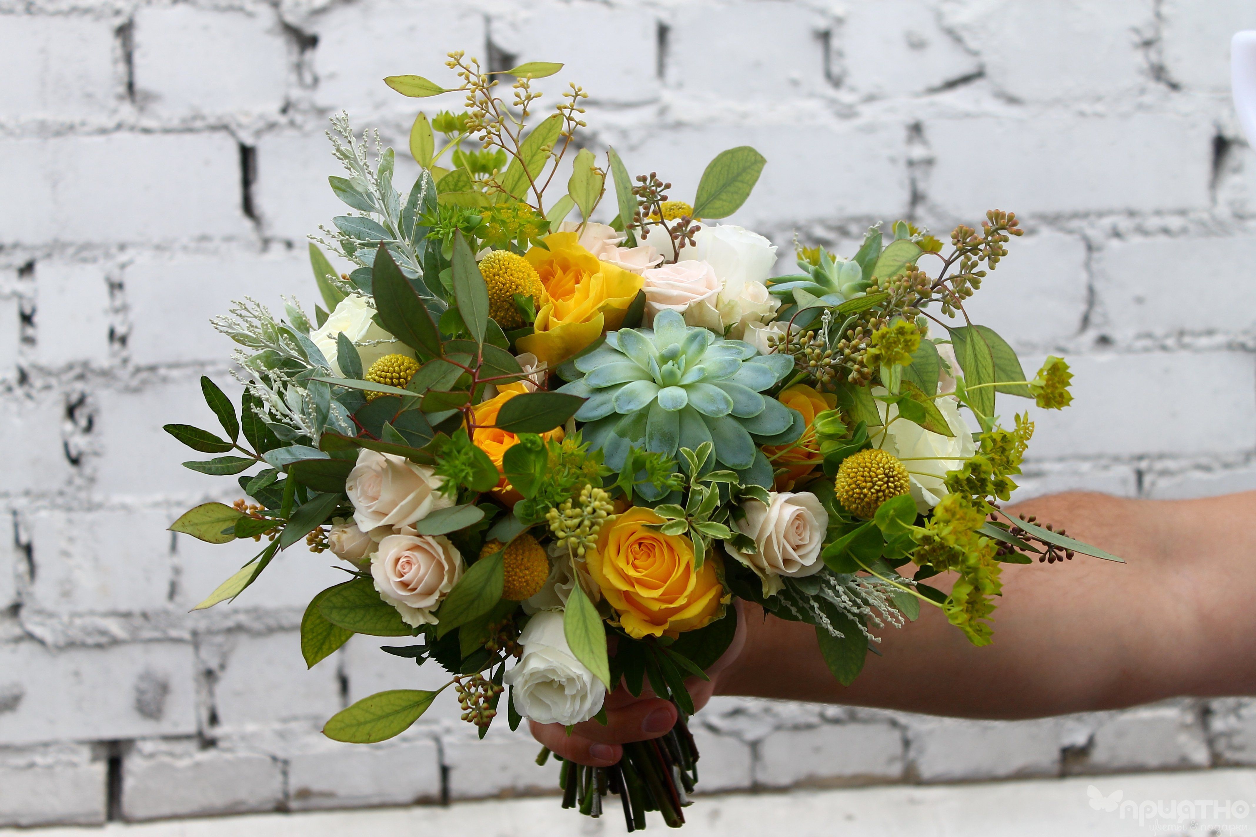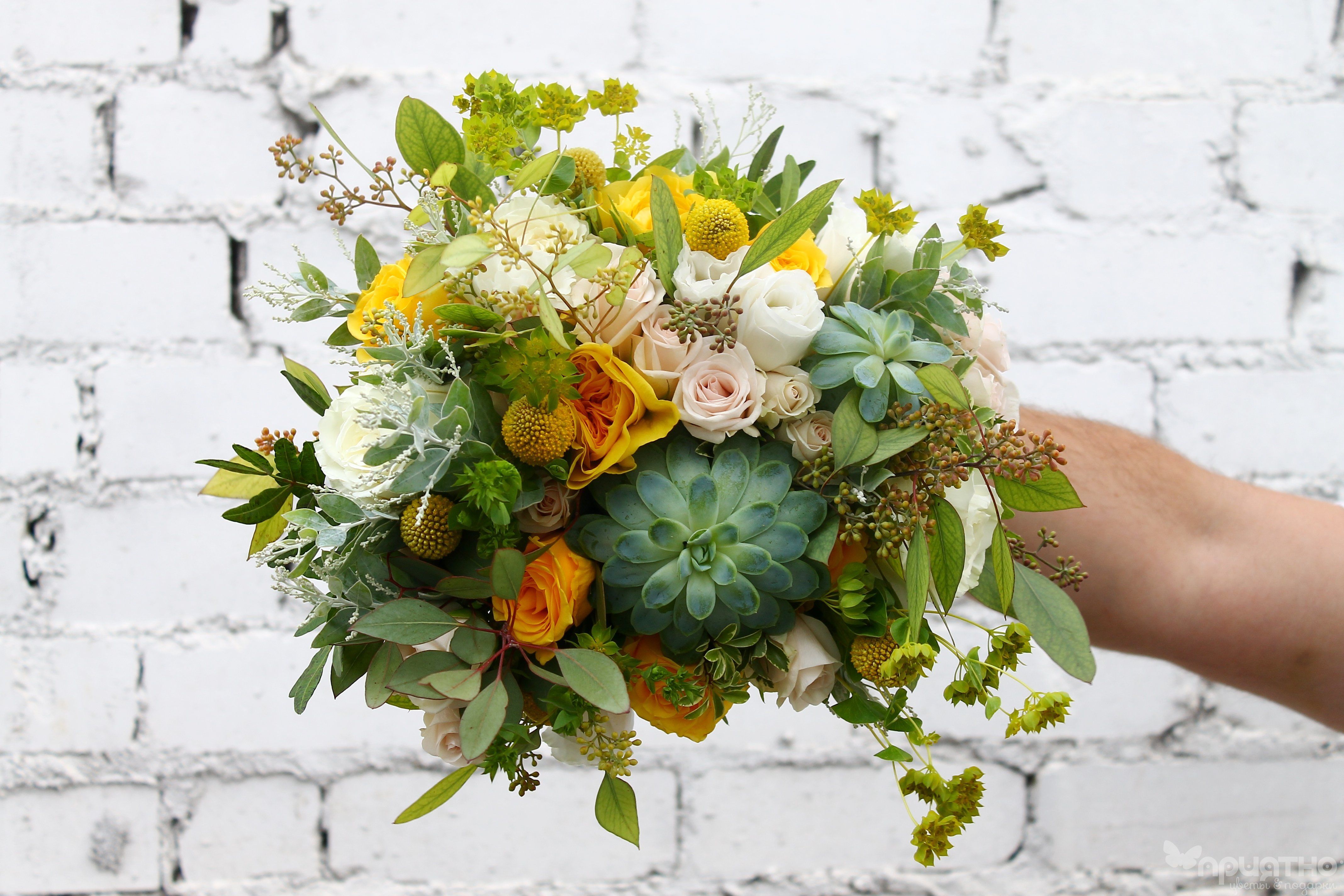 Создайте образ сияющей нимфы! Ваш букет — как луч солнца в весеннем лесу: кристальная чистота белых роз, изумрудная свежесть суккулентов и золотые искры краспедии. С 2015 года соединяем природу и элегантность для самых солнечных невест.