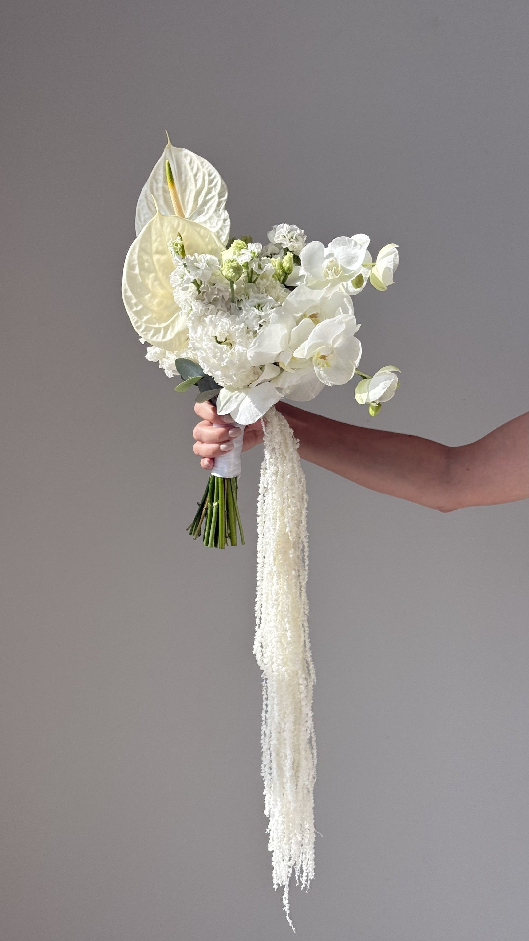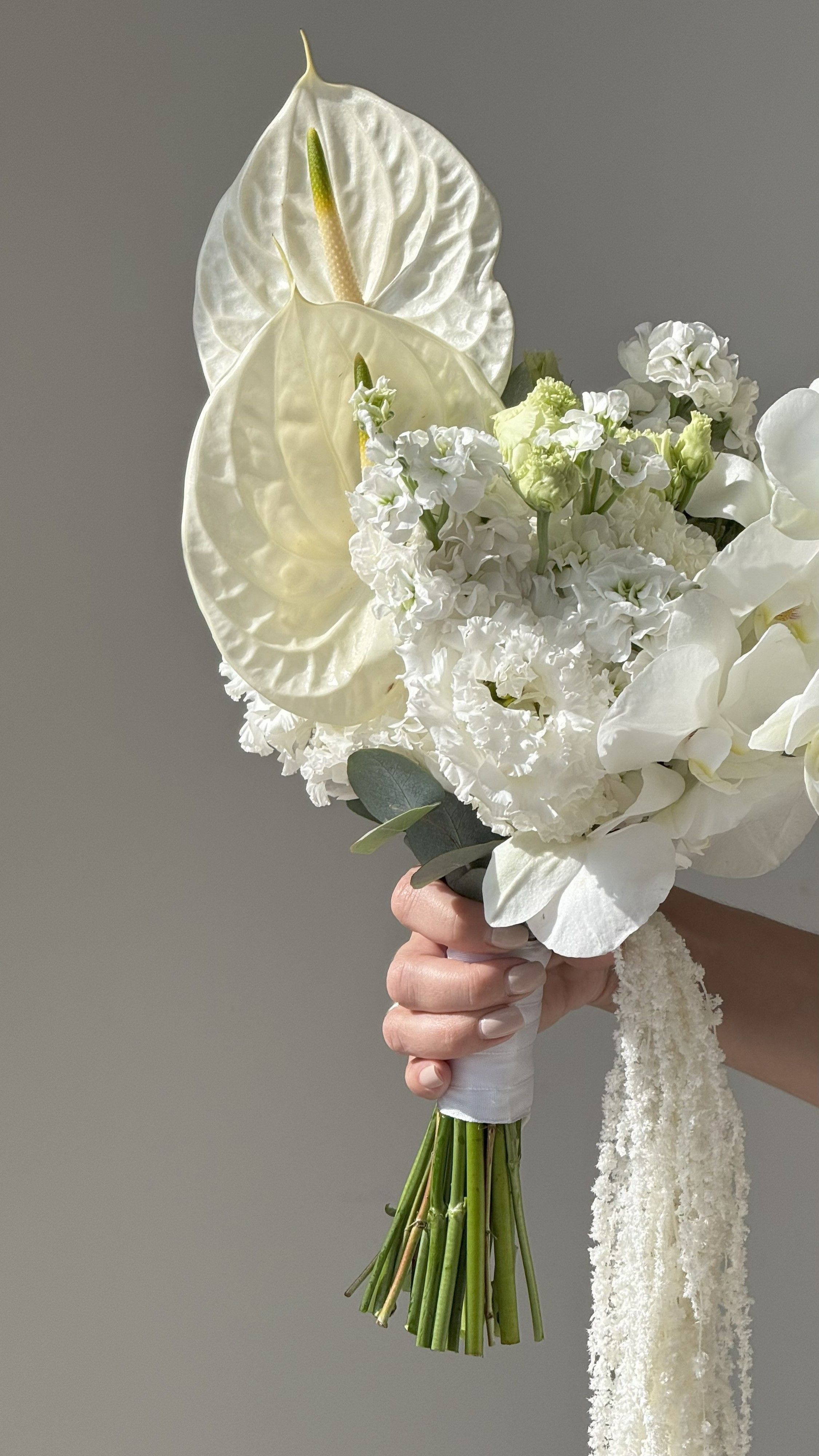 Представьте, как тропический водопад застыл в ваших руках... Ваш свадебный букет — это шедевр экзотической элегантности и невесомой динамики. Для невесты, ищущей смелость в утонченности, мы создали композицию из воскового антуриума, ниспадающих орхидей, ароматной маттиолы и кружевной эустомы. Ампельные линии орхидей придают букету драматичный объем и движение, превращая его в живое произведение искусства. Доставка по Москве и Новой Москве сохранит безупречность вашего эксклюзива!