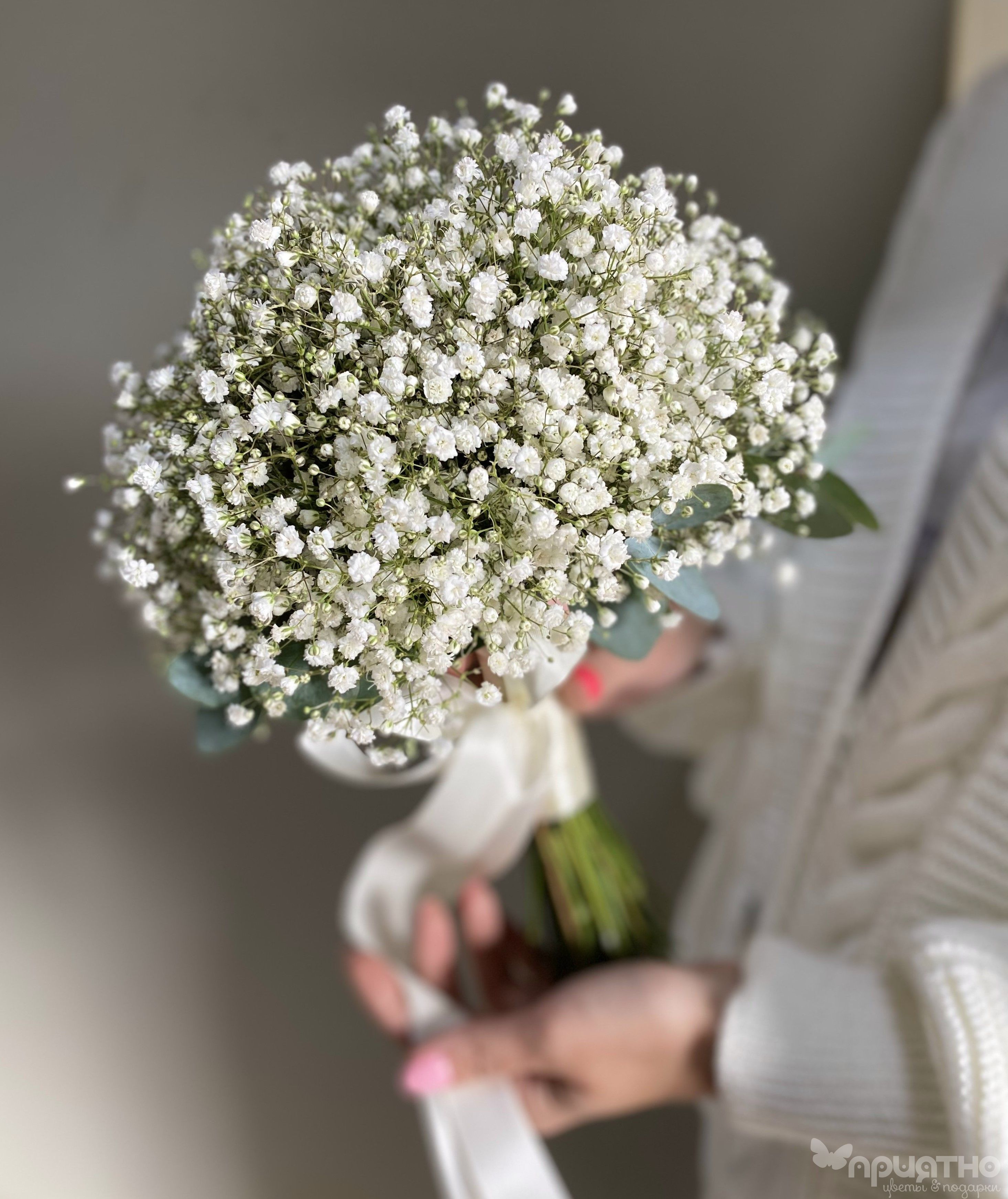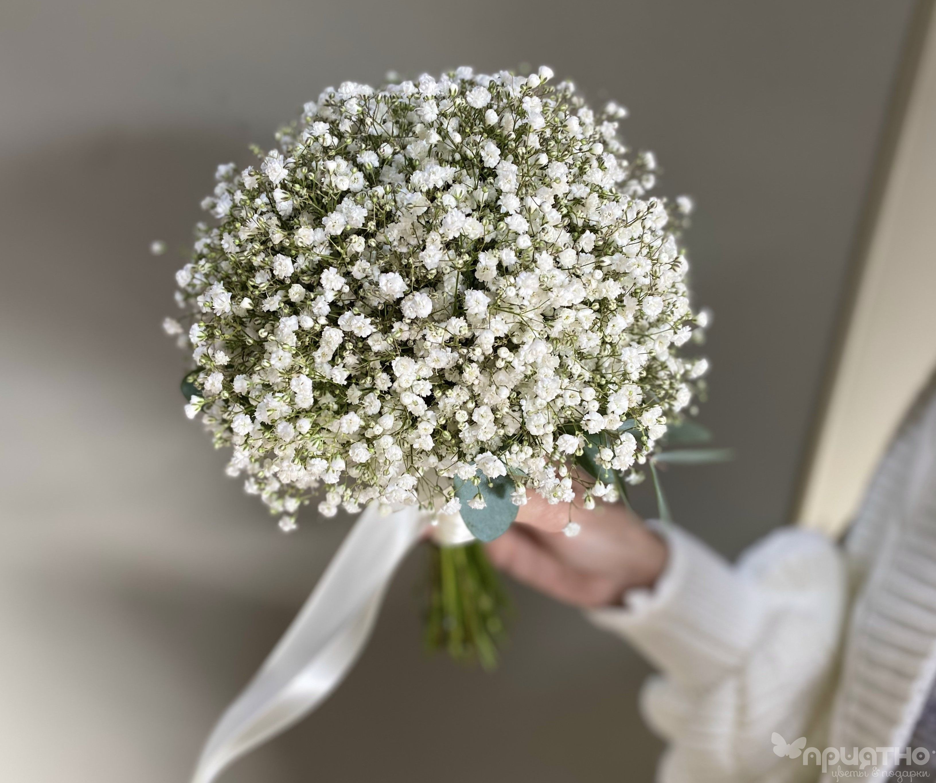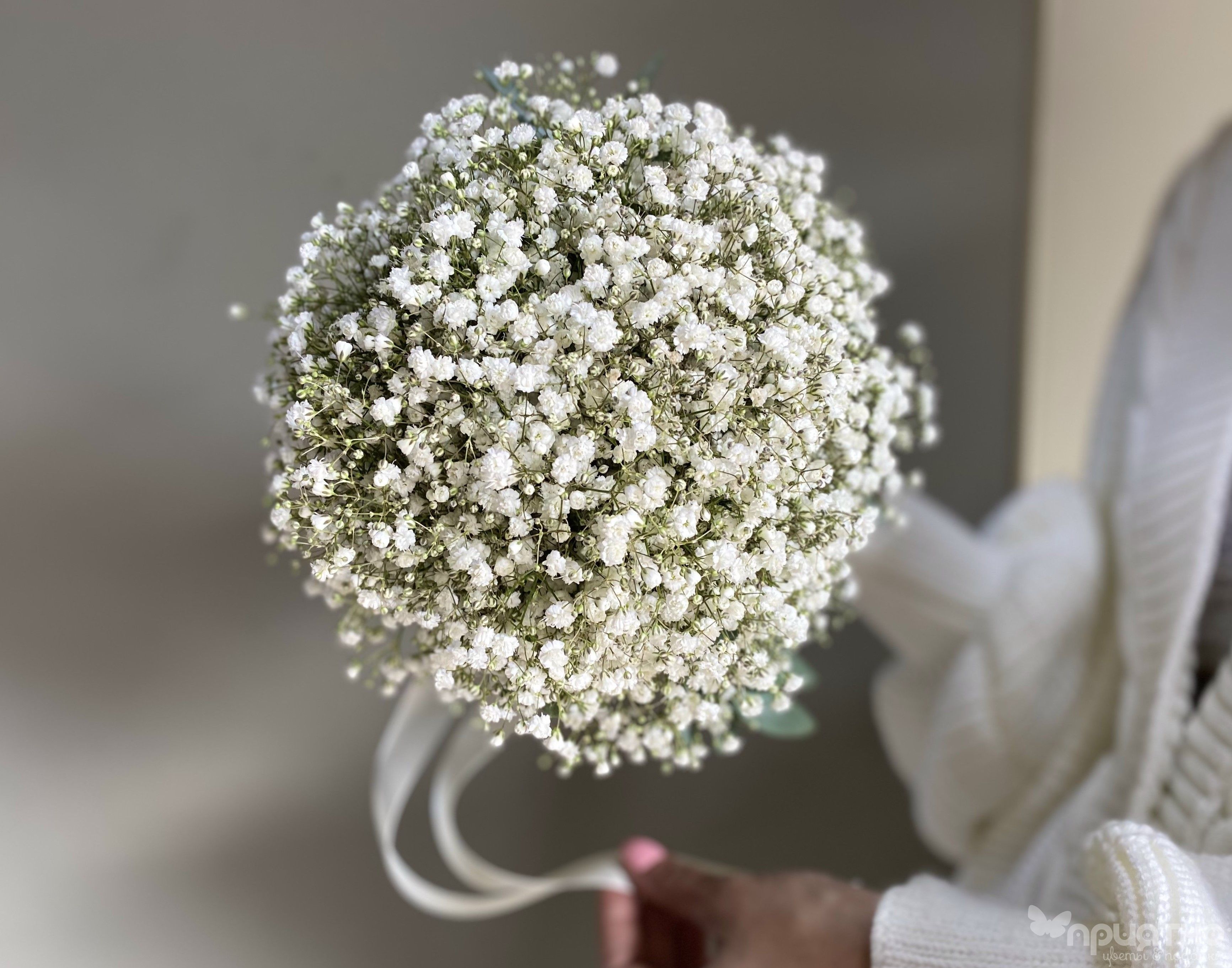 Подарите невесте воплощение чистой, парящей элегантности! Наш эксклюзивный моно-букет — это гимн воздушной нежности, сотканный из отборной белоснежной гипсофилы премиум-сорта.