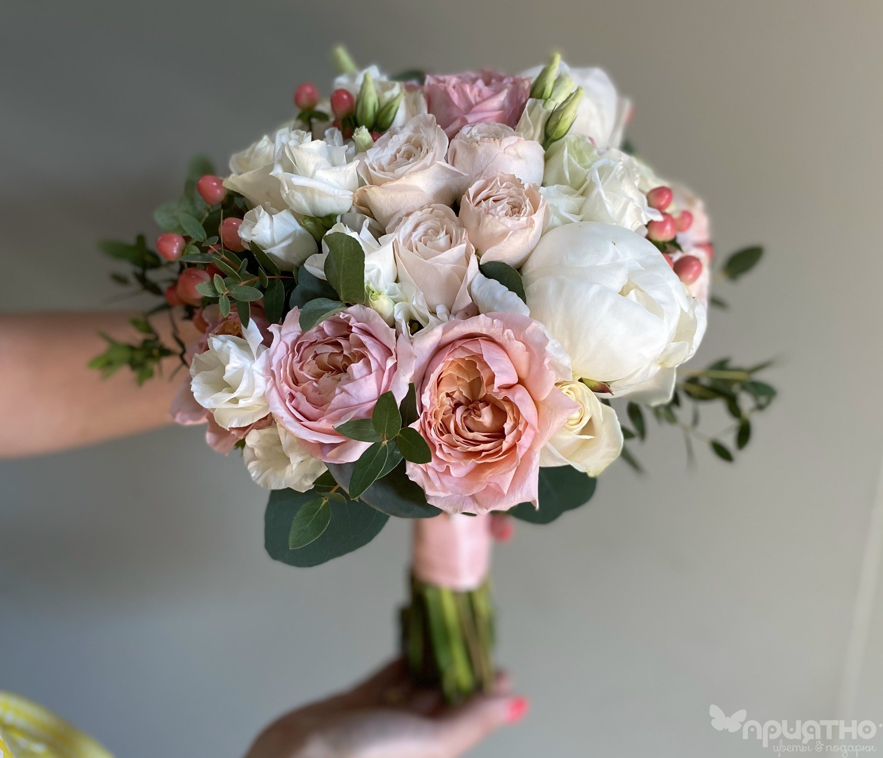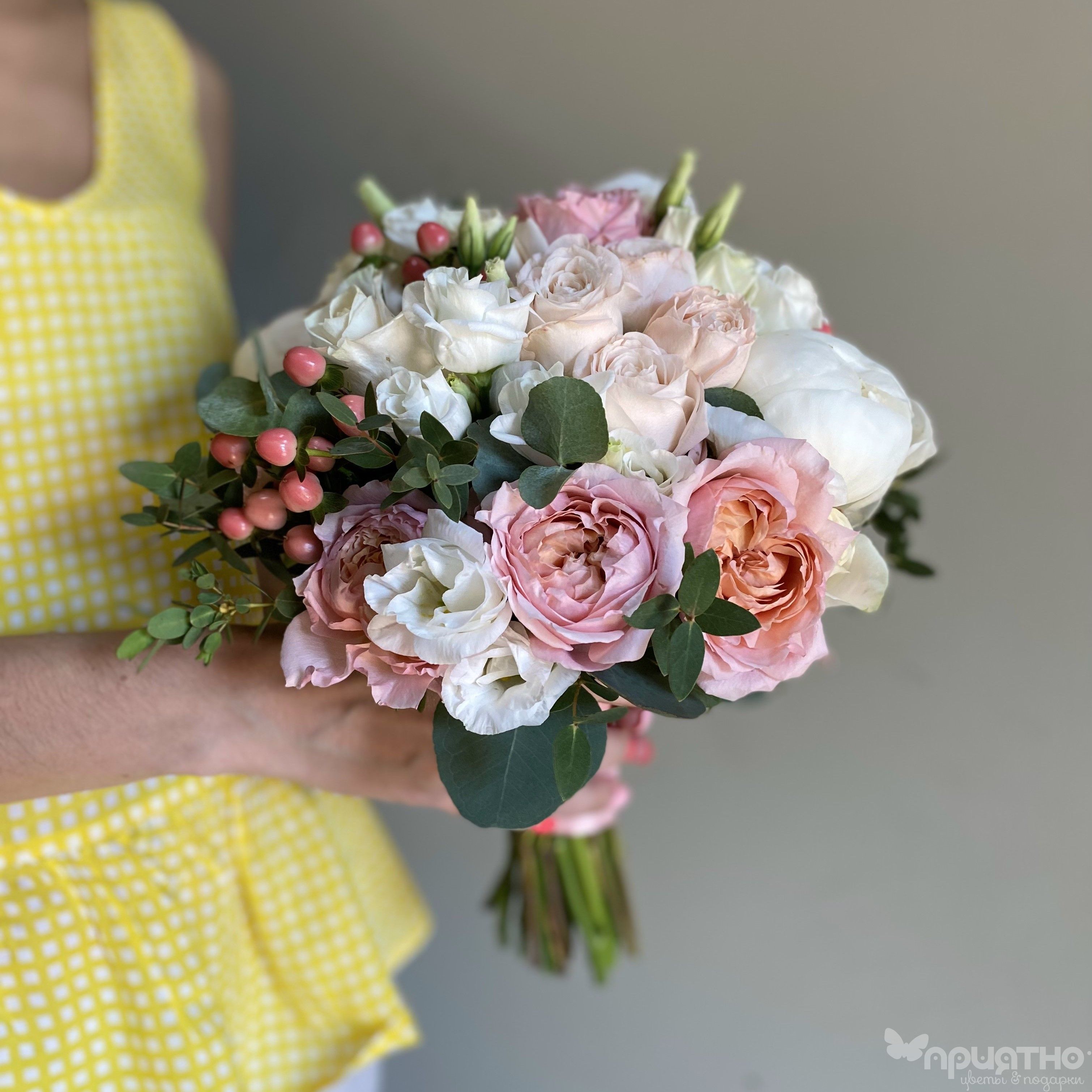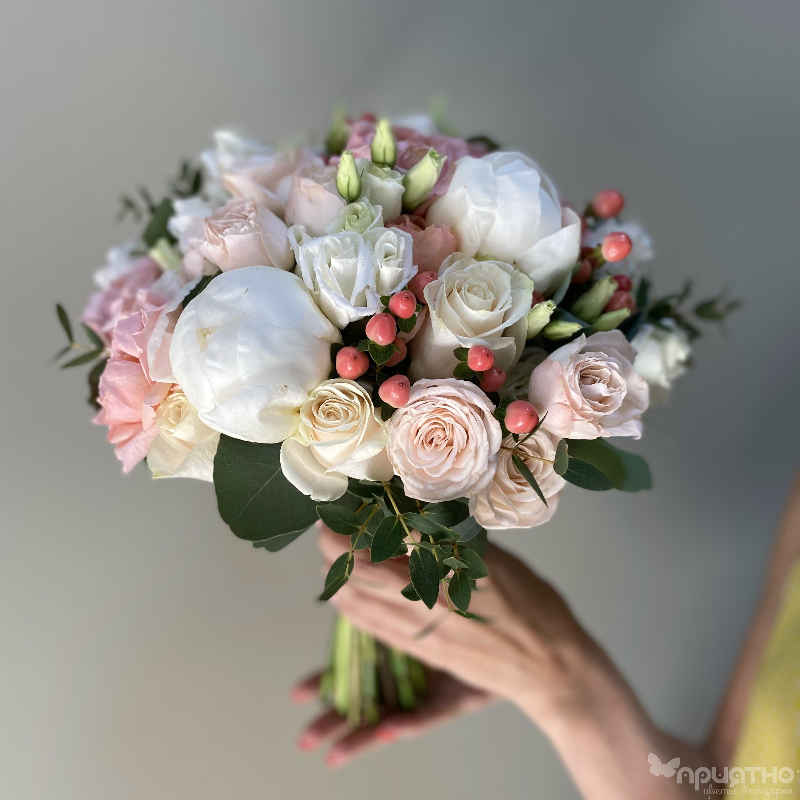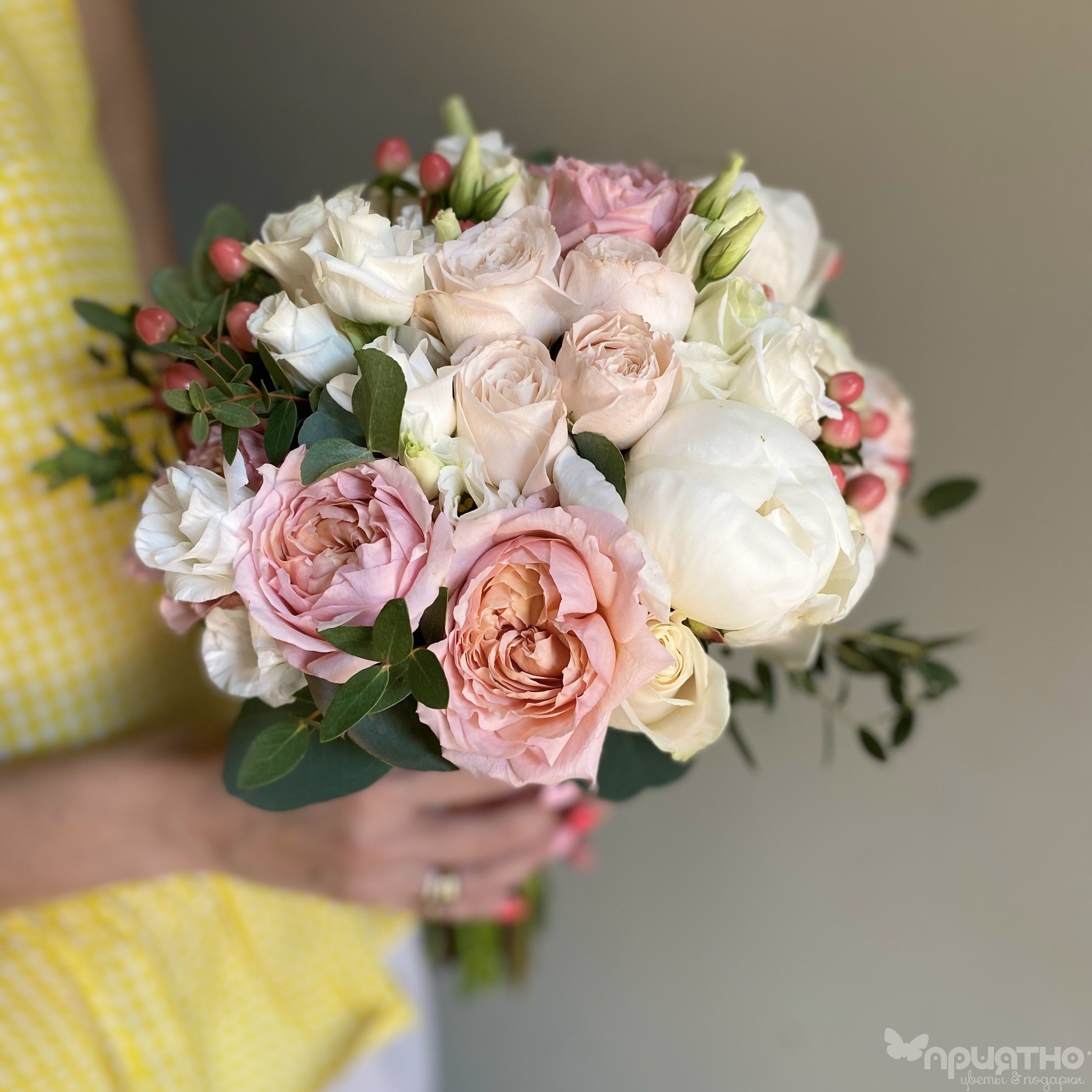 Воздушная эустома окутывает букет теплым кружевом, а игра фактур достигает совершенства: бархат пионов, шелк "Джульетты", нежные волны эустомы, блестящие ягоды гиперикума, серебристый эвкалипт и трендовая зелень фисташки для графичного акцента и свежести.
