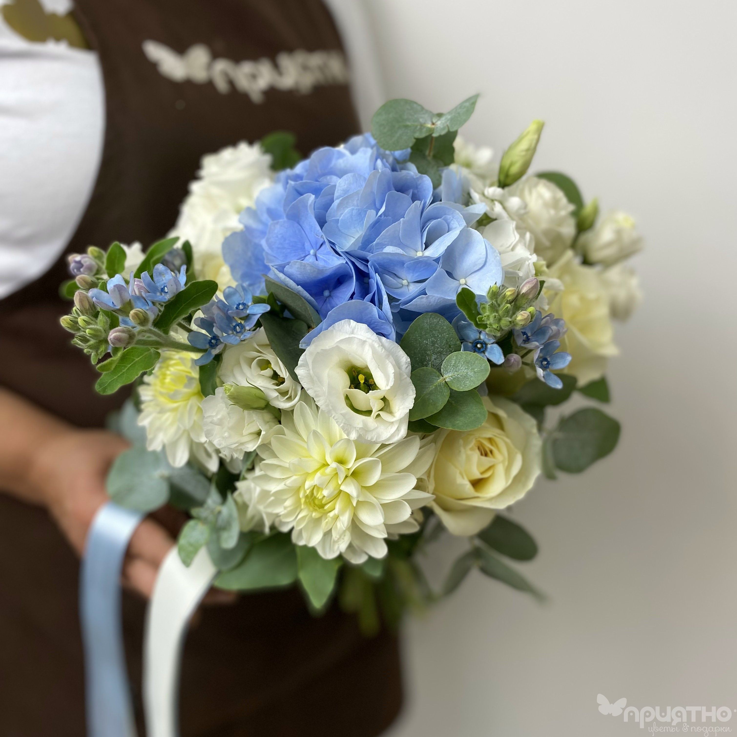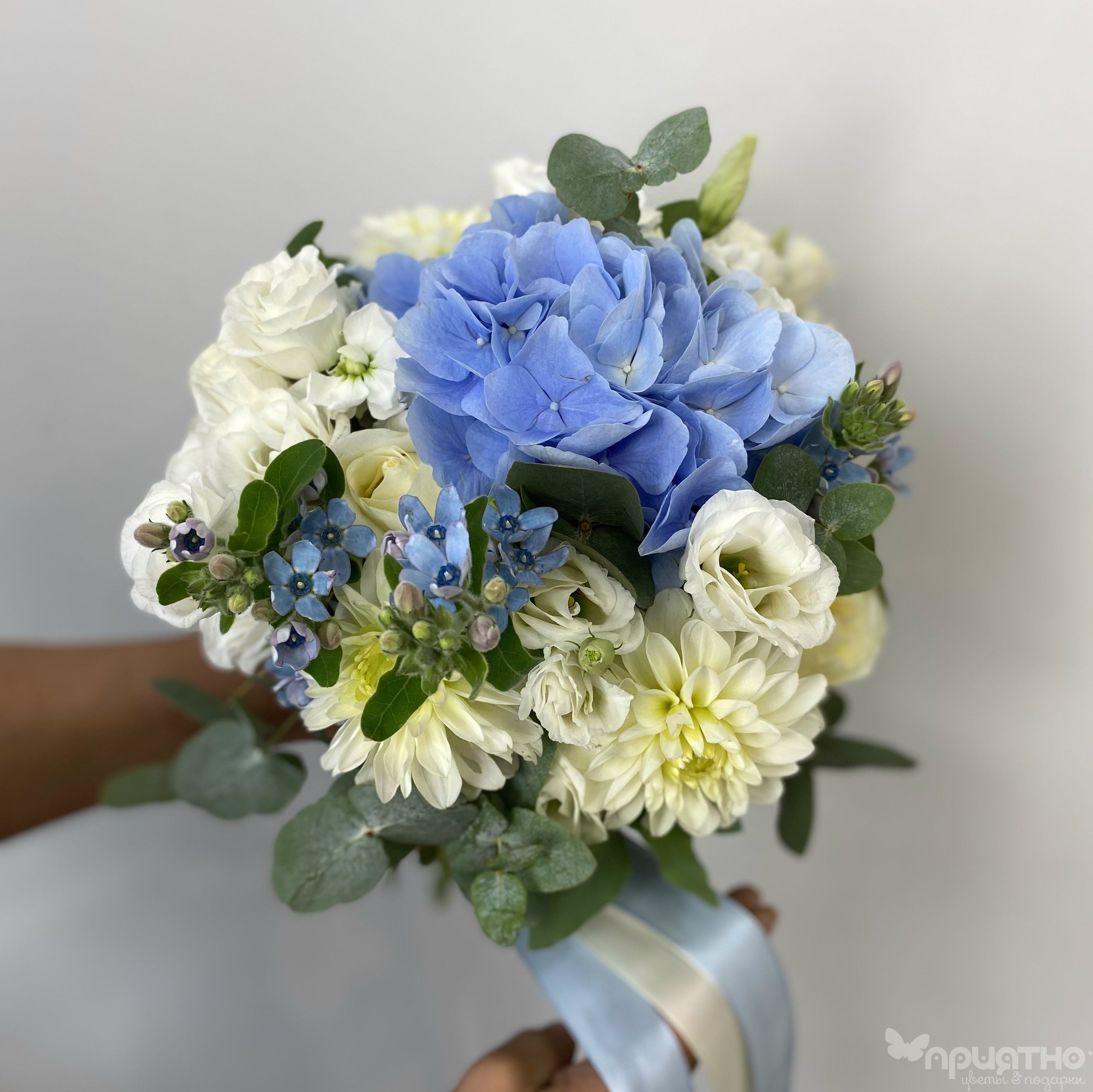 Подарите невесте дыхание морского бриза и чистоту первого утра! Наш эксклюзивный букет — это симфония бело-голубых оттенков и изысканных текстур. Пышная гортензия создает облако объема, а скульптурный георгин добавляет графичную элегантность. Нежная эустома окутывает композицию воздушным кружевом холодных тонов.