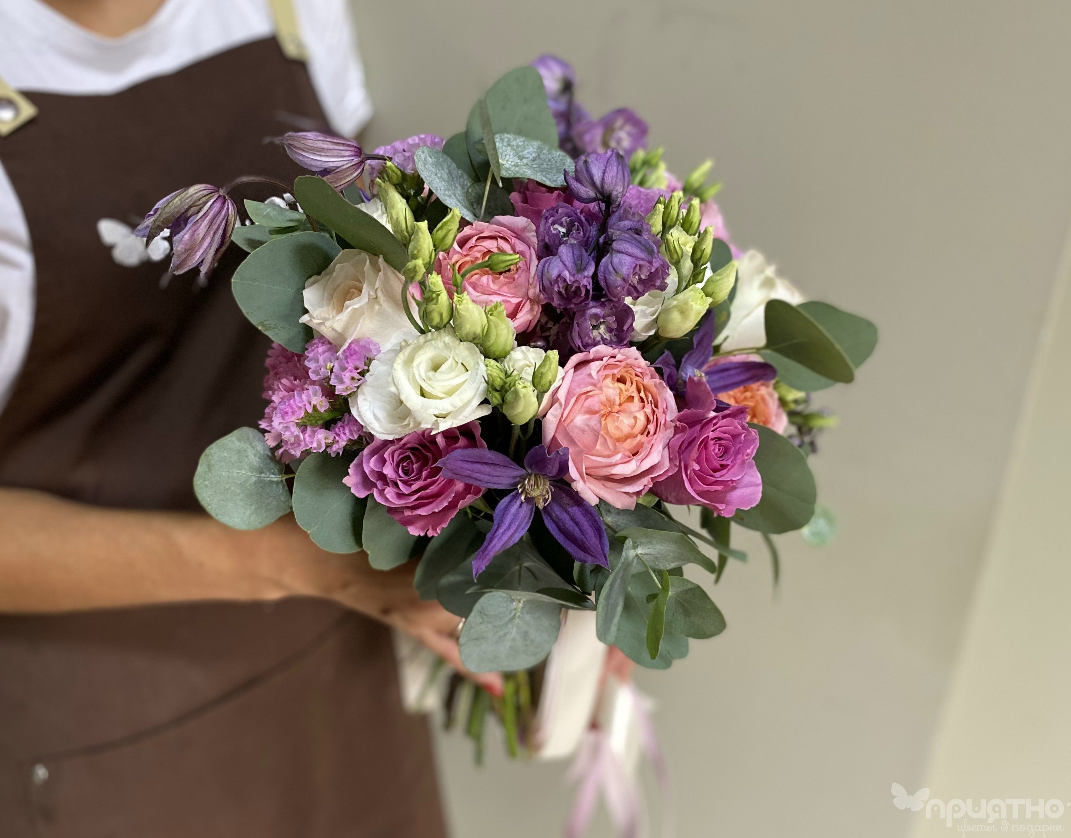 Вертикаль и грацию придают статные дельфиниумы, а воздушная эустома окутывает композицию теплым кружевом. Изысканную фактуру добавляют клематис с его шелковыми нитями и статица с мерцающими соцветиями. Серебристый эвкалипт объединяет палитру, придавая свежесть и объем.