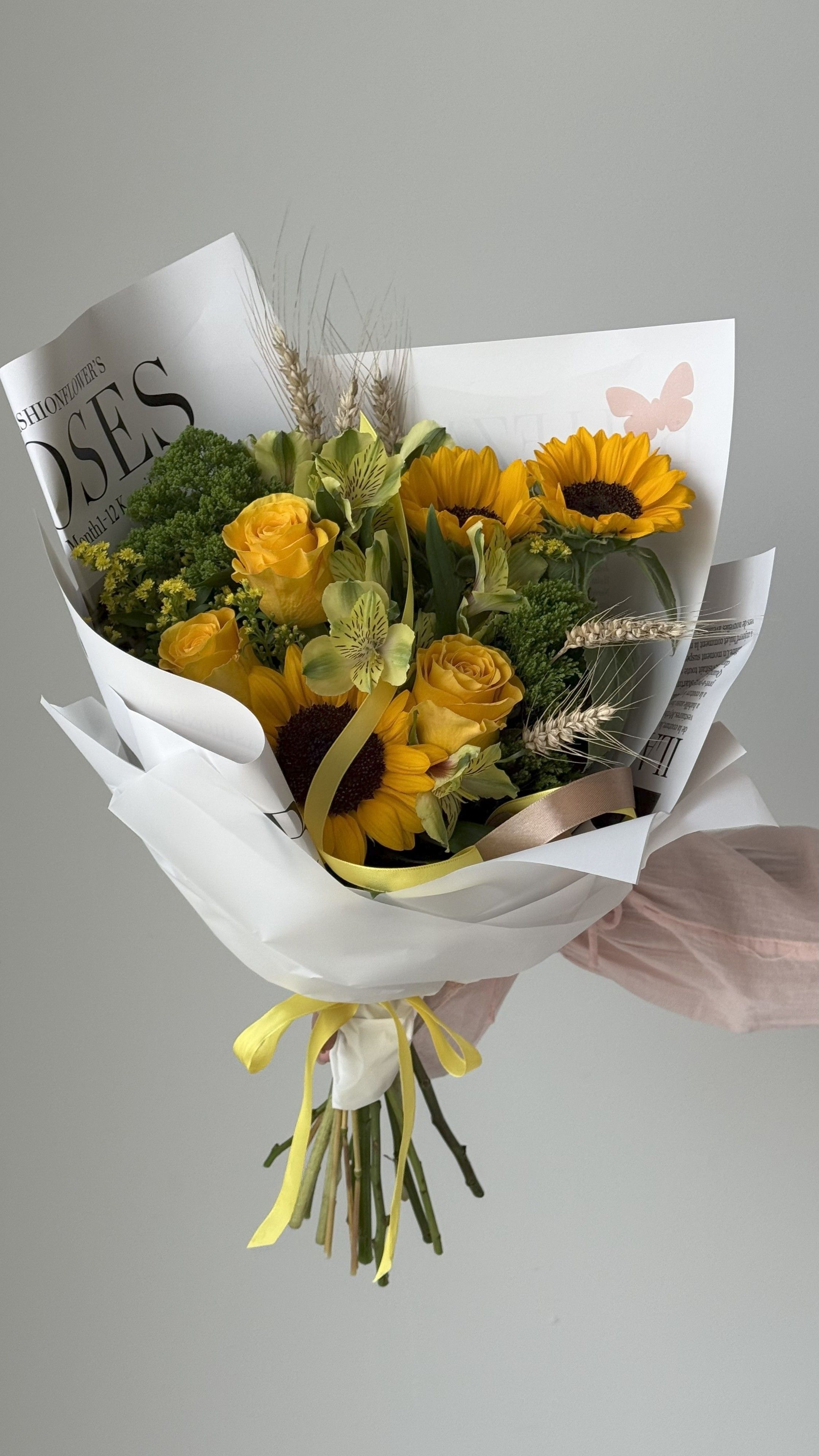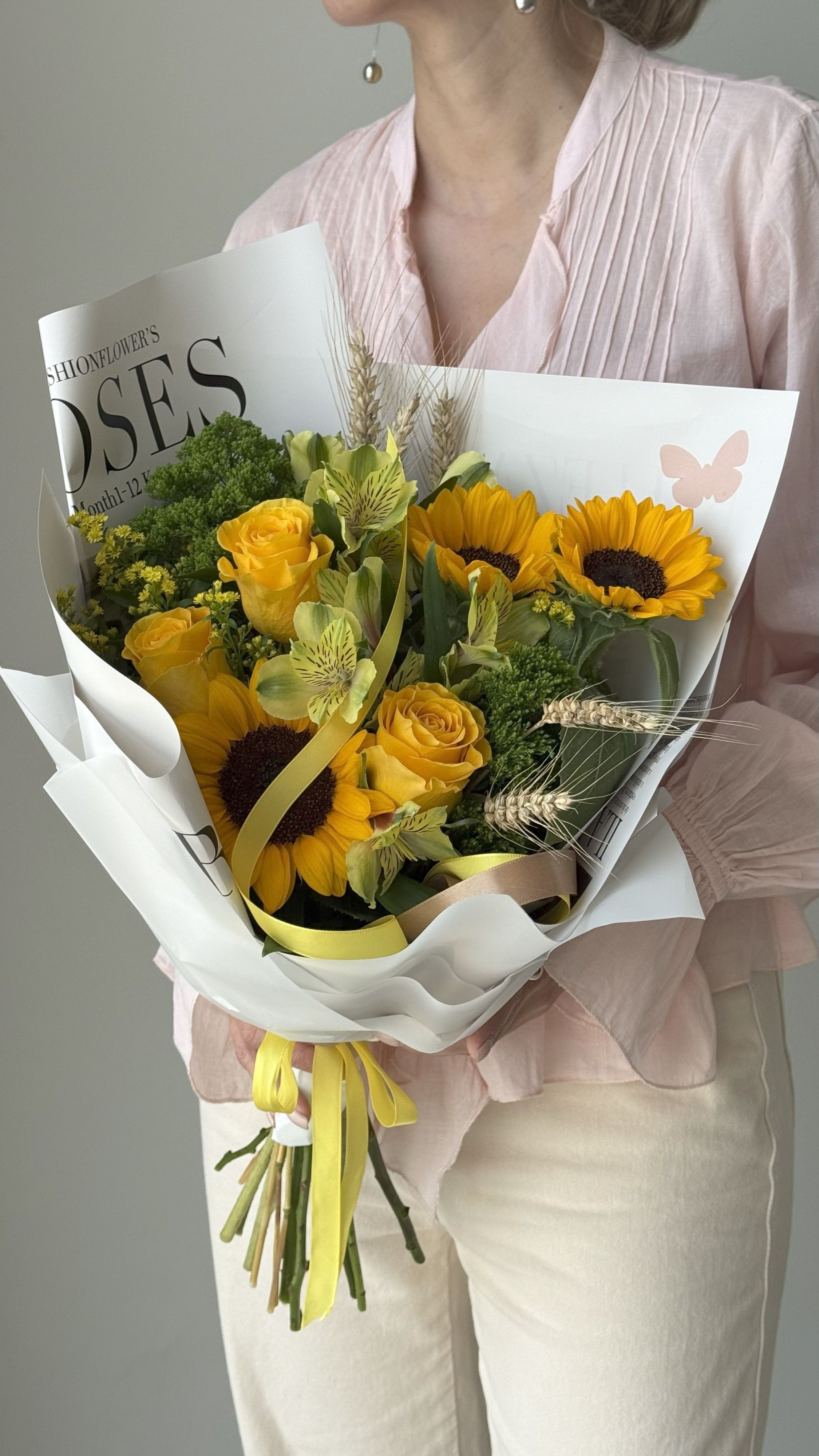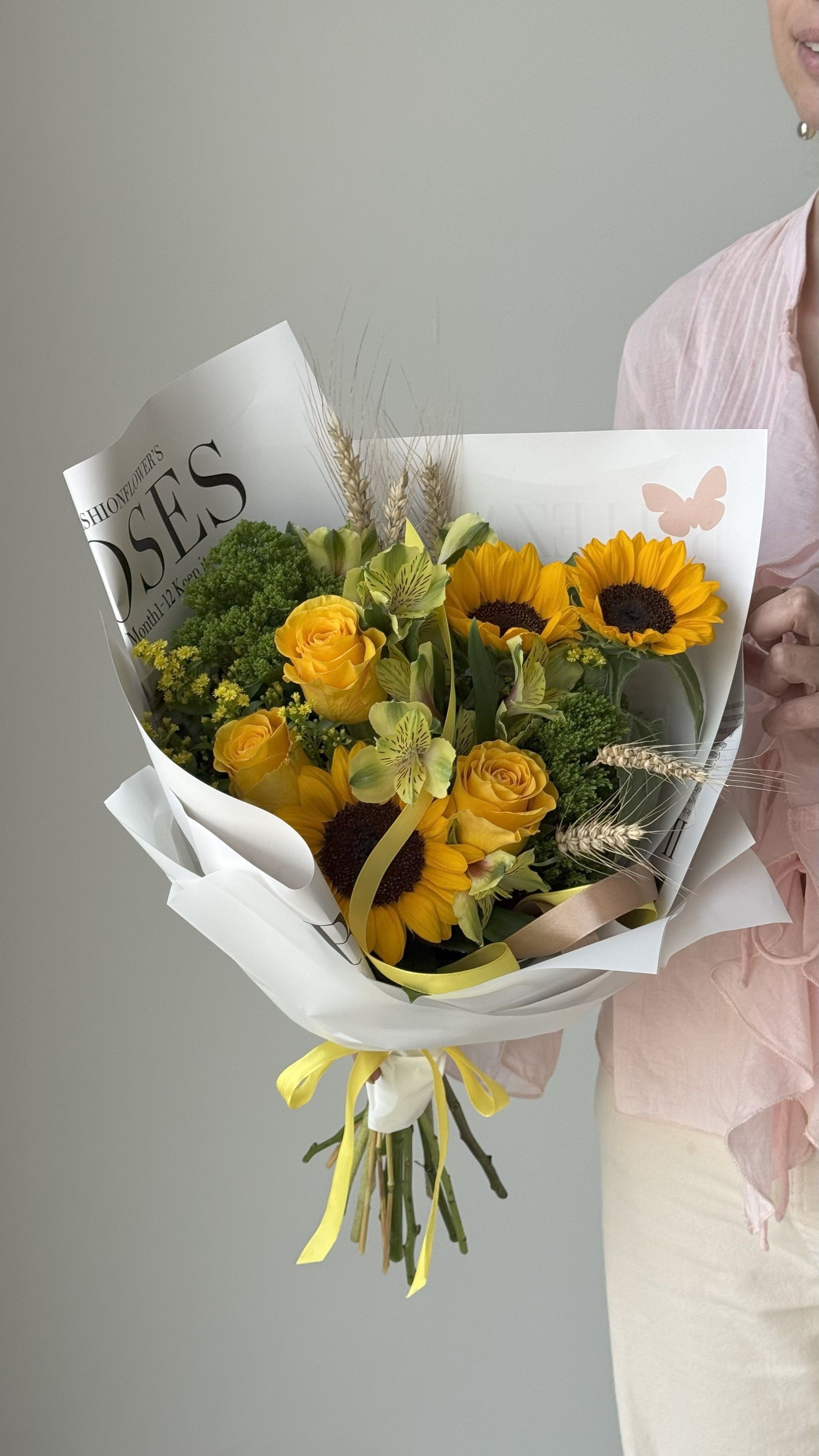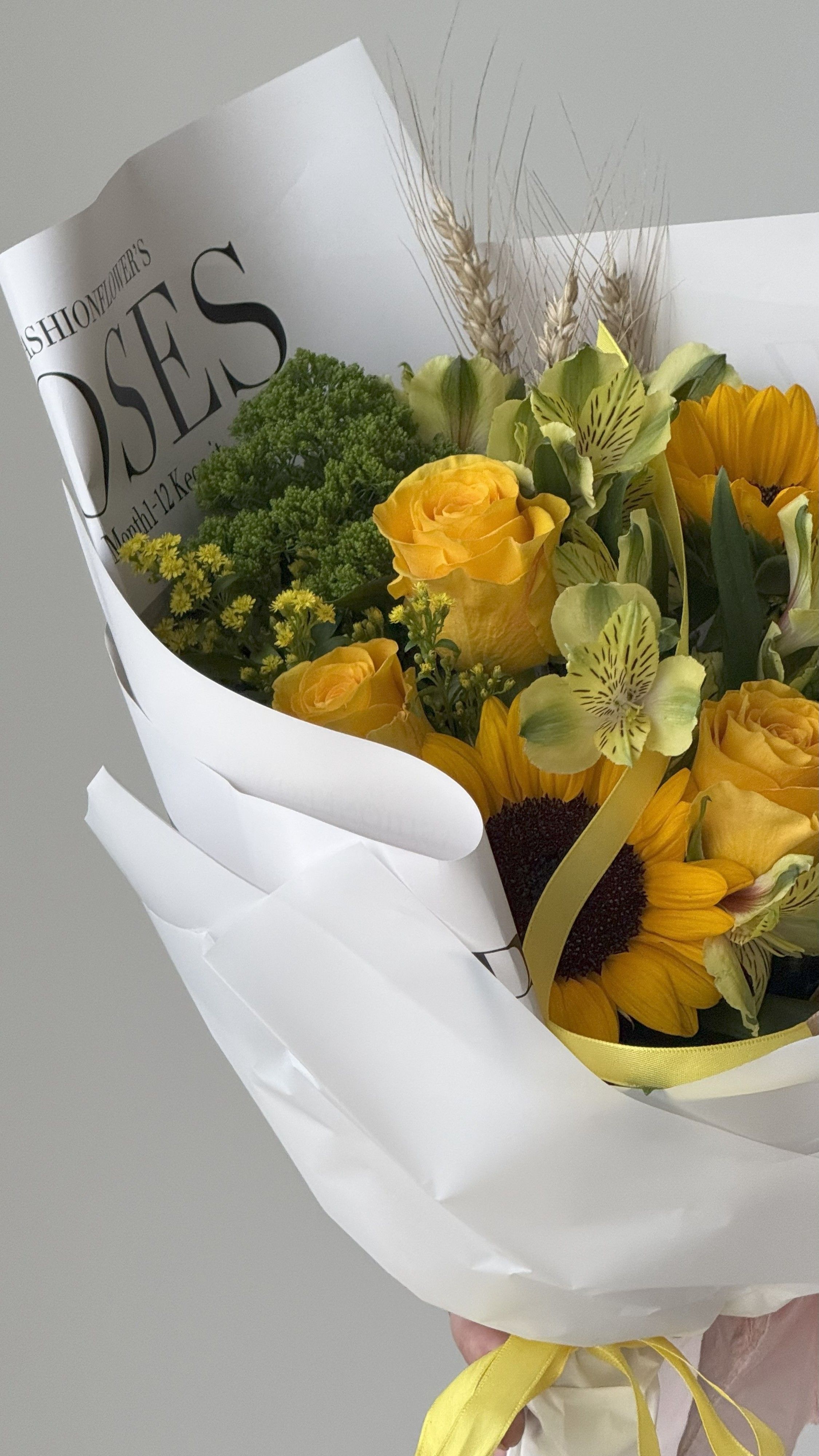 Дарите свет, как дарите его вы! Этот букет — как утро 1 сентября: сияющие подсолнухи-гелиантусы — ваше "классное солнце", благородные лимонные розы — глубина предмета, фиолетовые трахелиумы — мудрость опыта, лучи солидаго — энергия открытий, а трепетная альстромерия и фактурные сухоцветы напомнят о вечной ценности знаний. Пусть ваш труд цветет яркими красками!