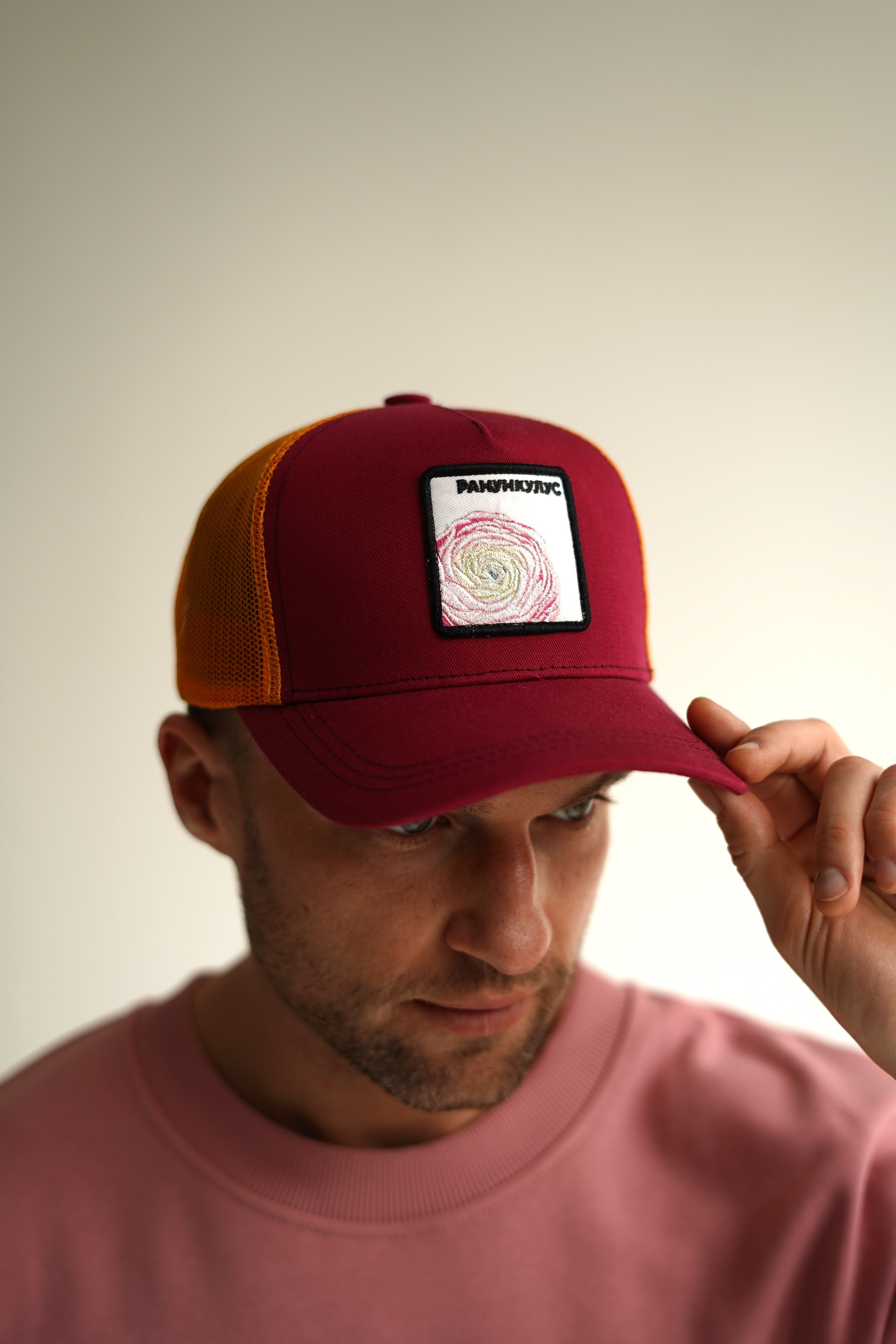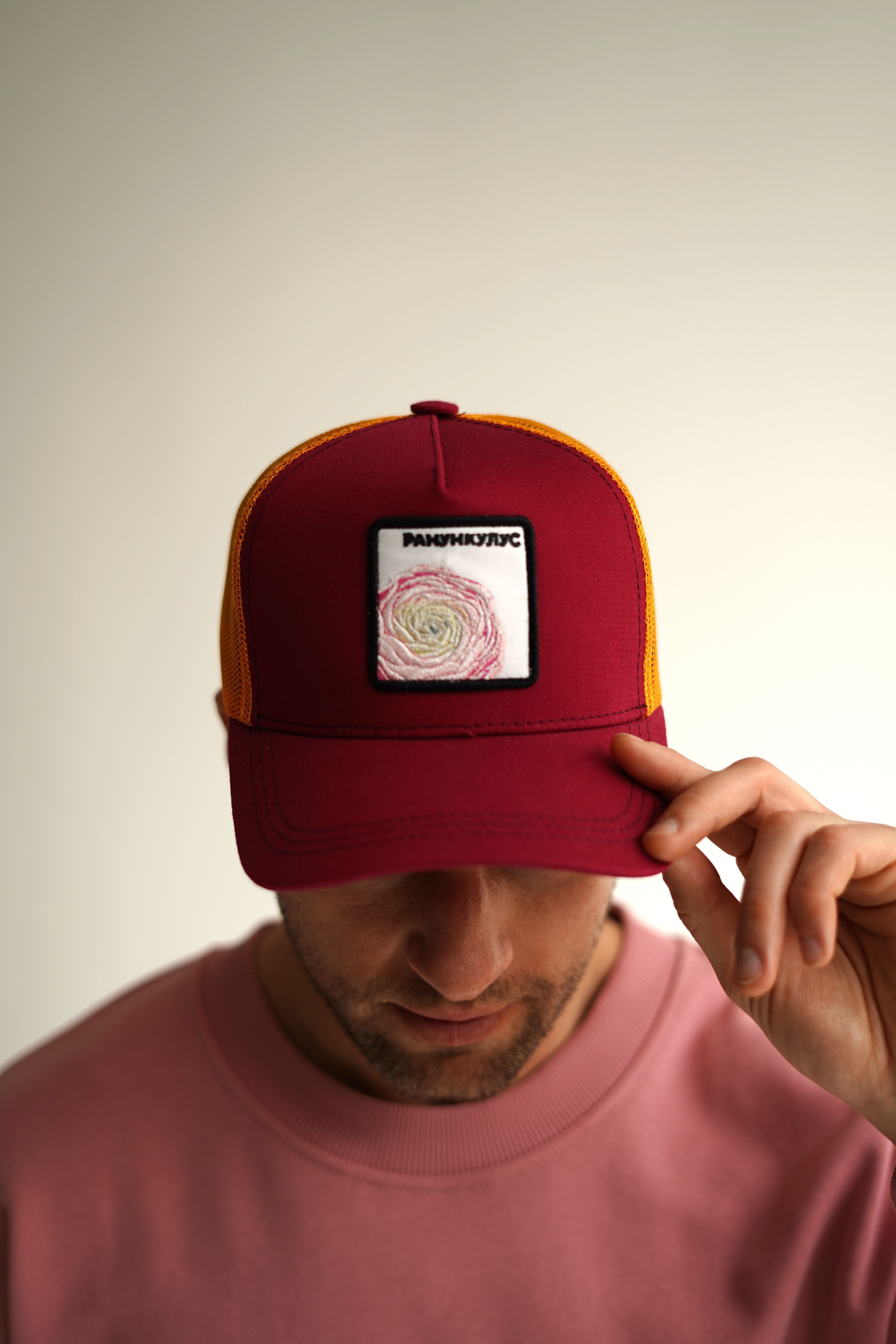 Уникальные элементы - фирменный логотип, приятная ткань и нестандартные форматы размещения бренда на кепке, вышитое изображение цветка
